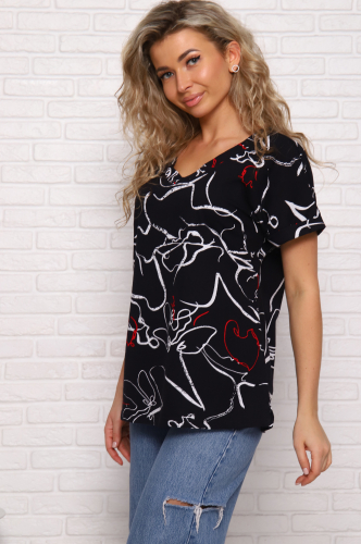 Стильная хлопковая женская футболка. Модель удлинённая, свободного прямого кроя, с цельнокроеным рукавом на манжетах.Глубокий, стильный и очень изящный вырез "галочкой" подчеркнёт зону декольте и сделает образ привлекательным и женственным. Футболка подойдёт к джинсам, леггинсам, шортам или юбкам.
