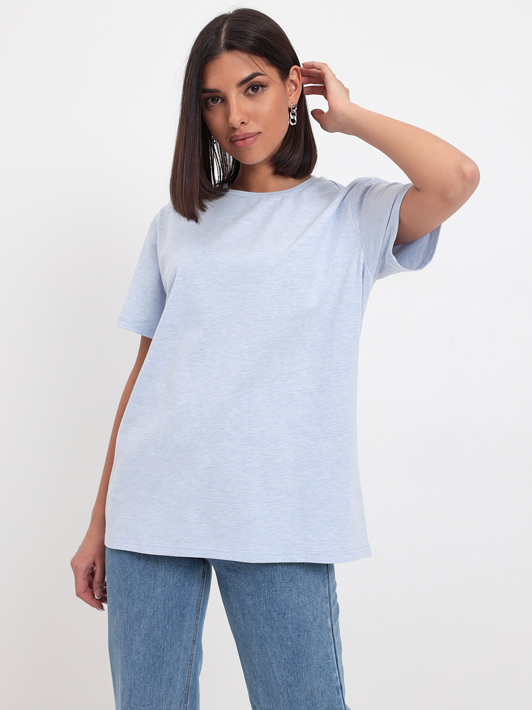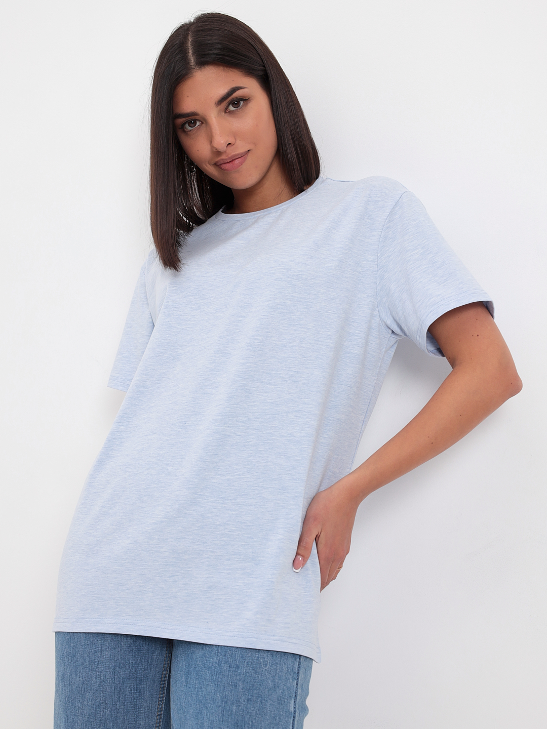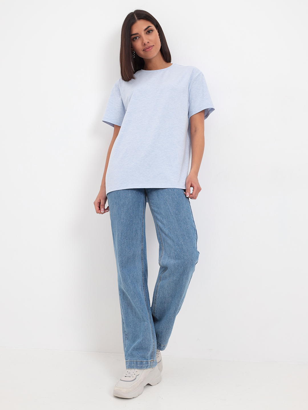 Цвет: Голубой Рисунок: Трикотаж о..показатьднотонный меланжевый Состав: 95% хлопок 5% эластан Модель: Прямая Ворот: Круглый Силуэт: Прямой силуэт / Сlassic fitднотонный меланжевый