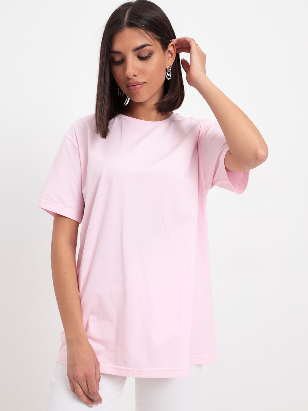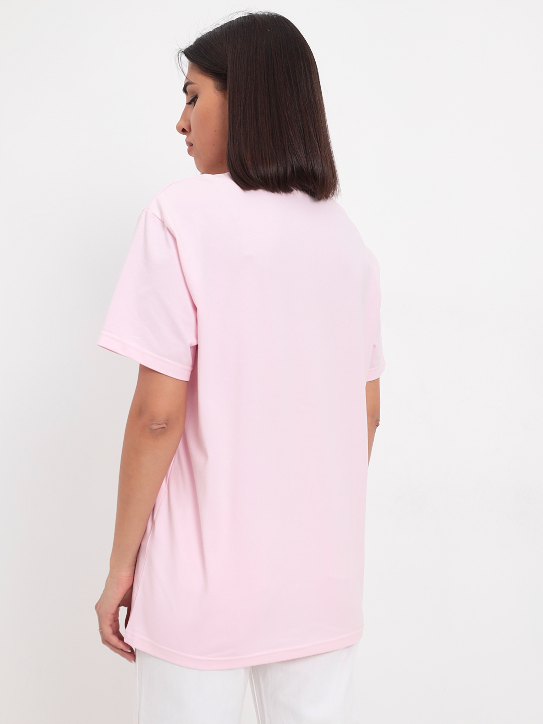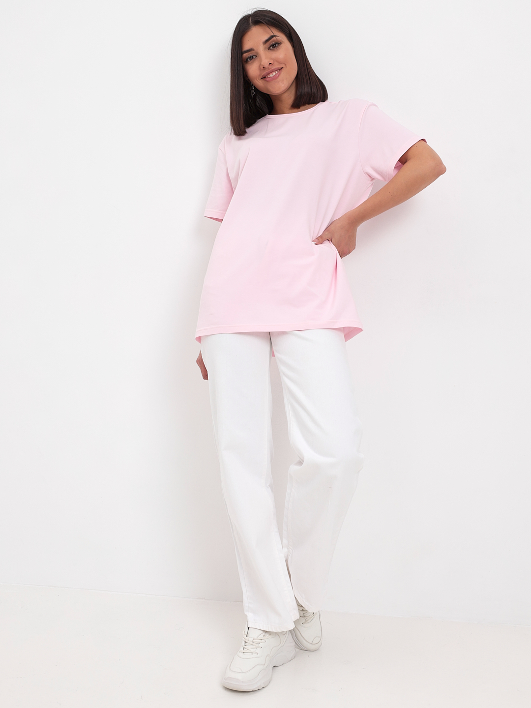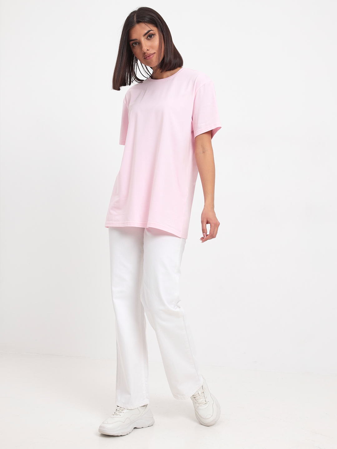 Цвет: Розовый Рисунок: Без рисунк..показатьа Состав: 95% хлопок 5% эластан Модель: Прямая Ворот: Круглый Силуэт: Прямой силуэт / Сlassic fitа