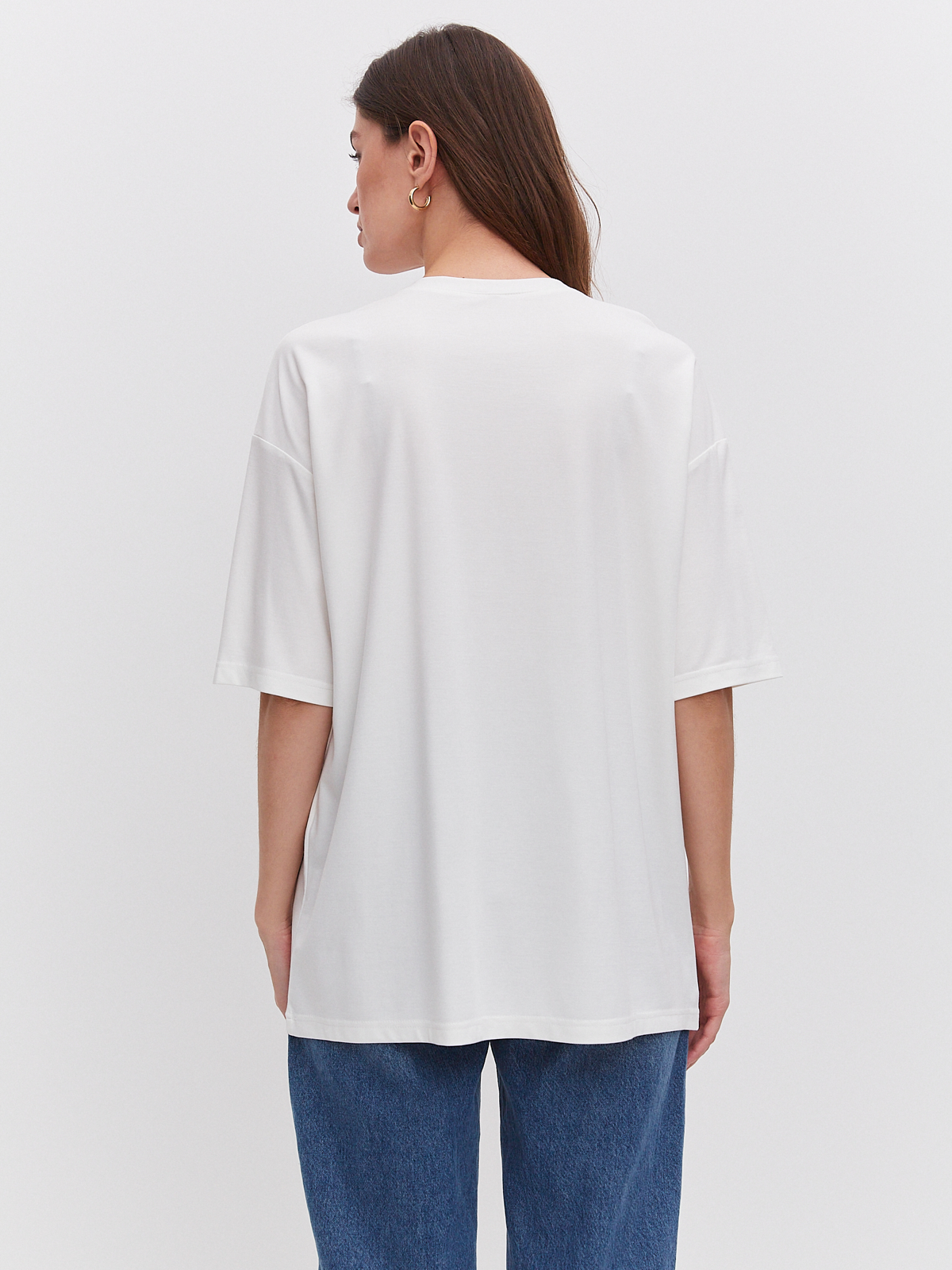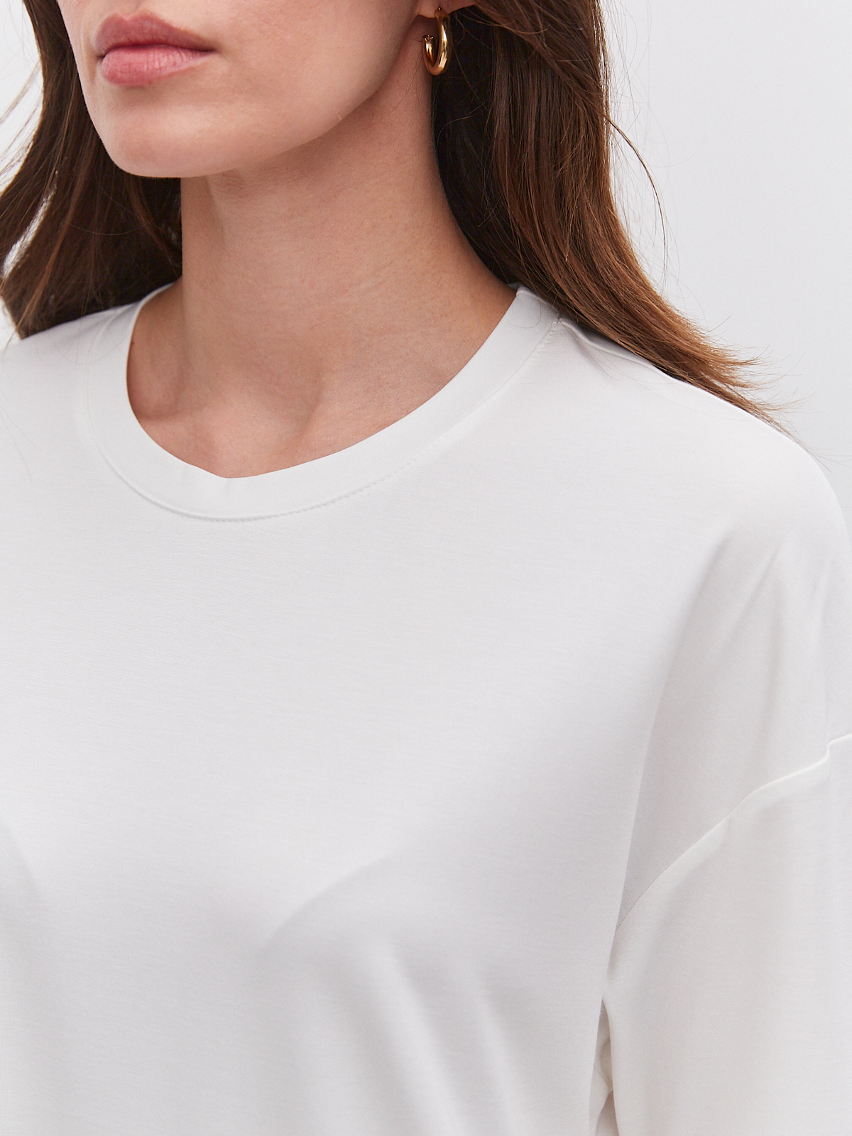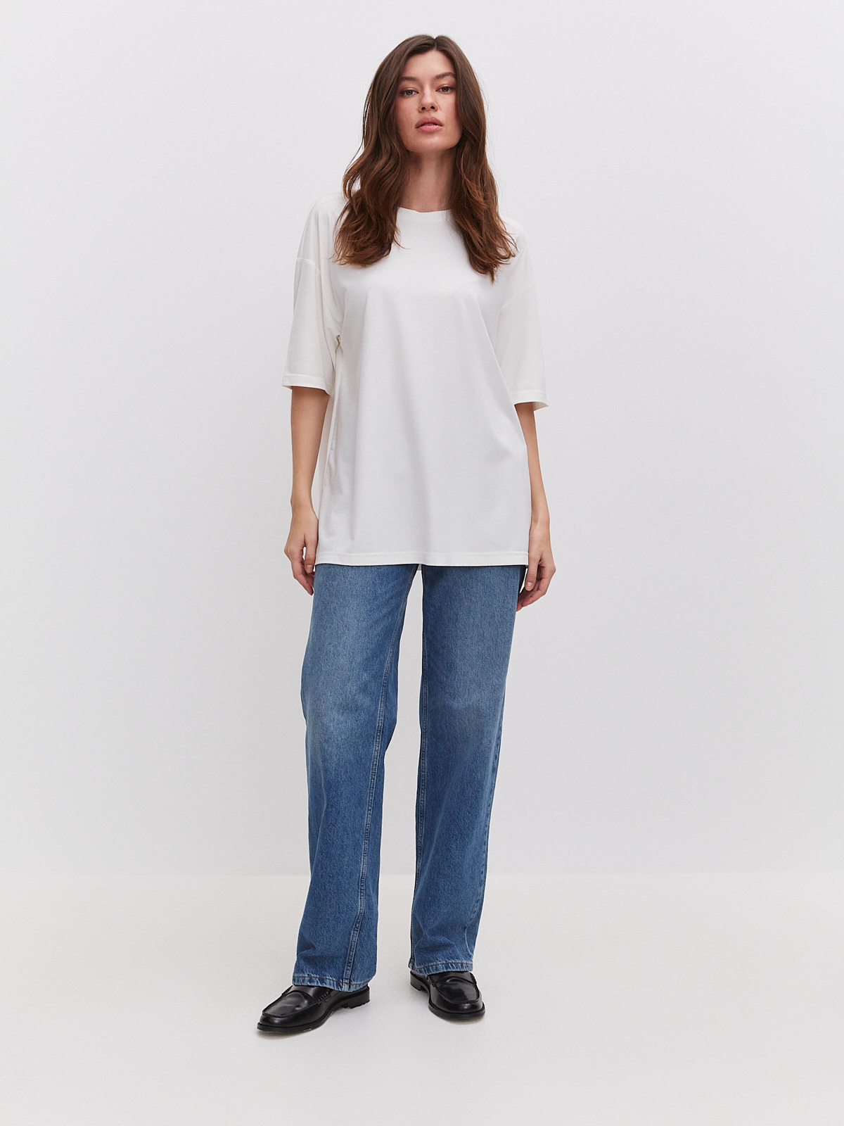 Цвет: Молочный Рисунок: Без рисун..показатька Состав: 60%вискоза 31%нейлон 9%эластан Модель: Оверсайз Ворот: Круглый Силуэт: Прямой силуэт / Сlassic fitка
