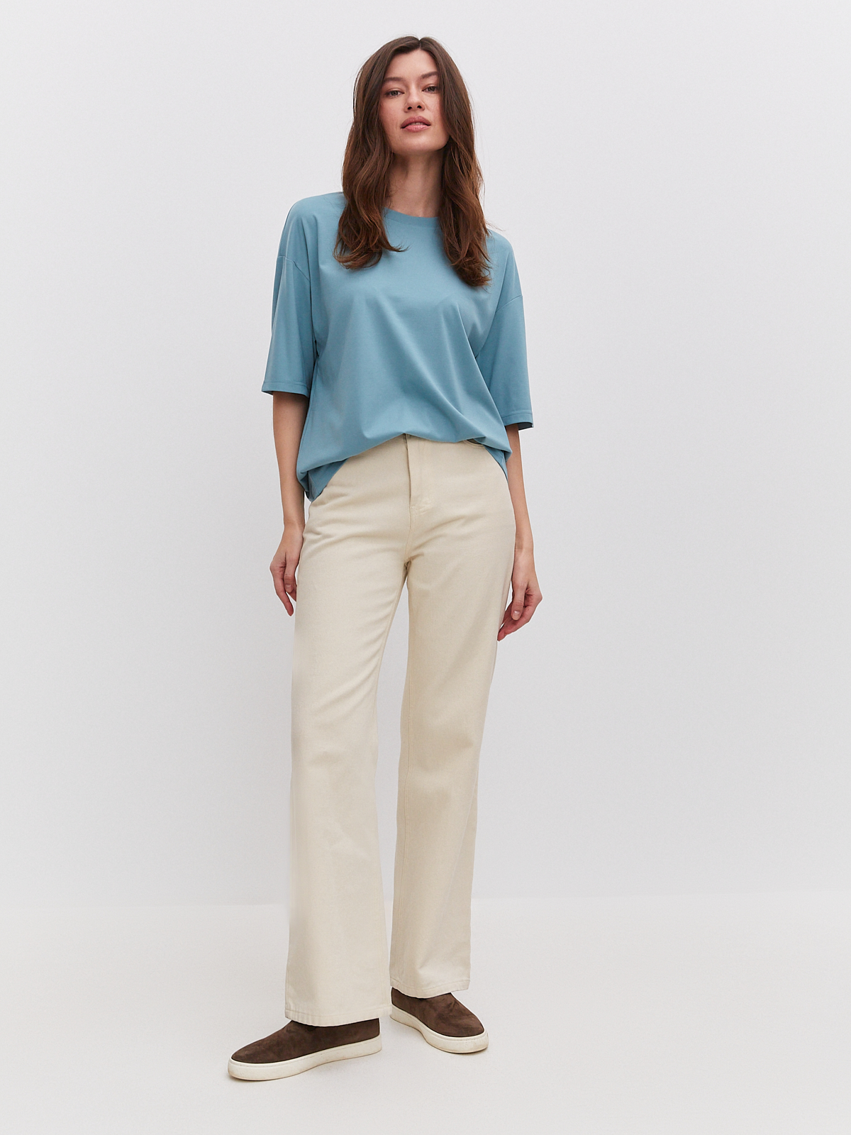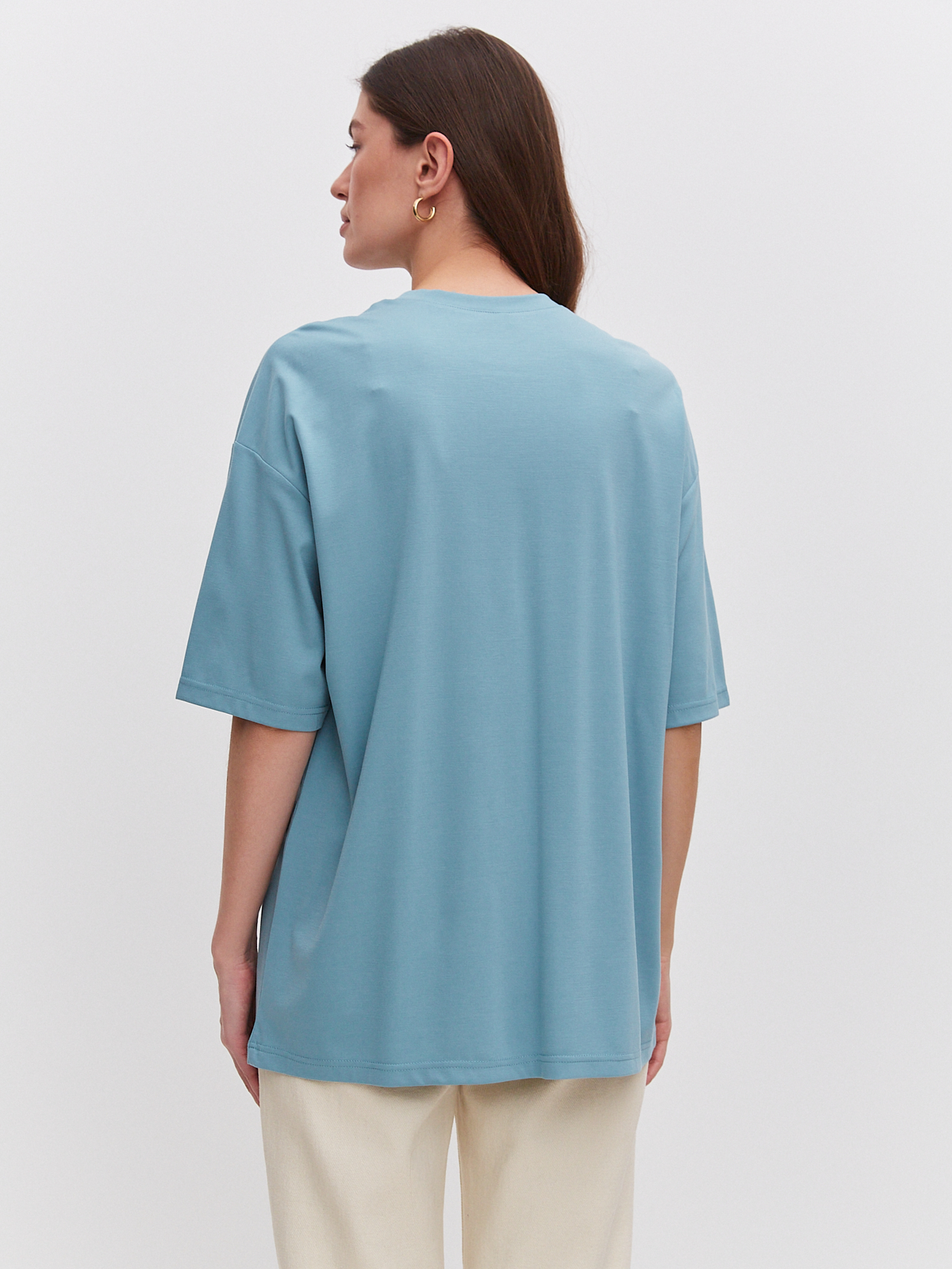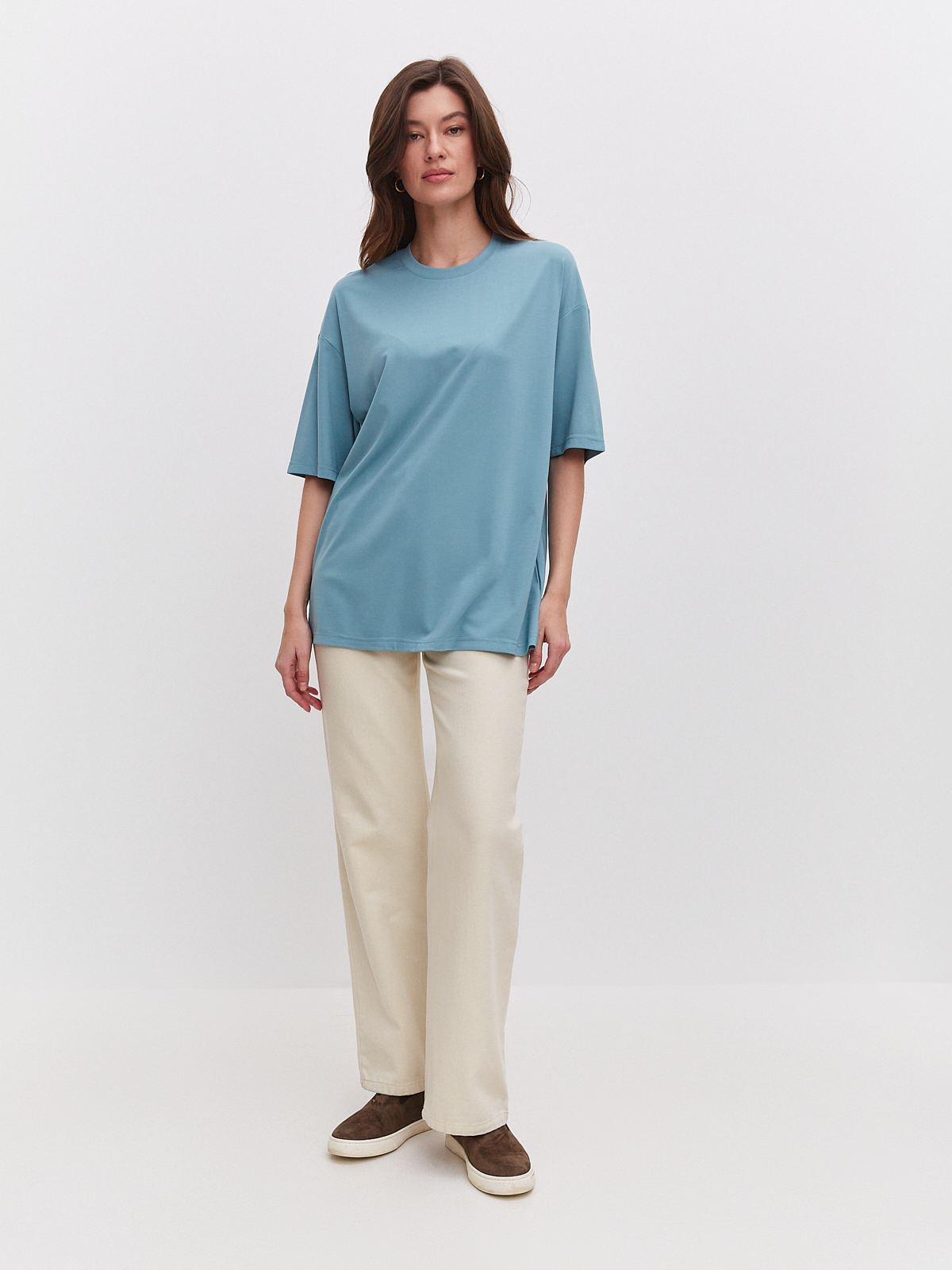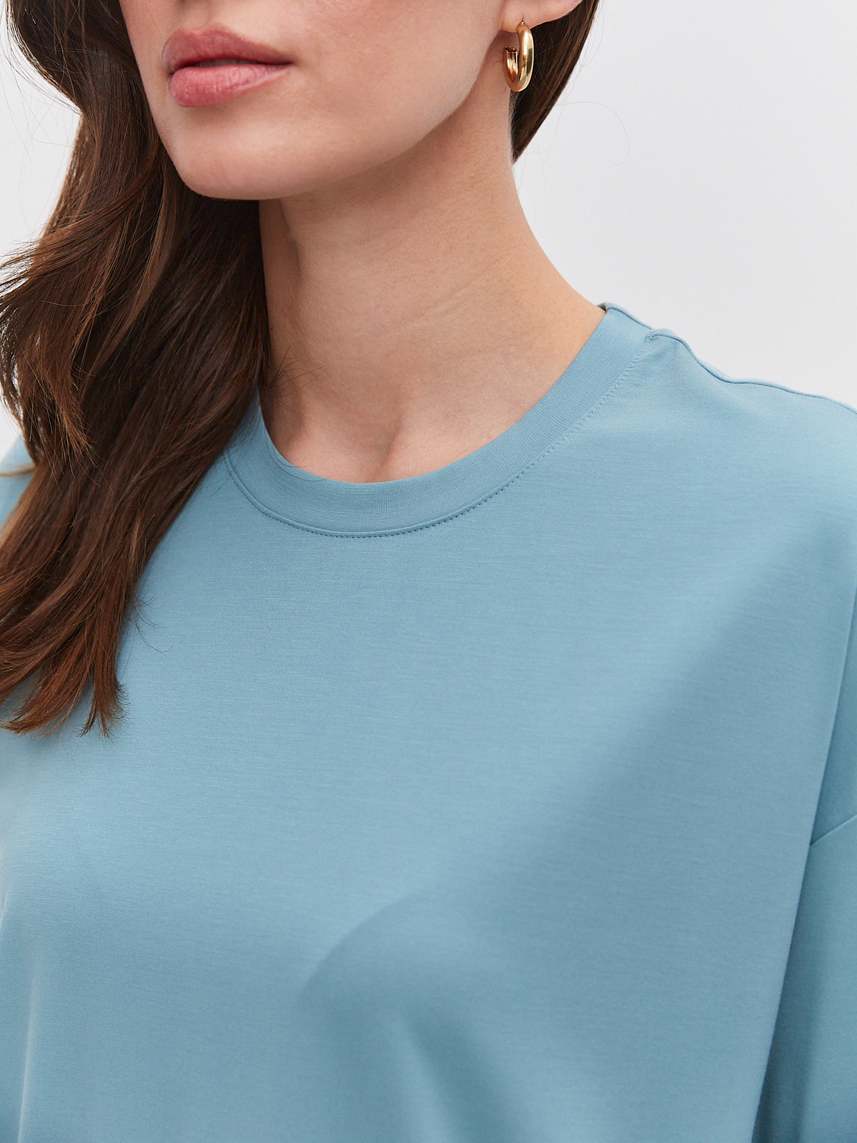 Цвет: Голубой Рисунок: Без рисунк..показатьа Состав: 60%вискоза 31%нейлон 9%эластан Модель: Оверсайз Ворот: Круглый Силуэт: Свободный силуэт / Оversizeа
