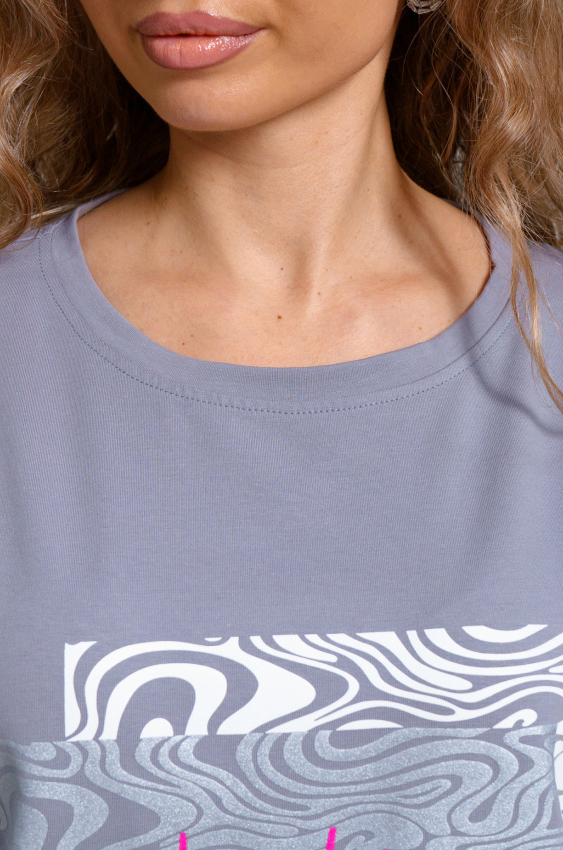 Женская футболка с цельнокроеным рукавом на манжете. Стильный принт на полочке придает ей оригинальность и выделяет на фоне однообразных вещей.