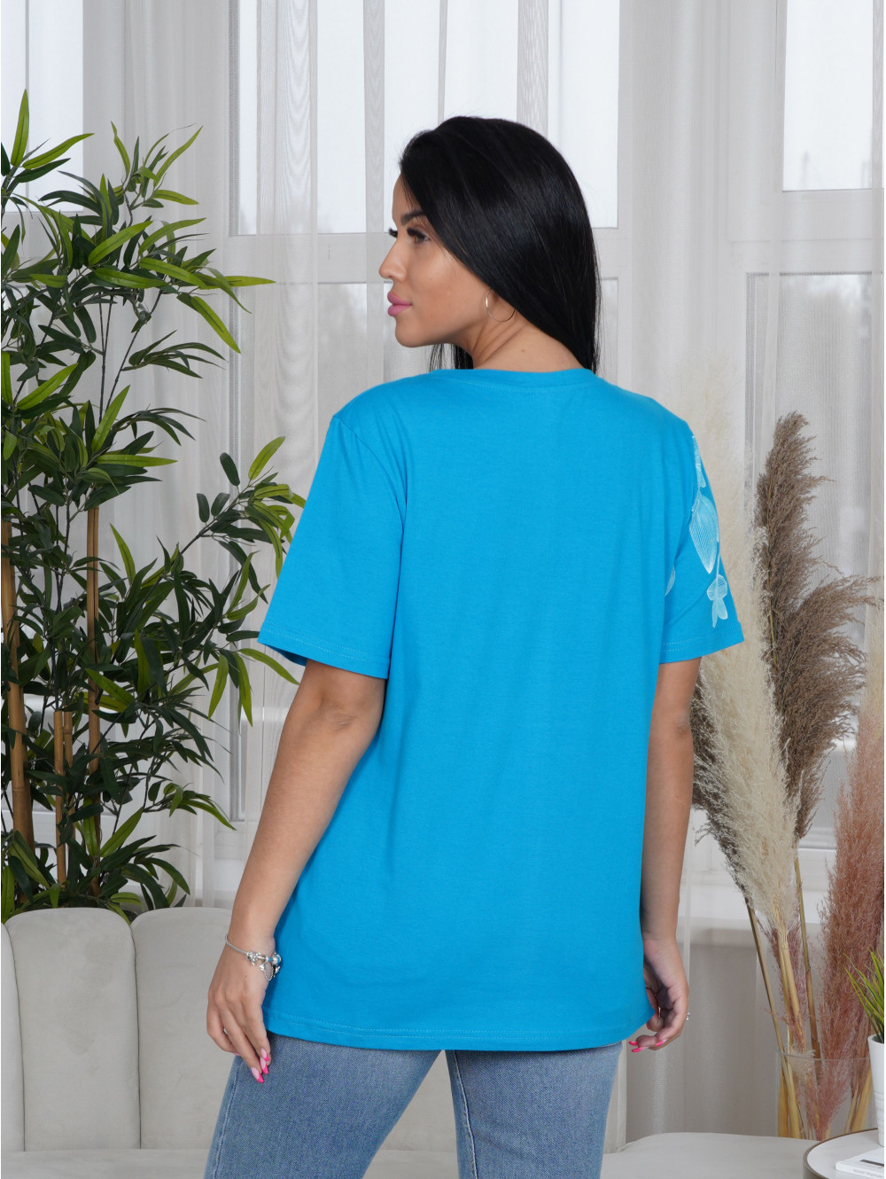 Футболка давно стала неотъемлемой частью базового гардероба многих женщин. Удобная и во многом универсальная вещь не только идеально дополняет комплекты одежды спортивного и повседневного стилей, но и отлично комбинируется со строгими, классическими нарядами. Представляем Вам нашу футболку ЛИРИКА ПЛЮС, изготовленную из экологически чистого сырья, которое имеет высокую воздухопроницаемость, хорошо впитывает влагу. Нежный принт на рукаве и полочке добавит романтики в Ваш образ. Большие размеры порадуют дам с пышными формами.