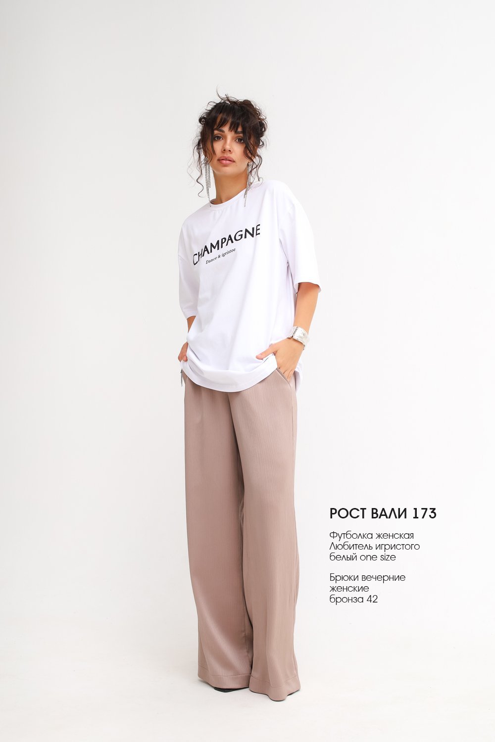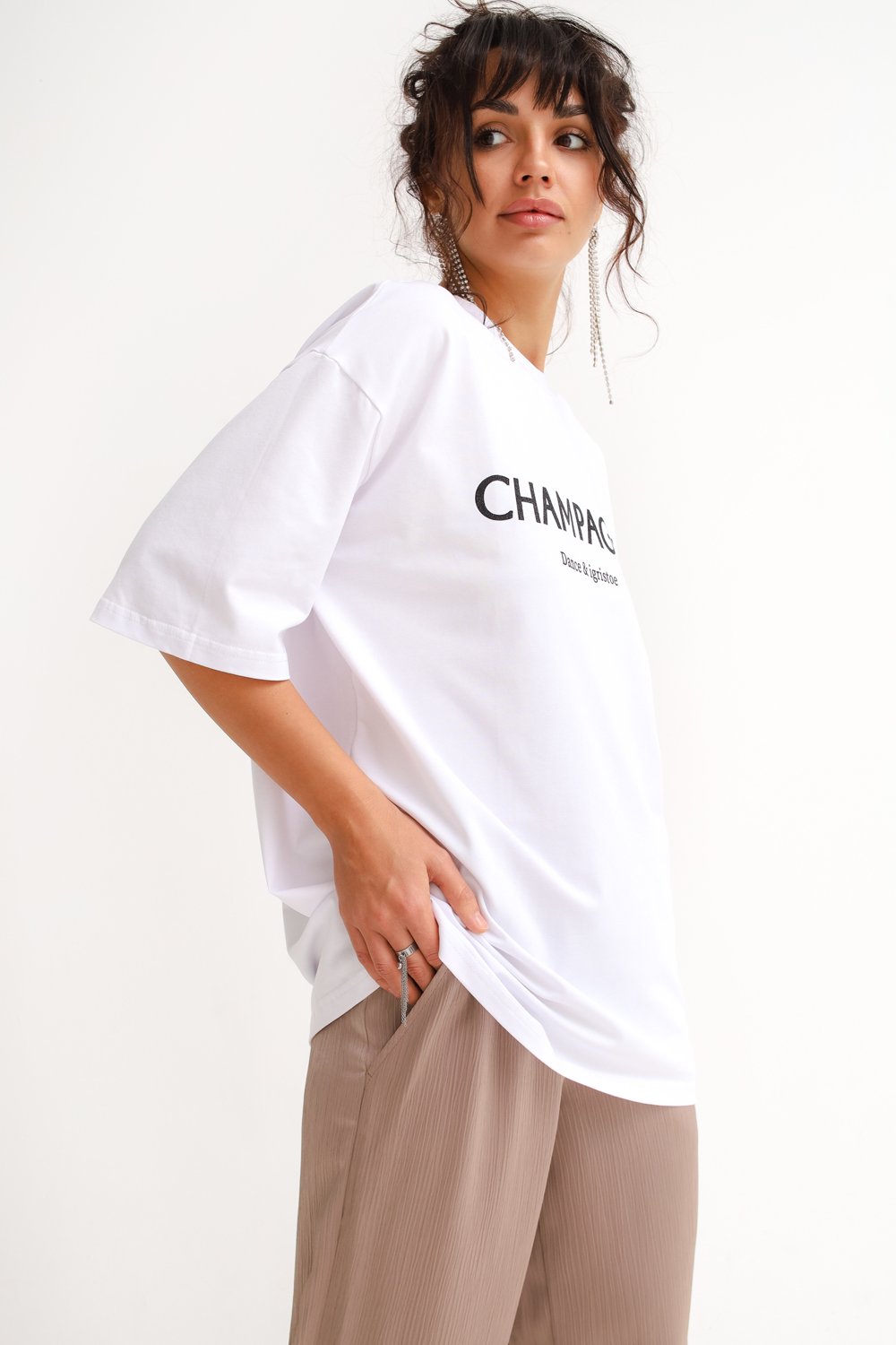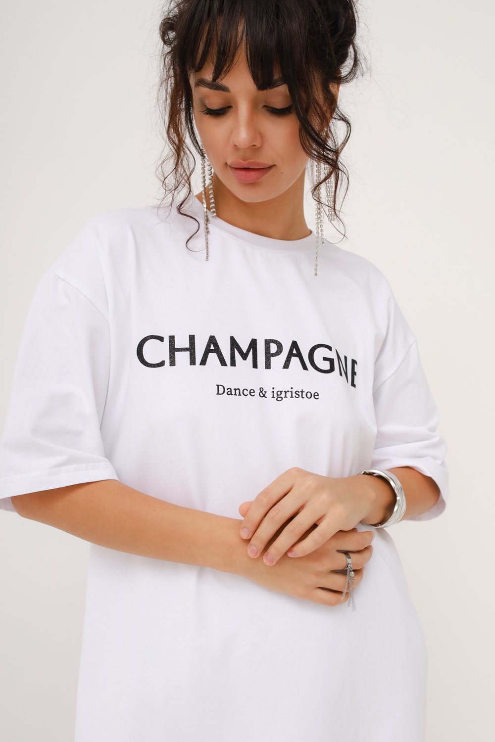 Футболка свободного силуэта с округлым вырезом горловины. Удлиненный рукав, сверкающий принт.