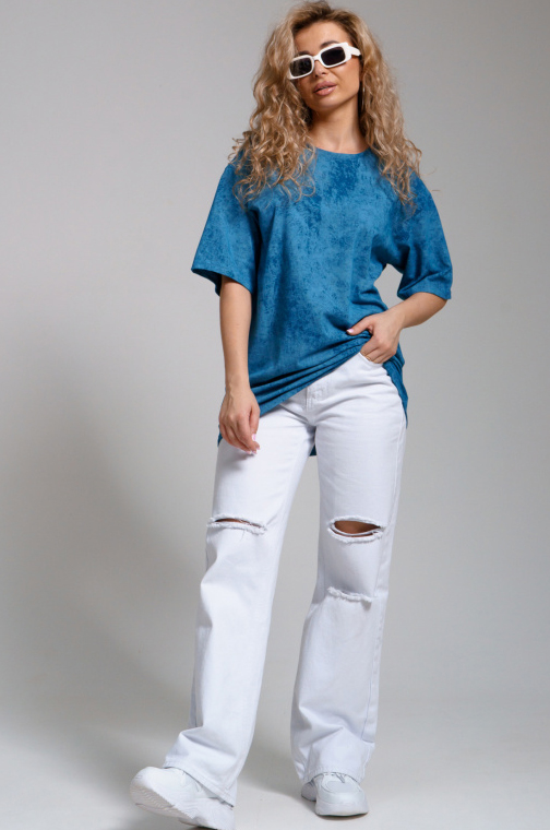 Стильная женская хлопковая футболка с эффектом варенки. Модель оверсайз, удлинённая, свободного прямого кроя, со спущенным рукавом. Ее можно легко сочетать с различными стилями одежды.