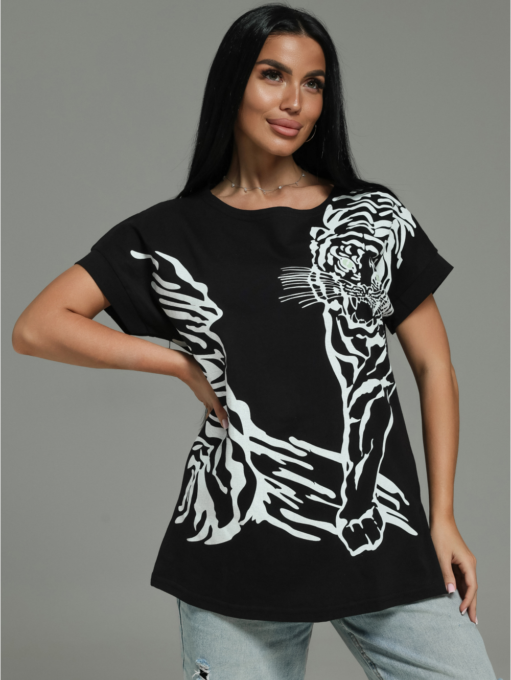 Футболка с цельнокроеным рукавом, выполнена из хлопкового материала кулирка. Изделие украшено оригинальным принтом.