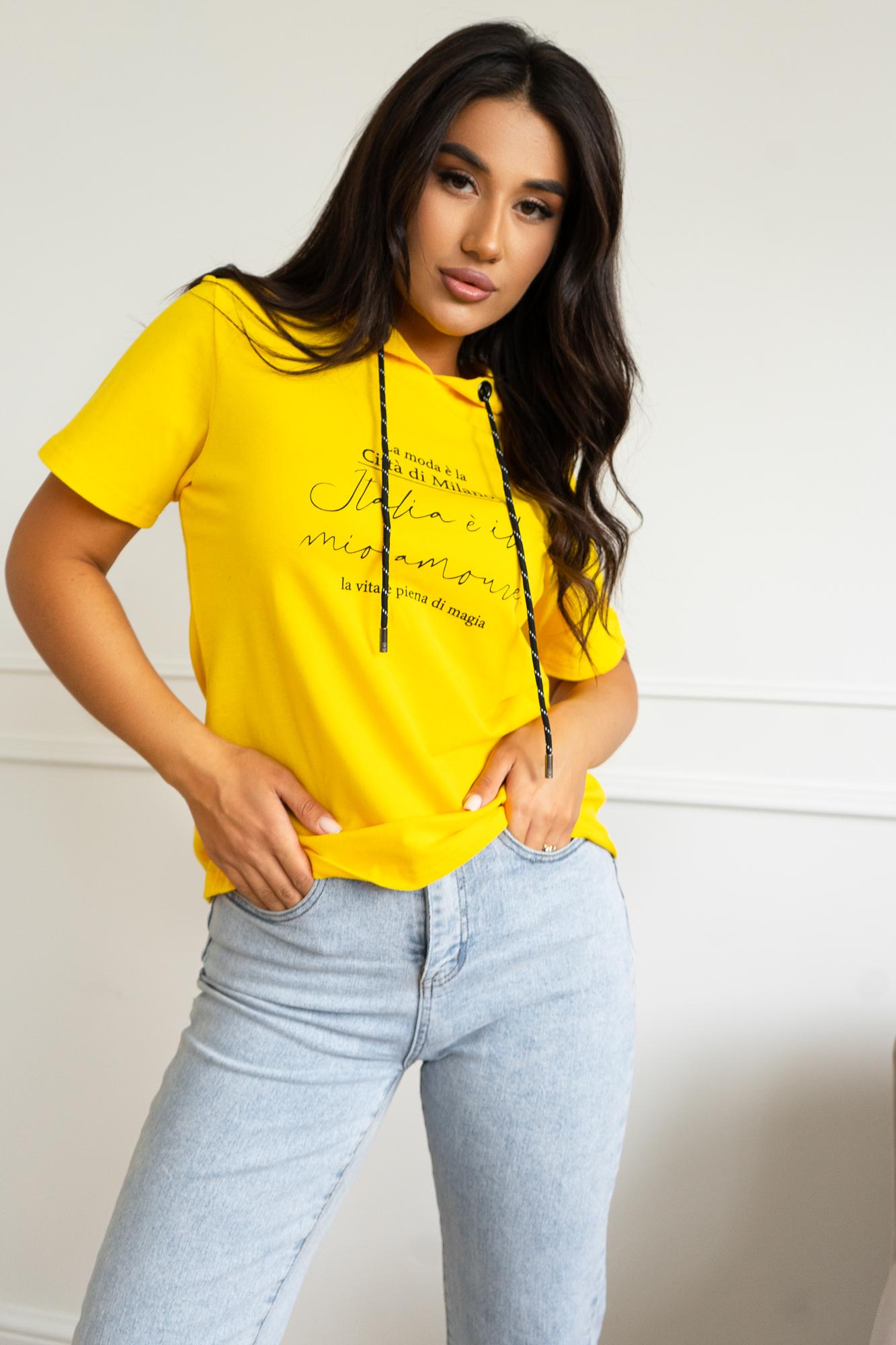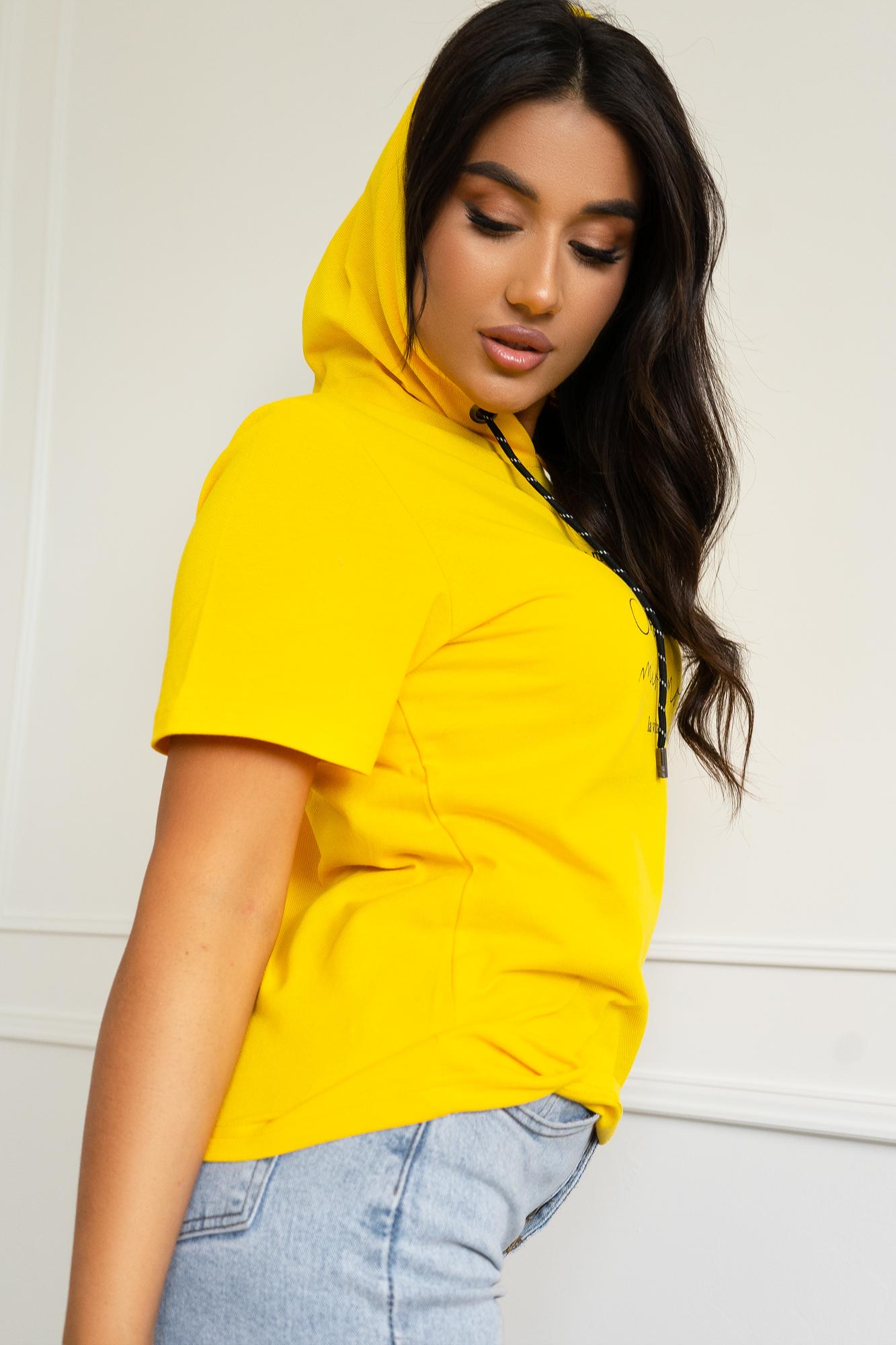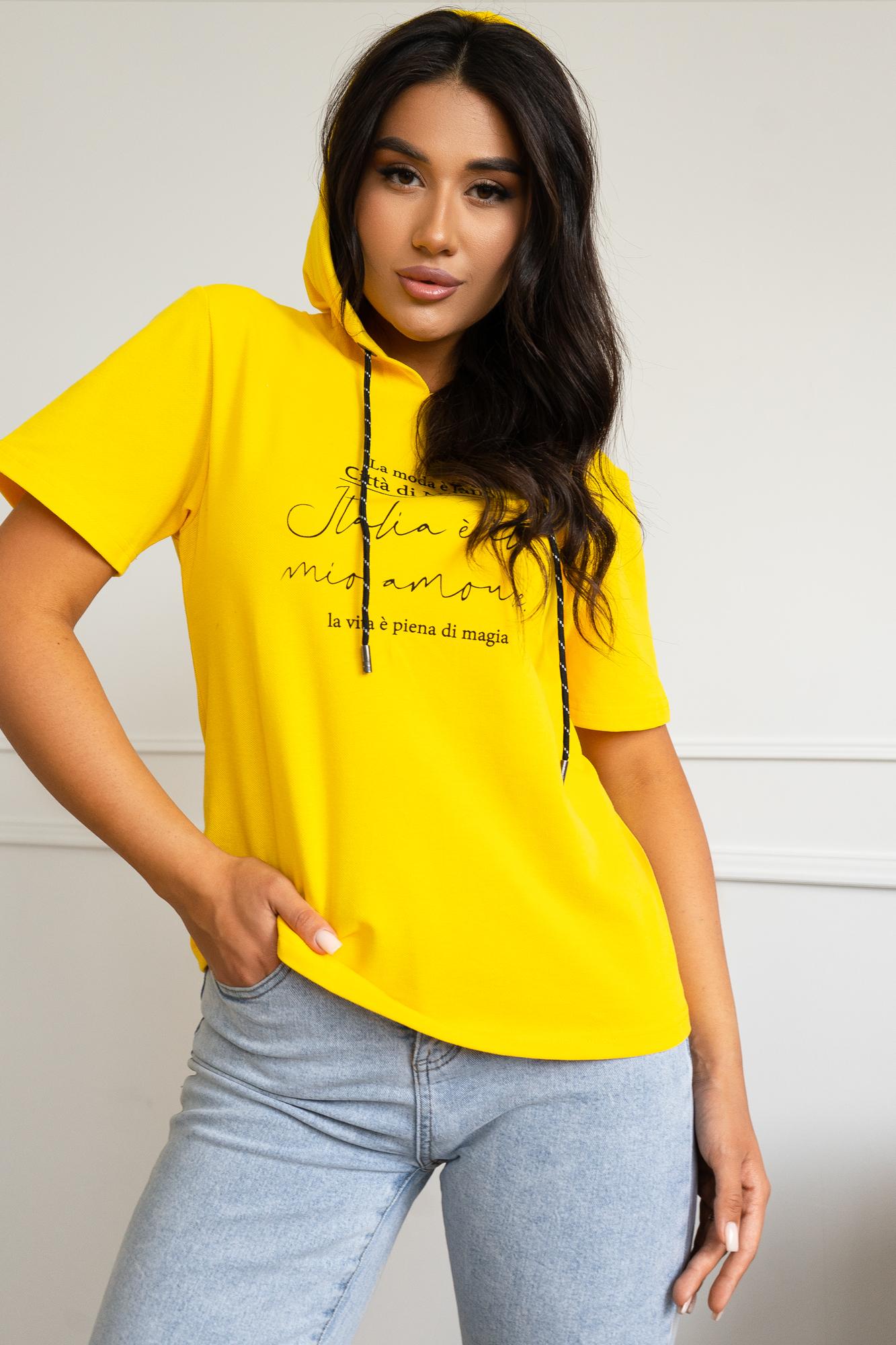 Спортивная футболка Трейси с капюшоном. Ткань Лакоста практична и удобна в повседневной носке. Футболка не мнется, пропускает воздух и максимально комфортна во время прогулок, занятий спортом или домашними делами. Стильная футболка с дизайнерским принтом и регулирующим шнурком выглядят модно и уникально.