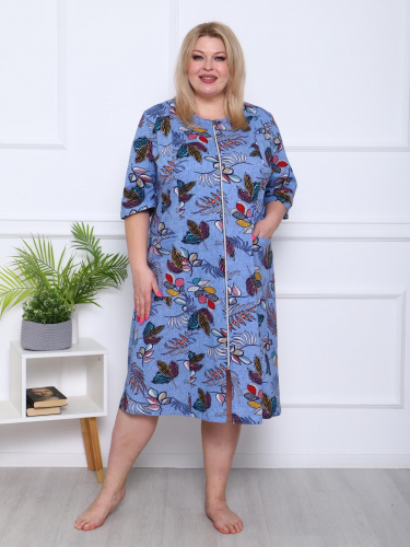 Прямой свободный крой позволяет скрыть недостатки фигуры и ощущать легкость во время домашнего отдыха. Халат домашний дополнен накладными карманами и стильной круглой горловиной.