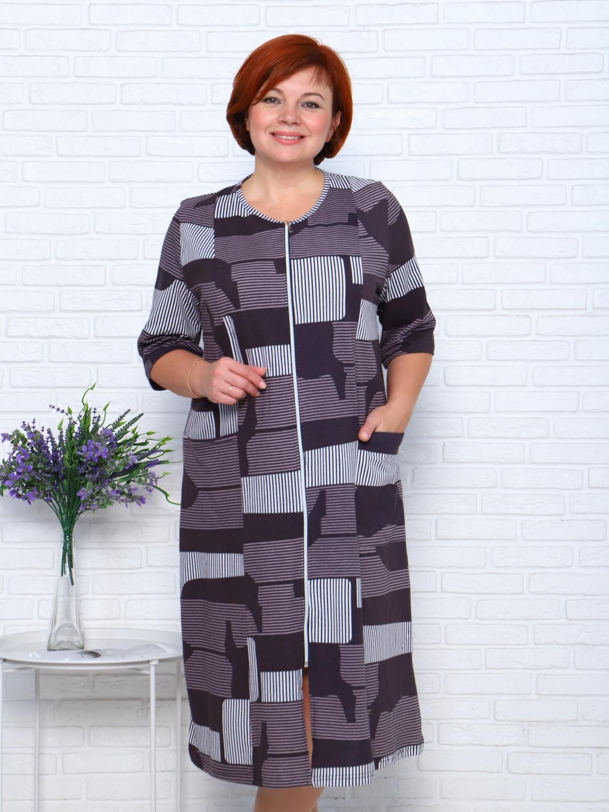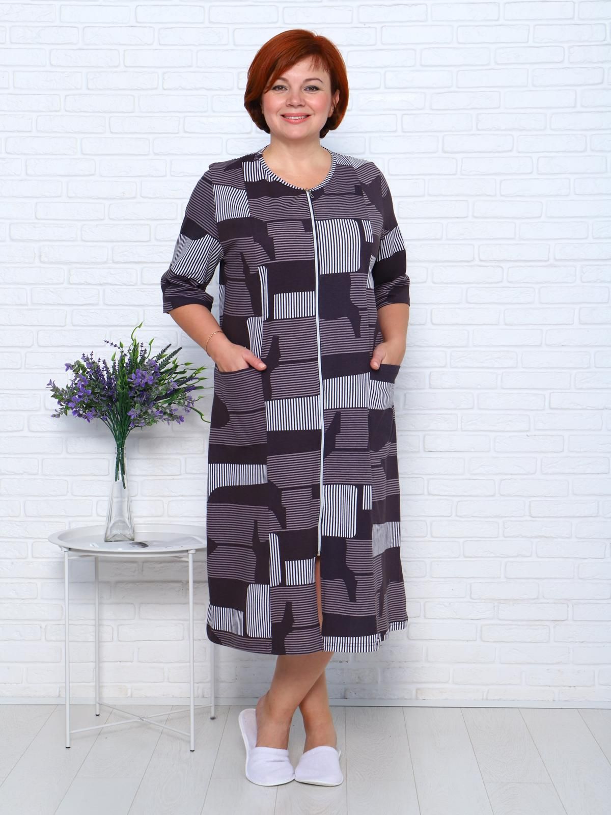 Прямой свободный крой позволяет скрыть недостатки фигуры и ощущать легкость во время домашнего отдыха. Халат домашний дополнен накладными карманами и стильной круглой горловиной.