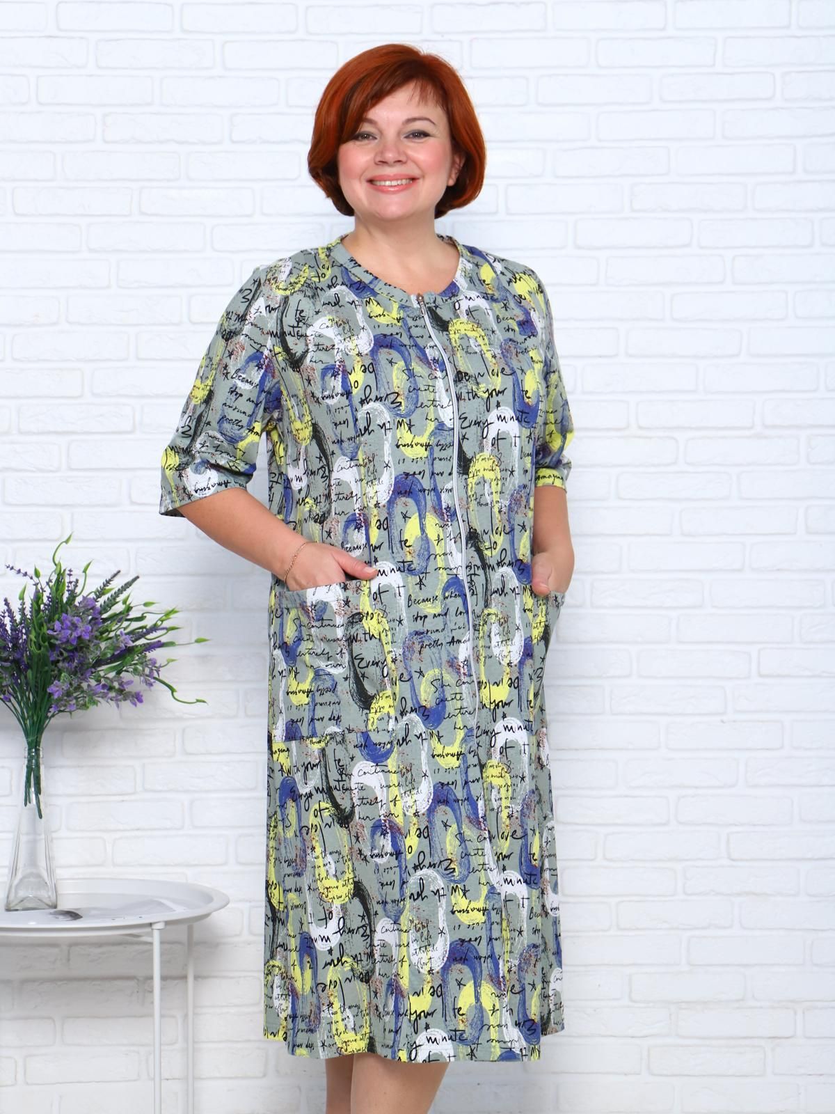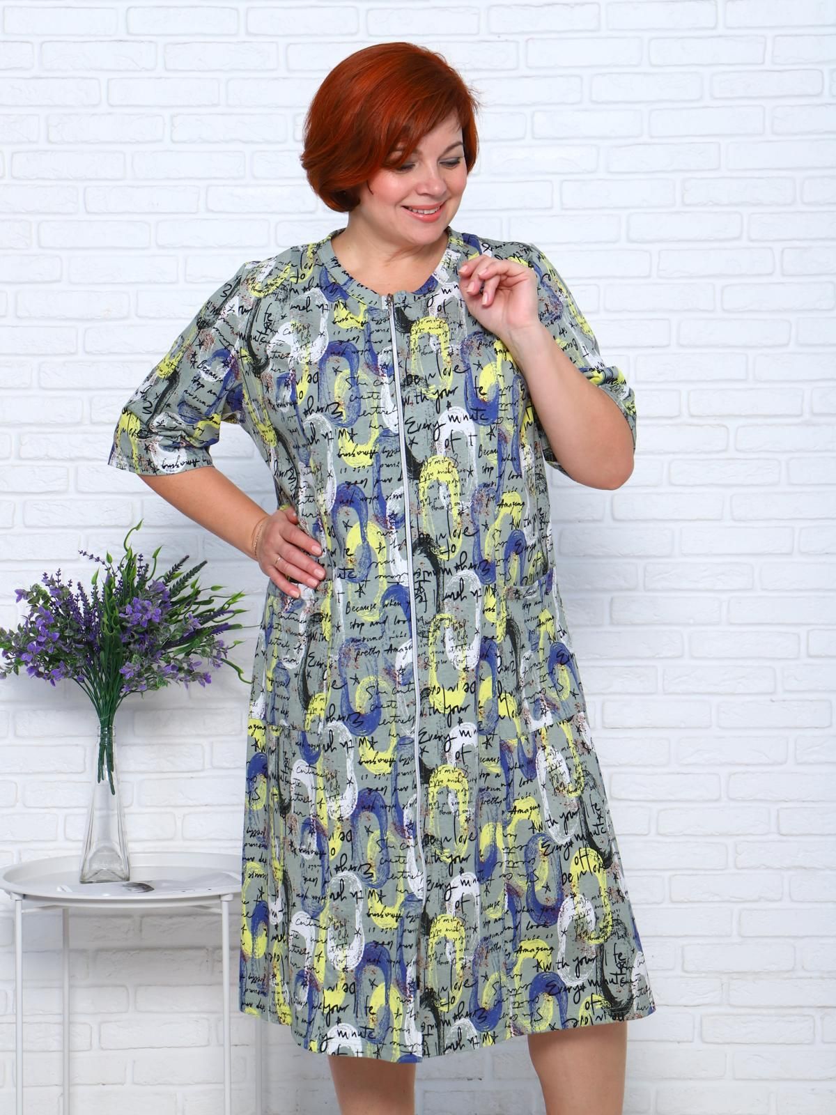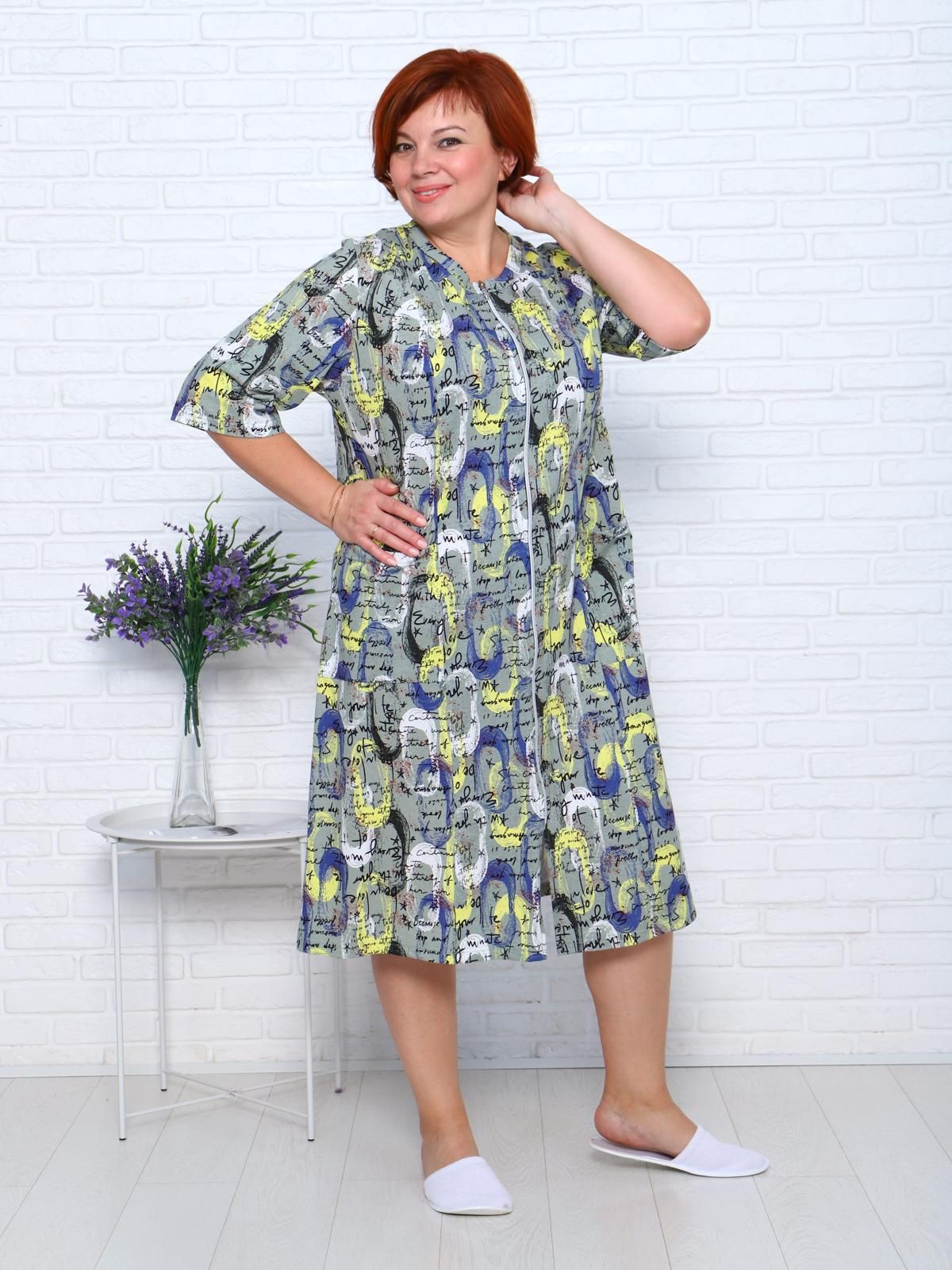 Прямой свободный крой позволяет скрыть недостатки фигуры и ощущать легкость во время домашнего отдыха. Халат домашний дополнен накладными карманами и стильной круглой горловиной.