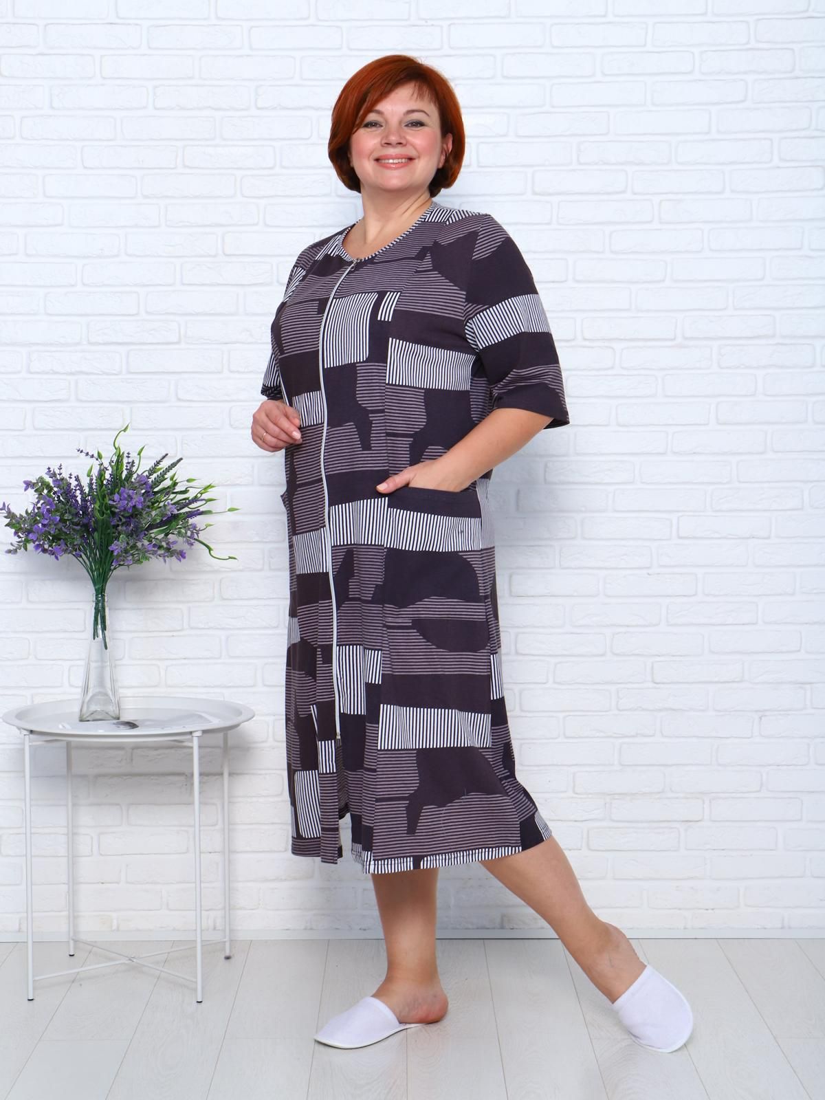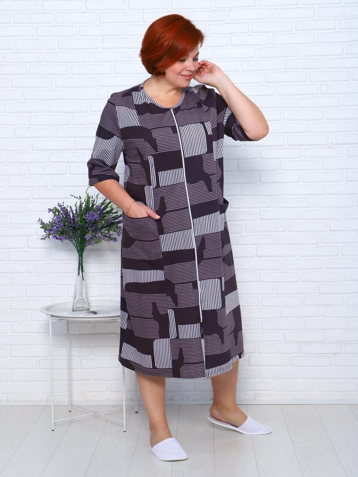 Прямой свободный крой позволяет скрыть недостатки фигуры и ощущать легкость во время домашнего отдыха. Халат домашний дополнен накладными карманами и стильной круглой горловиной.