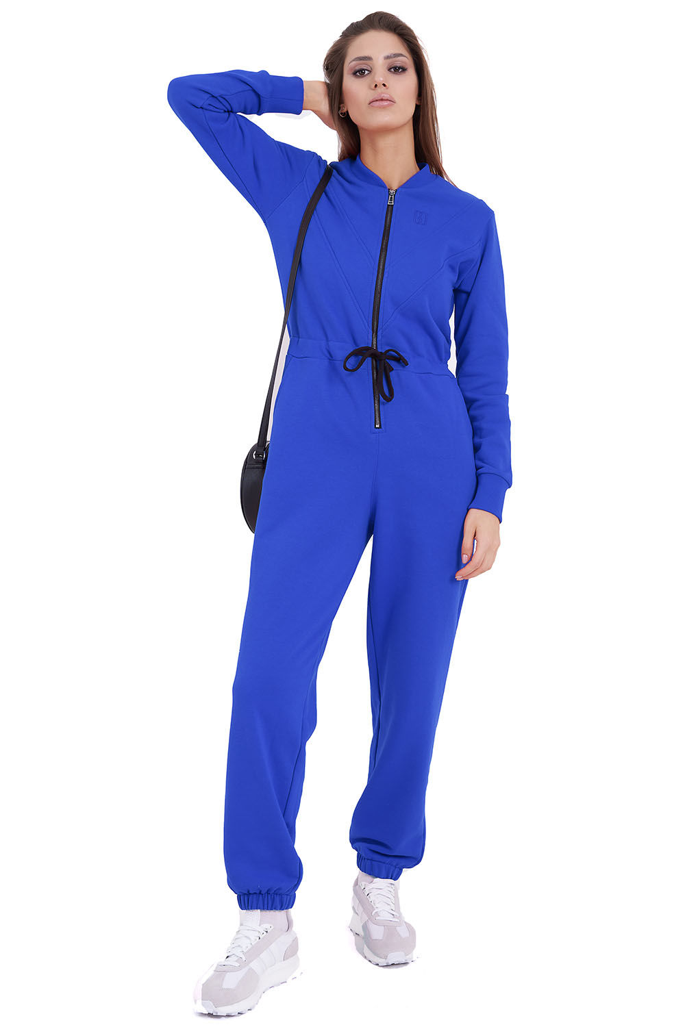 Комбинезон имеет застежку молнию по центру, с дизайнерскими треугольными подрезами и вышивку - логотип в цвет на левом переде. Силуэт приталенный  - за счет резинки по спинке и завязок на переде. Брюки заужены, с удобными боковыми карманами, низ брюк присобран на резинку