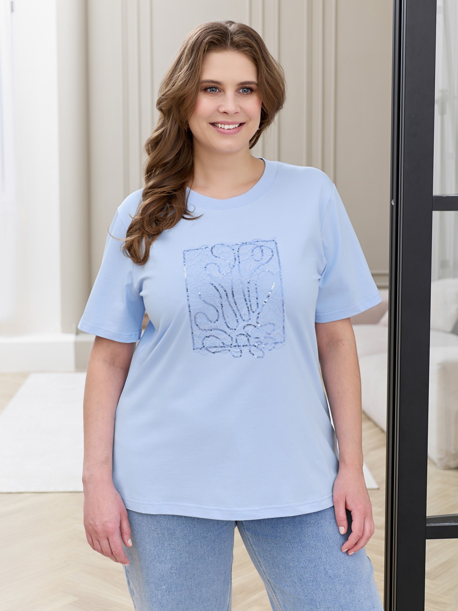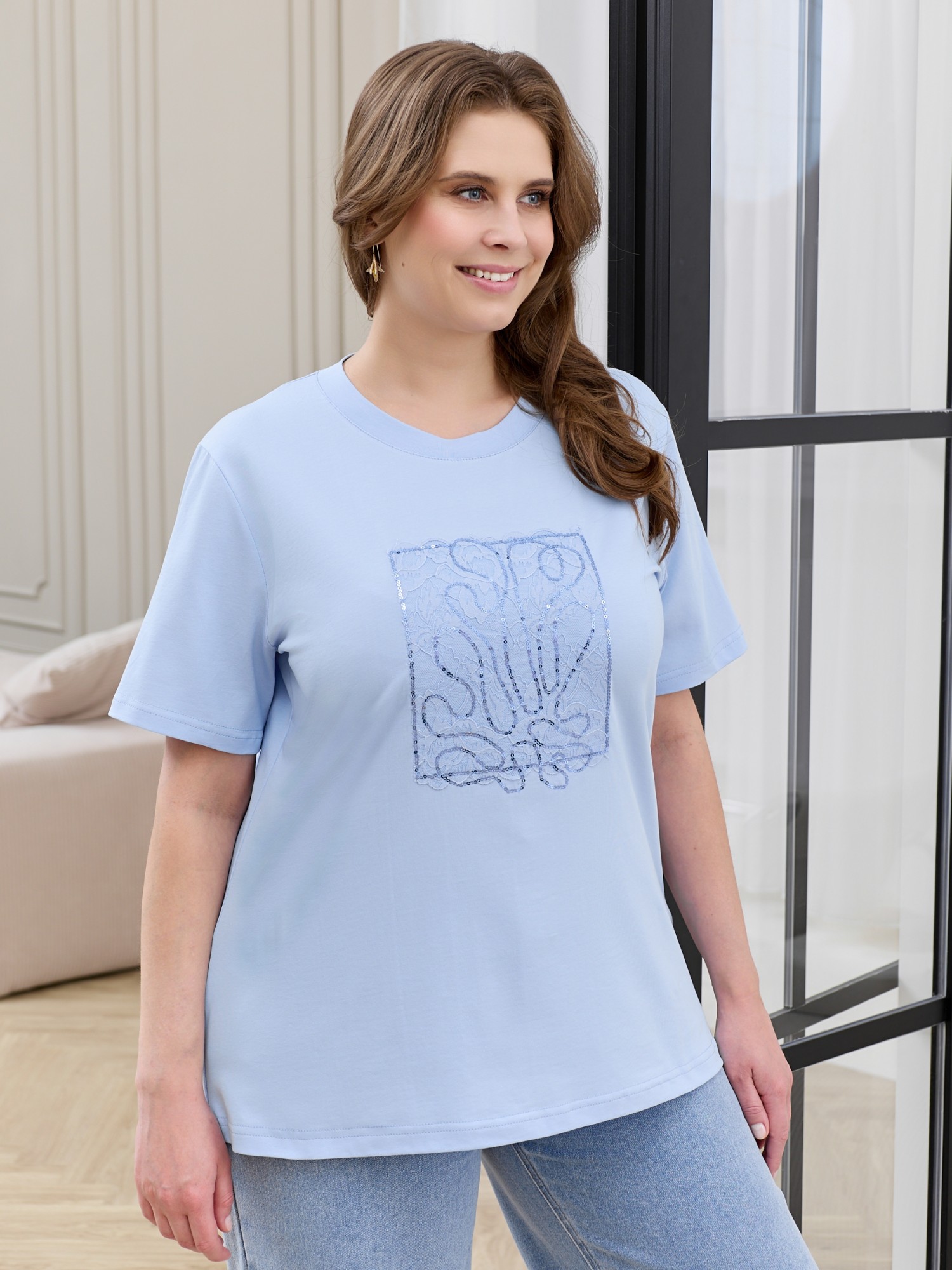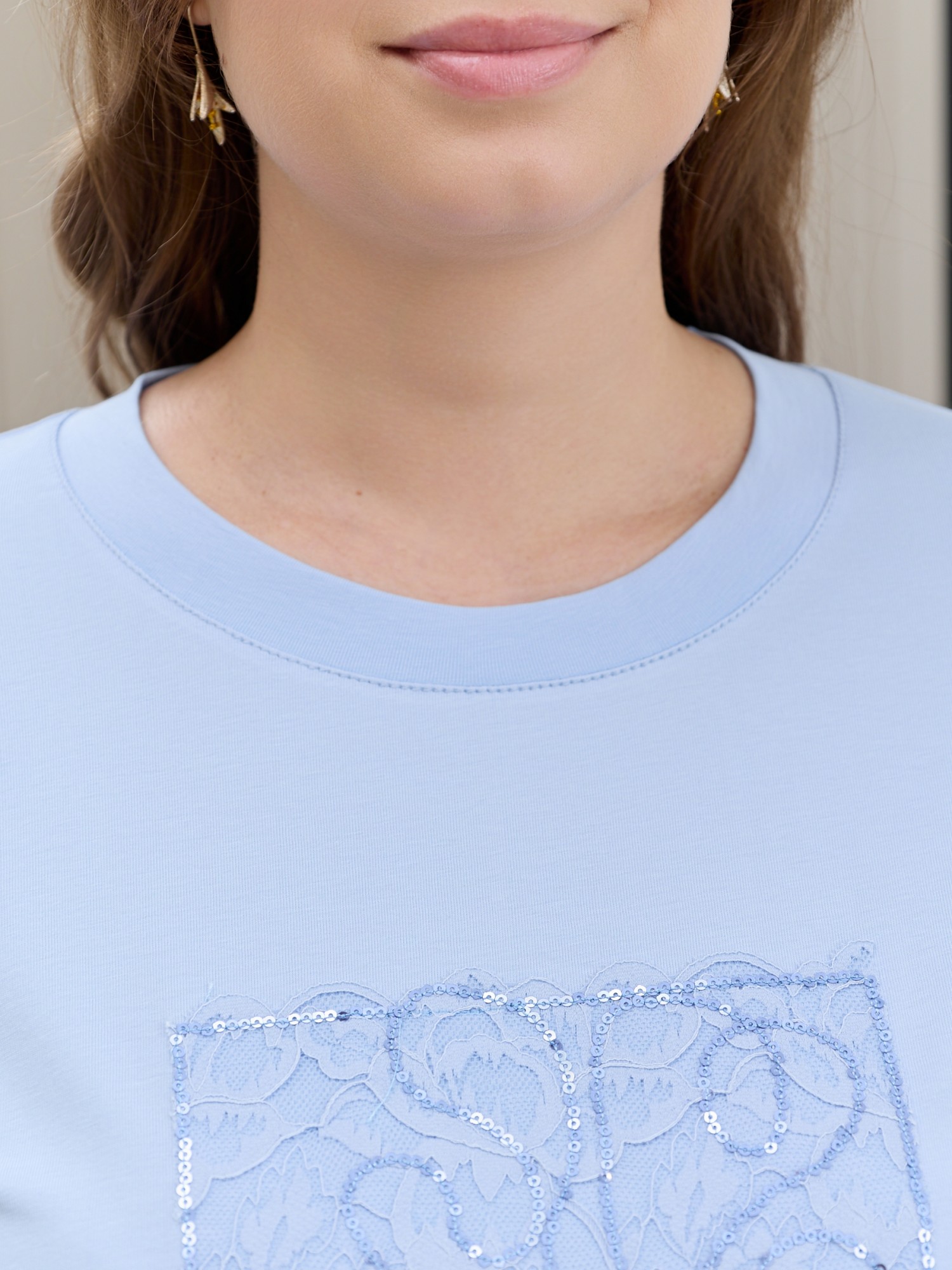 Футболка женская из гладкокрашеного трикотажного полотна «кулирка с лайкрой», полуприталенного силуэта, с горловиной овальной формы, обработанной втачной планкой и короткими рукавами. На полочке выполнена объемная вышивка «пайетками» на гипюровом кружеве в контрастных цветах.