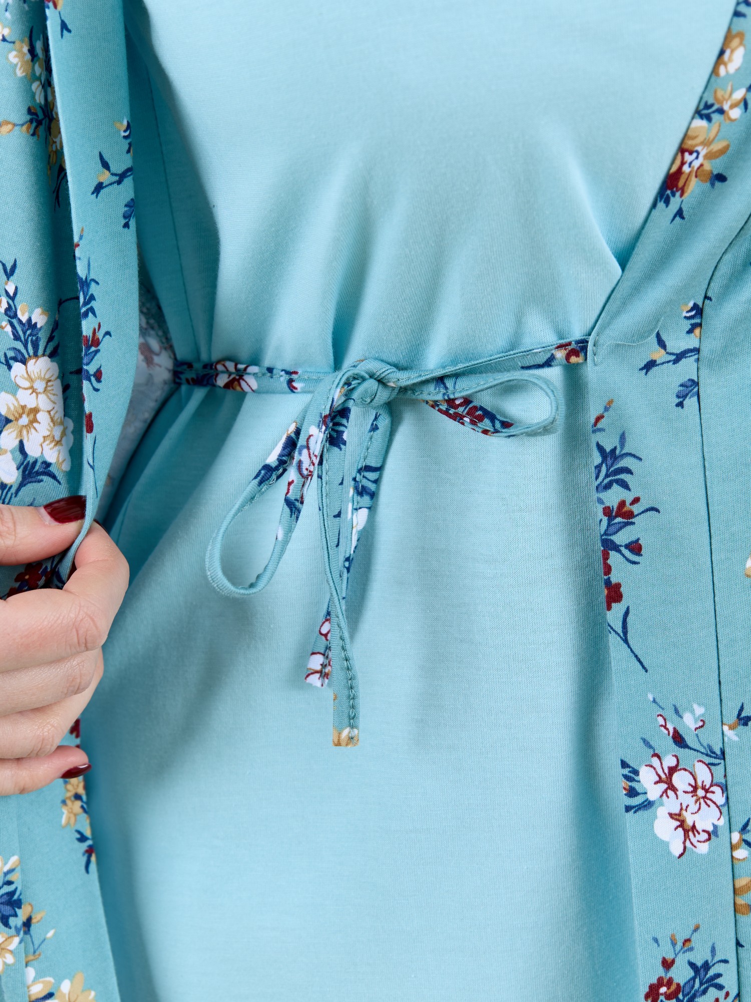 Халат женский из трикотажного полотна «кулирка» с набивным рисунком, на запахе, с втачными длинными рукавами, съемным поясам, продетым в две шлевки, вставленные в боковые швы на уровне линии талии. На правой полочке на уровне бедер – накладной карман прямоугольной формы. Борта и горловина обработаны притачной планкой. Верхний срез кармана и нижние срезы рукавов отделаны кружевом.