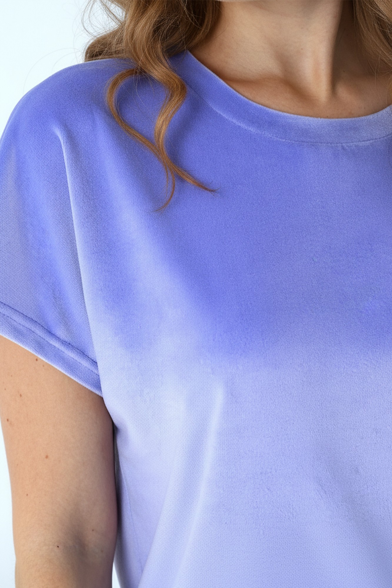 Костюм молодежный из трикотажного полотна «велюр-стрейч», состоящий из футболки и шорт. Футболка – классического покроя, с короткими цельнокроеными рукавами и горловиной овальной формы, обработанной втачной планкой. Шорты - средней длины, расширенные книзу, с эластичной тесьмой по талии.