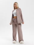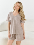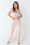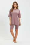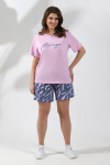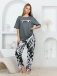 Костюм из трикотажного полотна «кулирка» в комбинации двух видов в единой цветовой гамме: гладкокрашеного и с набивным рисунком, состоящий из футболки и брюк.