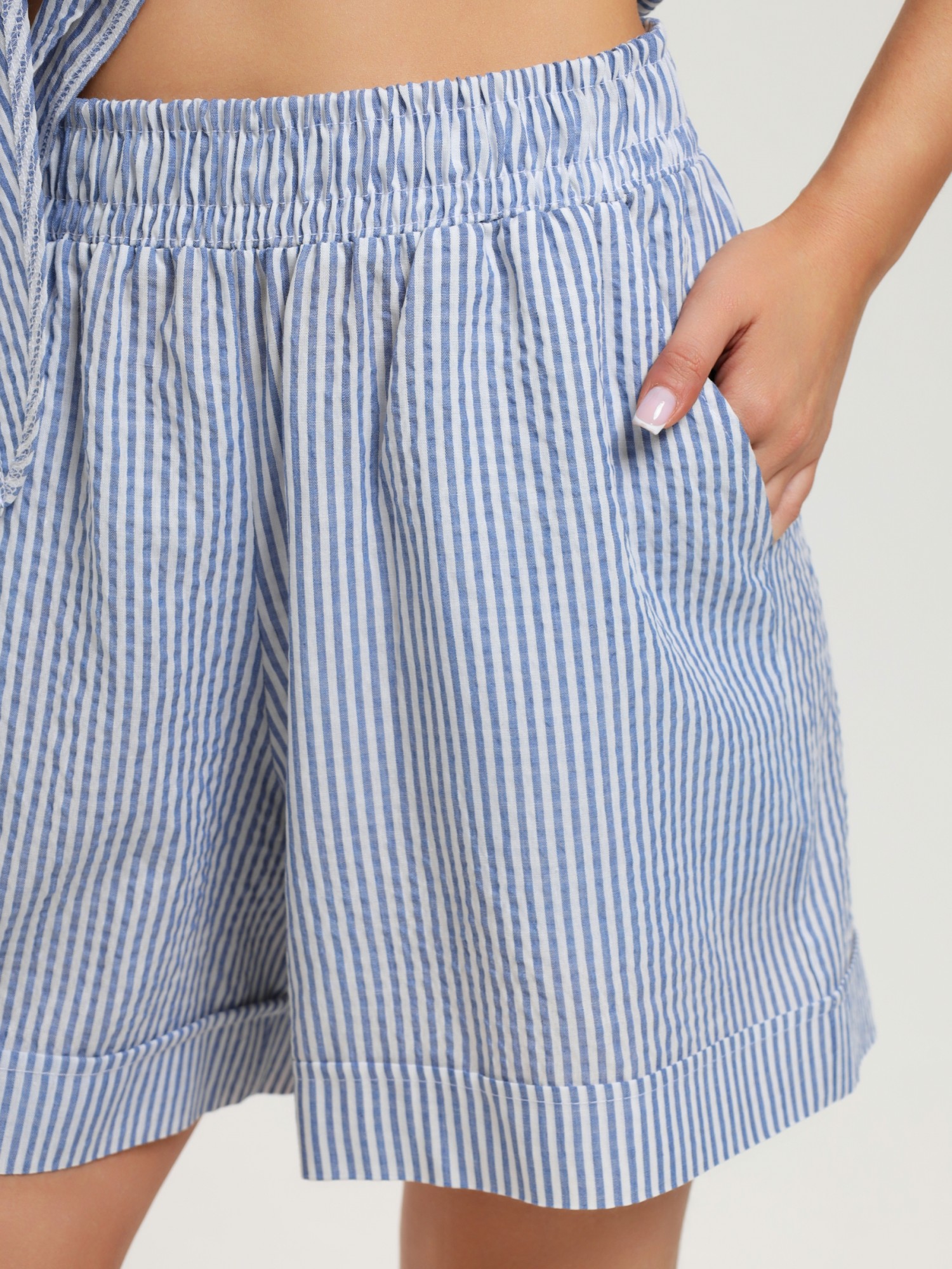 Костюм молодежный из тканого полотна в полоску, состоящий из блузы - рубашки и шорт. Блуза – укороченного силуэта, свободного покроя, с короткими цельнокроеными рукавами, обработанными манжетами, акцентными декоративными завязками спереди, отложным воротником и центральной бортовой застежкой на петли и пуговицы.Шорты - свободные, средней длины, с карманами в боковых швах, на притачном поясе с эластичной тесьмой внутри, с двойной подгибкой низа имитирующей манжет.