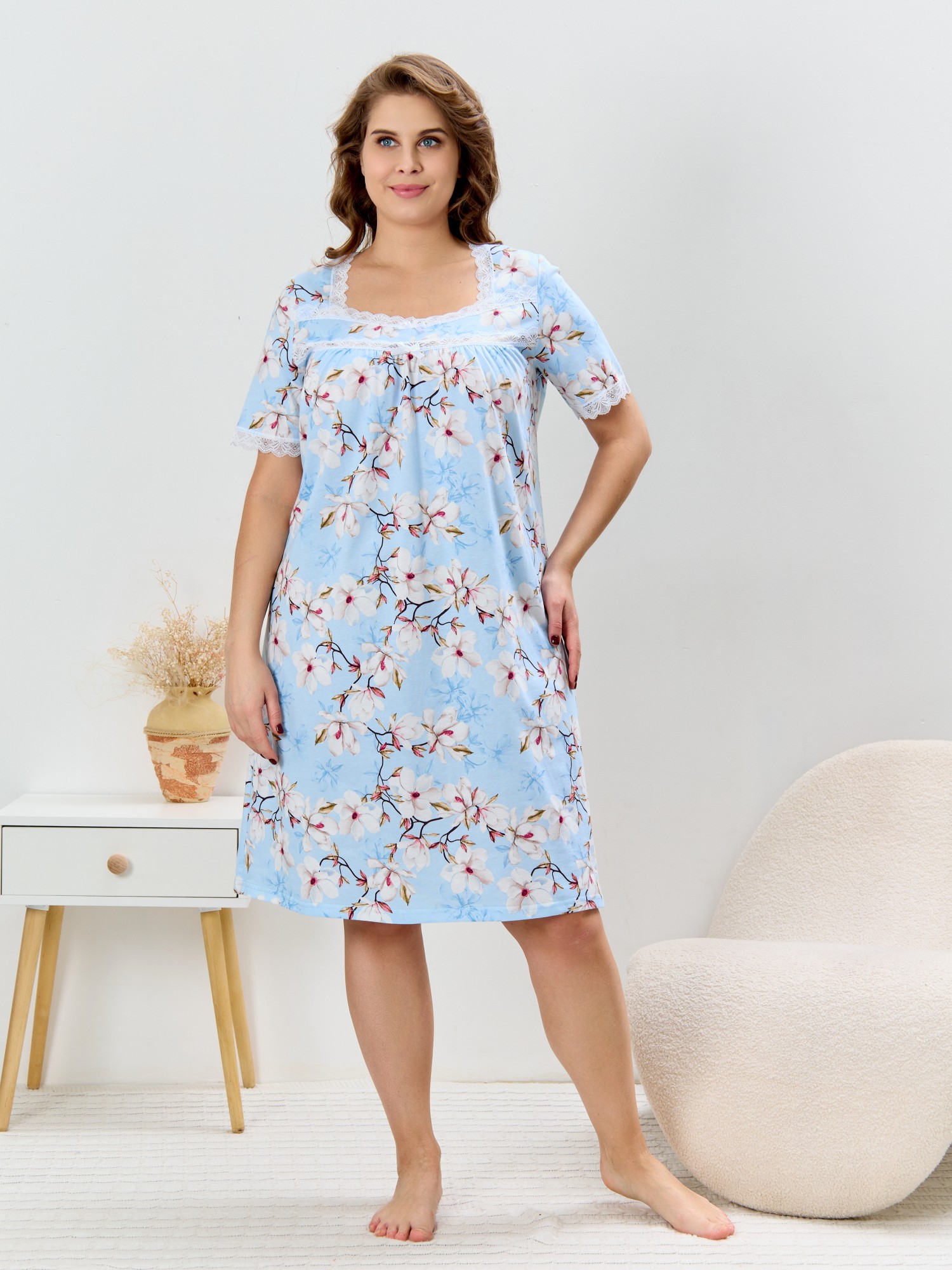 Сорочка женская из трикотажного полотна «кулирка» с набивным рисунком, свободного покроя, расширенная книзу, с короткими втачными рукавами и горловиной фигурной формы. Полочка – с притачной кокеткой V-образной формы, состоящей из двухч астей. Нижняя, основная деталь полочки присборена по шву стачивания с кокеткой. Низ рукавов, горловина и кокетка отделаны кружевом. В центре кокетки – два декоративных бантика из узкой атласной ленты