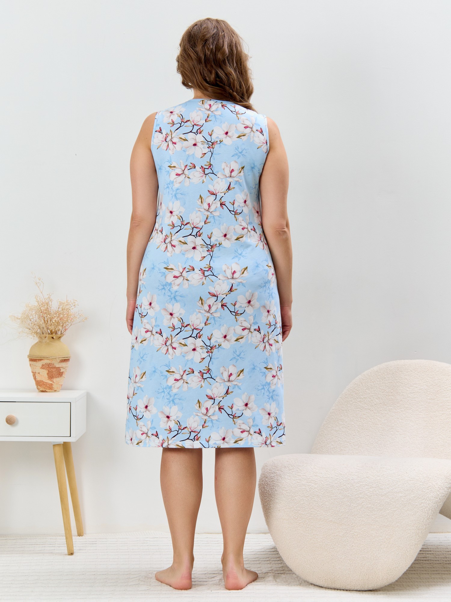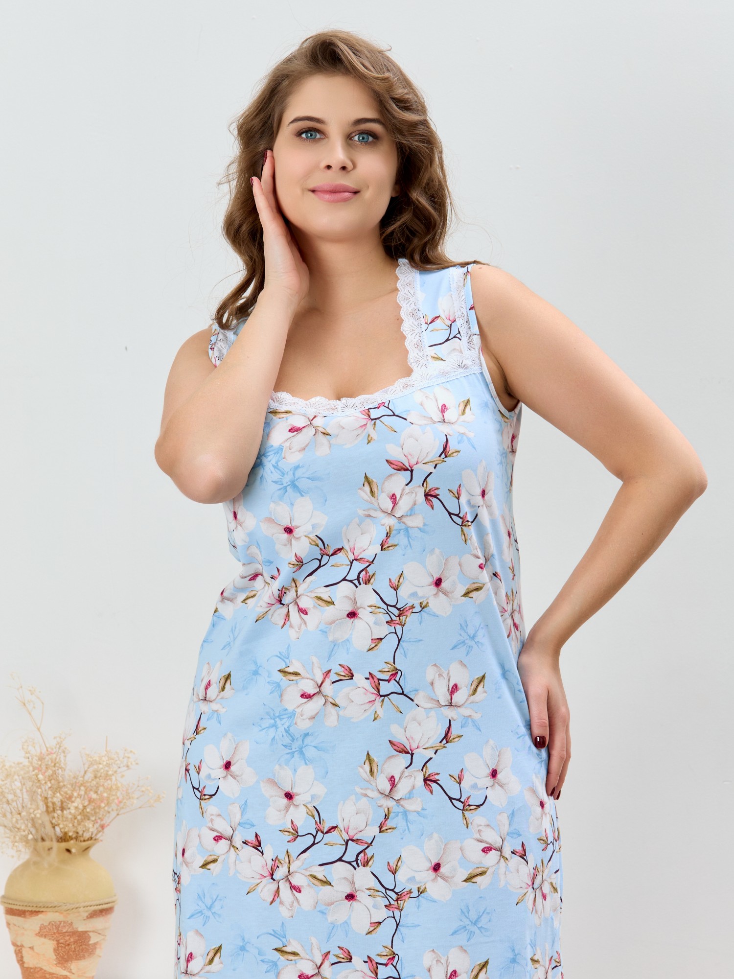Сорочка женская из трикотажного полотна «кулирка», свободного покроя, расширенная книзу, без рукавов, с горловиной фигурной формы и двумя кокетками на полочке. Шов притачивания кокеток к основной детали переда и вертикальные срезы кокетки отделаны кружевом. Горловина спинки и проймы окантованы основным материалом.