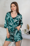 притачной бейкой из контрастного материала.Шорты – из полотна с набивным рисунком контрастного цвета, свободного покроя,