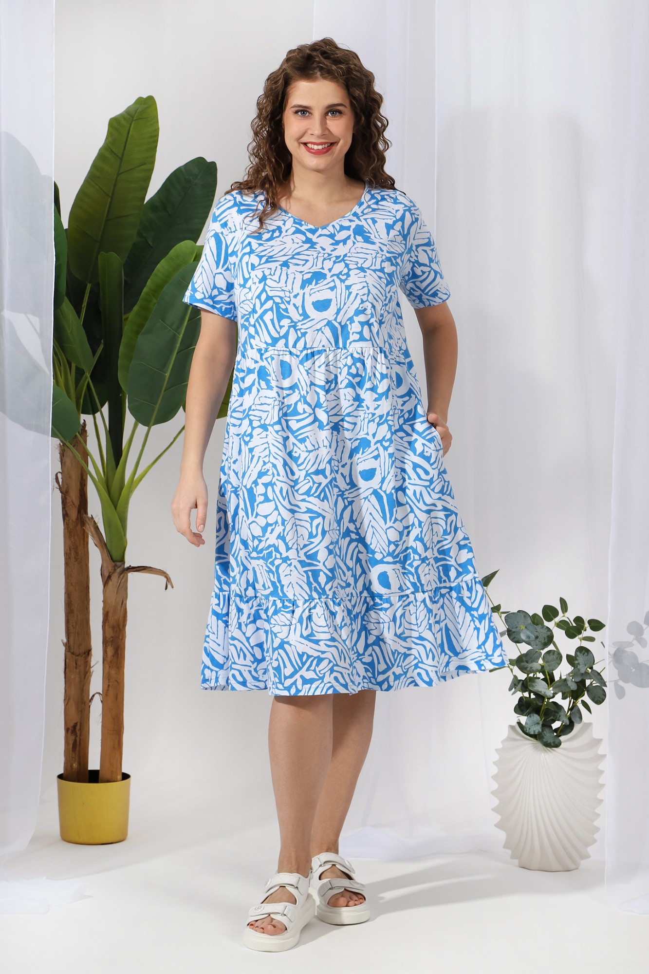 Платье из трикотажного полотна «кулирка» с набивным рисунком, отрезное по талии, с короткими втачными рукавами, горловиной V-образной формы, окантованной основным материалом и карманами в боковых швах. Полочка – с рельефами, выходящими из плечевых швов. Входы в карманы окантованы. Юбка – широкая, присборенная по шву стачивания с лифом и оборкой по низу.