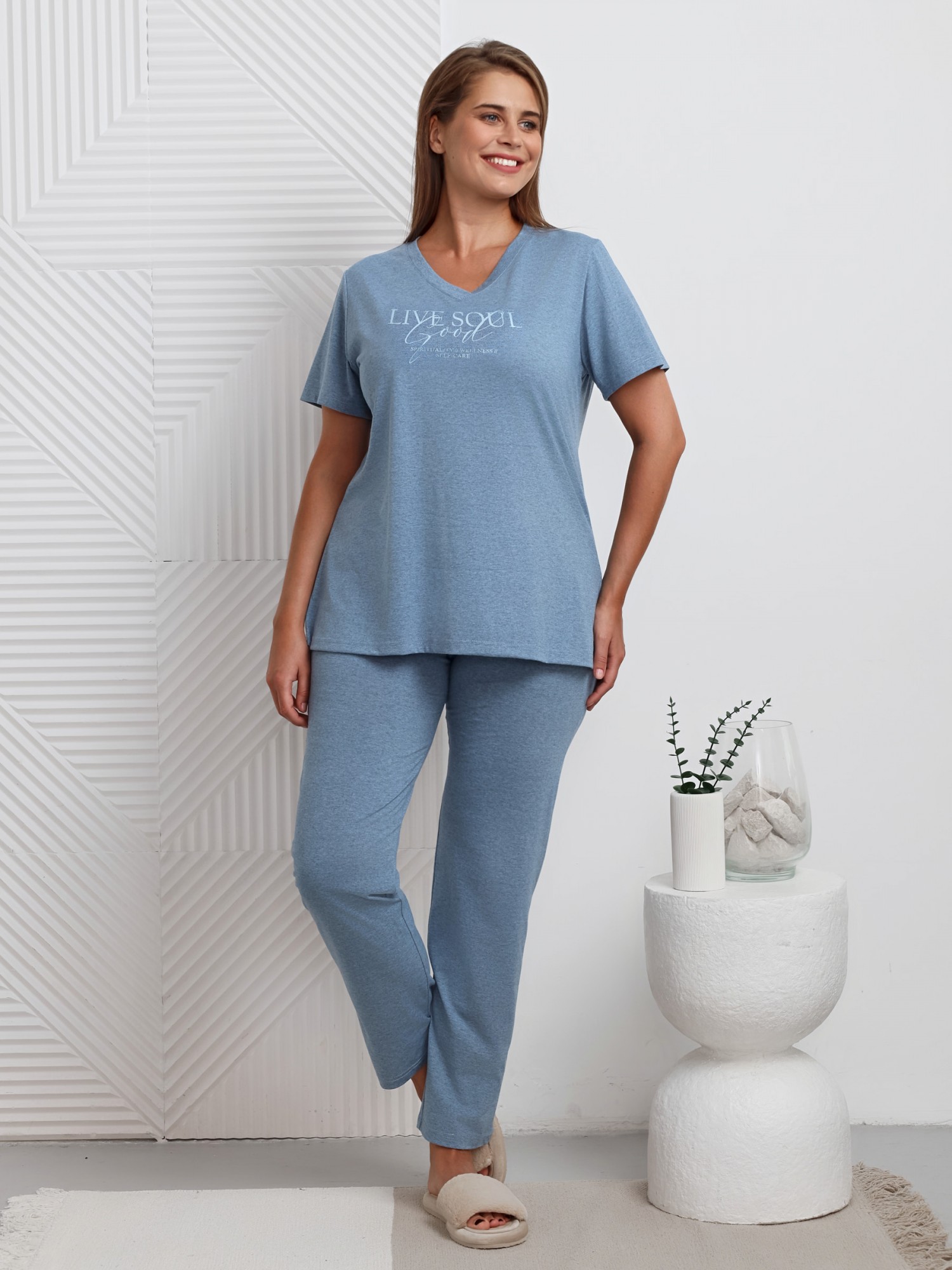 Костюм женский из трикотажного гладкокрашенного меланжированого полотна «кулирка», состоящий из футболки и брюк.Футболка - классического покроя, с короткими втачными рукавами, горловиной V- образной формы и принтом на полочке, выполненным в технике «шелкографии». Горловина обработана втачной планкой из основного материала.Брюки - свободного покроя, с карманами в боковых швах, на притачном поясе с эластичной тесьмой внутри.