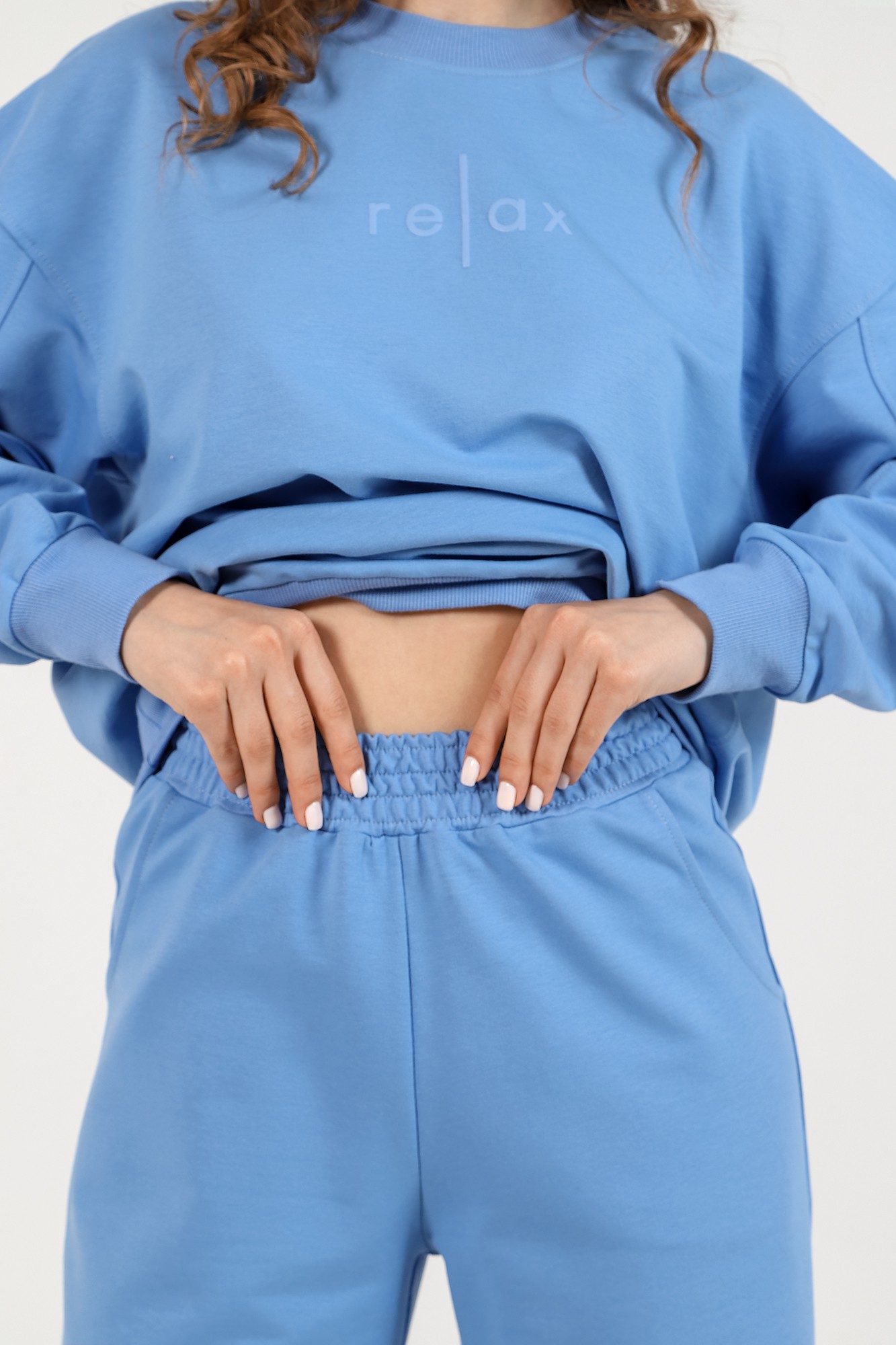 Костюм из гладкокрашеного трикотажного полотна «футер-двунитка», состоящий из джемпера и брюк. Джемпер - прямого силуэта, с длинными втачными рукавами, горловиной овальной формы, обработанной втачной планкой, притачным поясом и принтом на полочке, выполненным методом шелкографии. Манжеты рукавов, планка горловины и полупояса по низу изделия выполнены из эластичного полотна «рибана» в тон основному материалу, боковые швы смещены в сторону переда. Брюки – длинные слегка расширенные книзу, на притачном поясе с эластичной тесьмой внутри и карманами в боковых швах.