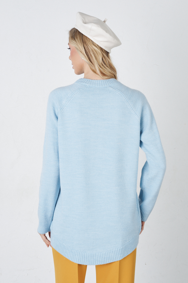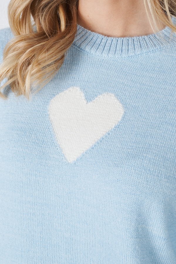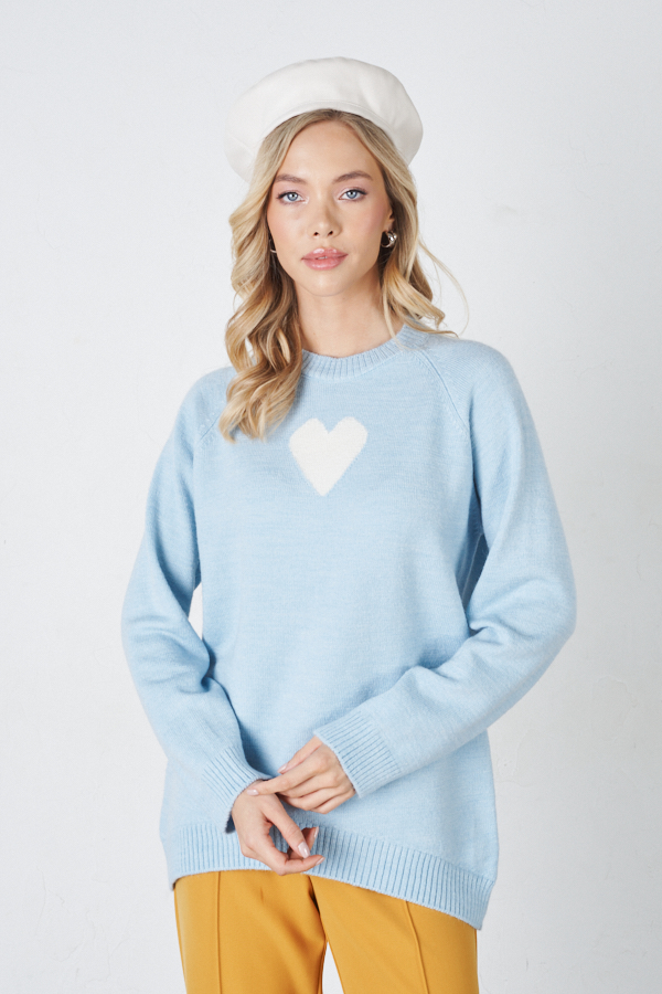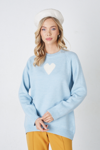 Джемпер свободного силуэта с узором «сердце» в области груди. Низ изделия асимметричной длины (спинка удлинена относительно переда). Длинный рукав-реглан. Круглый вырез горловины, низ изделия и низ рукава оформлены резинкой. Изделие выполнено из мягкой меланжевой пряжи.