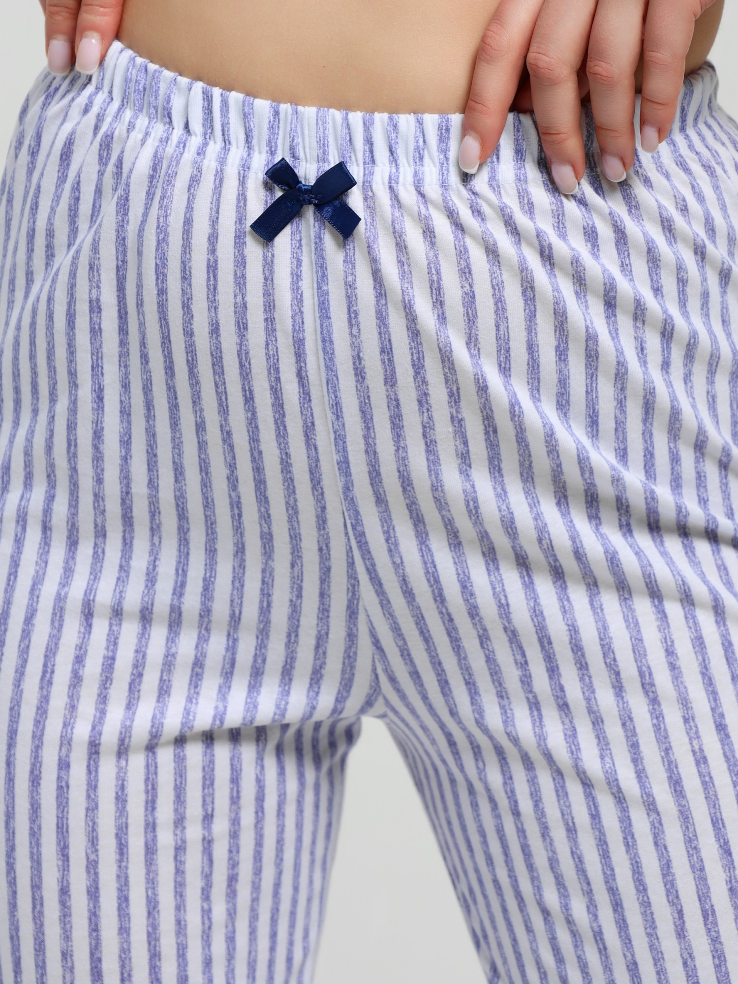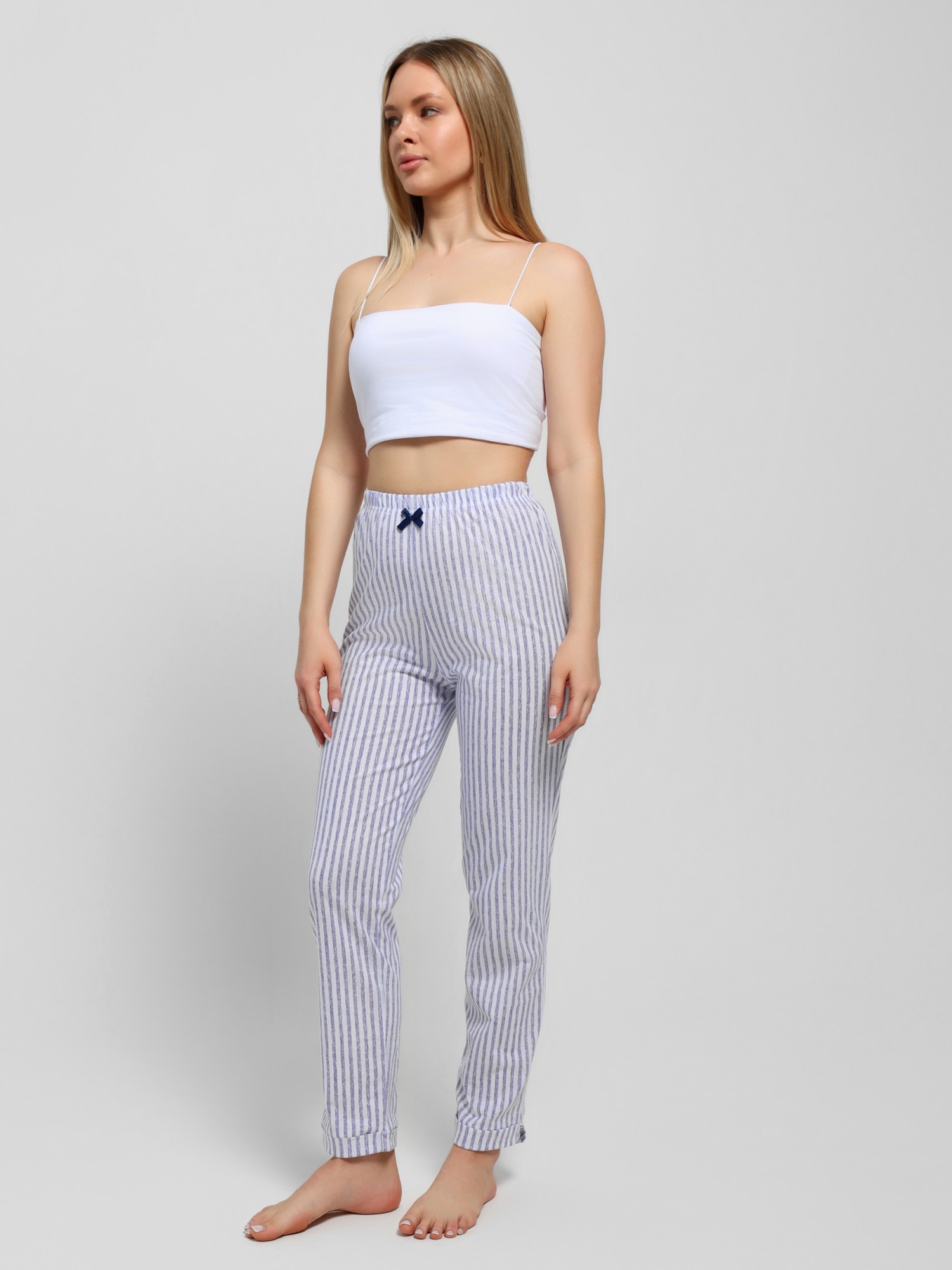 Брюки – из полотна с набивным рисунком в полоску, слегка зауженные книзу, с эластичной тесьмой по талии и притачными манжетами по низу. В центре переда по верхнему срезу прикреплен небольшой декоративный бантик из узкой атласной ленты.