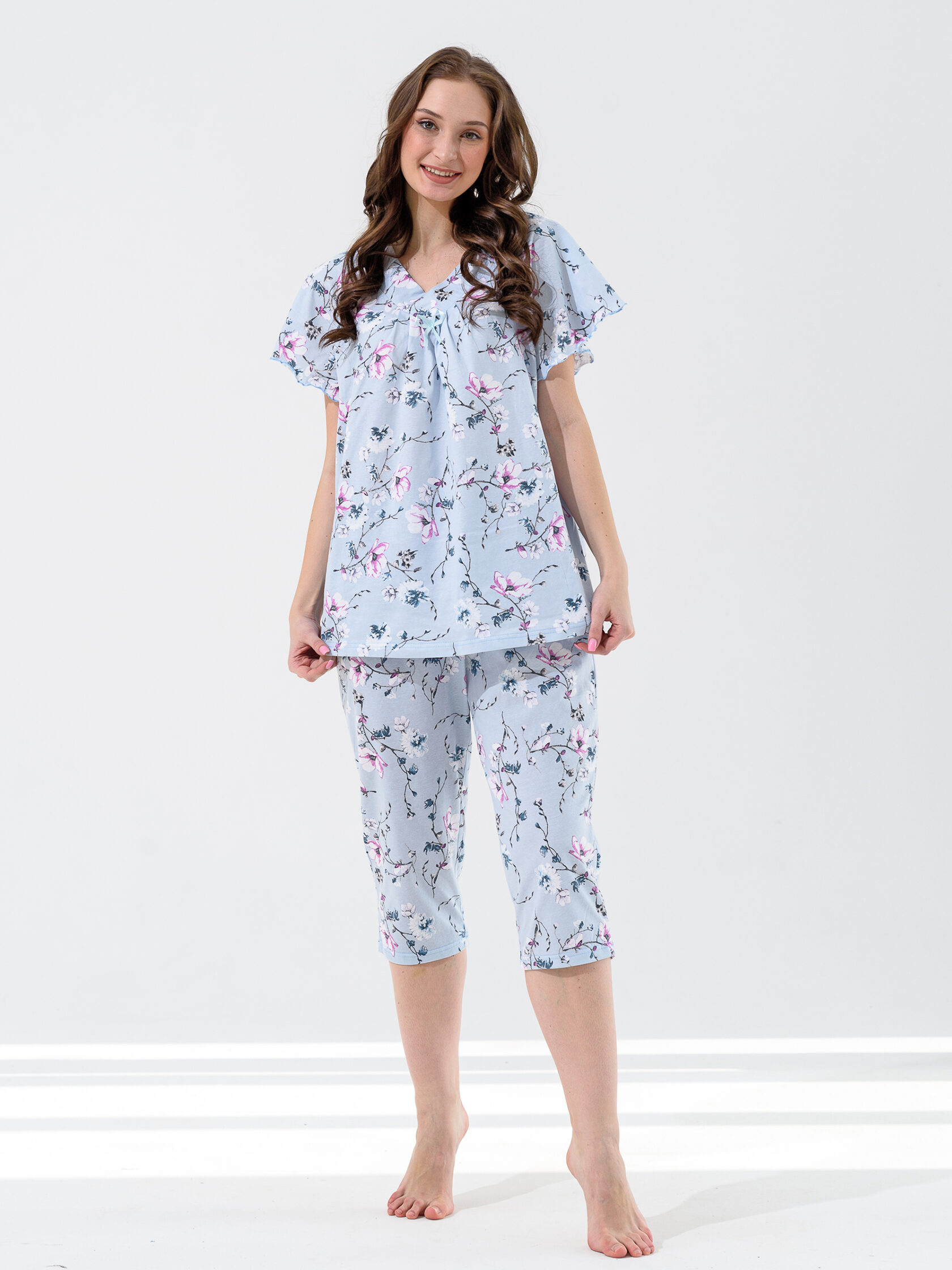 Пижама женская из набивного полотна состоит из футболки и бридж. Футболка прямого силуэта с коротким рукавом-реглан. «V»-образная горловина полочки обработана обтачкой, горловина спинки окантована бейкой из основного полотна. Низ изделия обработан швом «в подгибку», низ рукавов – краеобмёточной машиной. Бриджи прилегающего силуэта с боковыми карманами в швах. Пояс цельнокроеный на резинке.