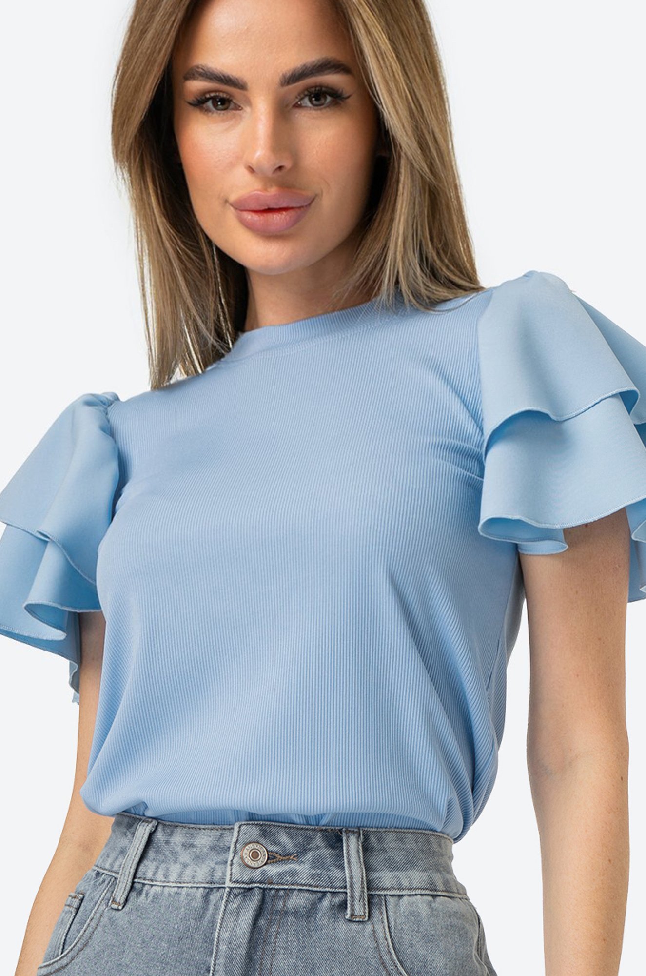 Элегантная футболка с воланами создана для стильных девушек. Пышные рукава придают образу женственности. Праздничная блузка пригодится на любой случай жизни современной леди, это классный вариант на вечеринку, корпоратив или торжество.