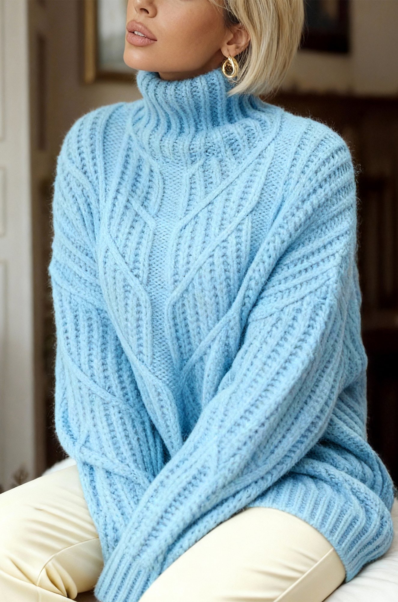 Женский голубой свитер оверсайз станет основой для ваших зимних образов.Объёмный вязаный свитер с высокой горловиной — прекрасный вариант для прохладной погоды. Свободный крой не сковывает движений, а мягкая пряжа дарит комфорт в течение всего дня.