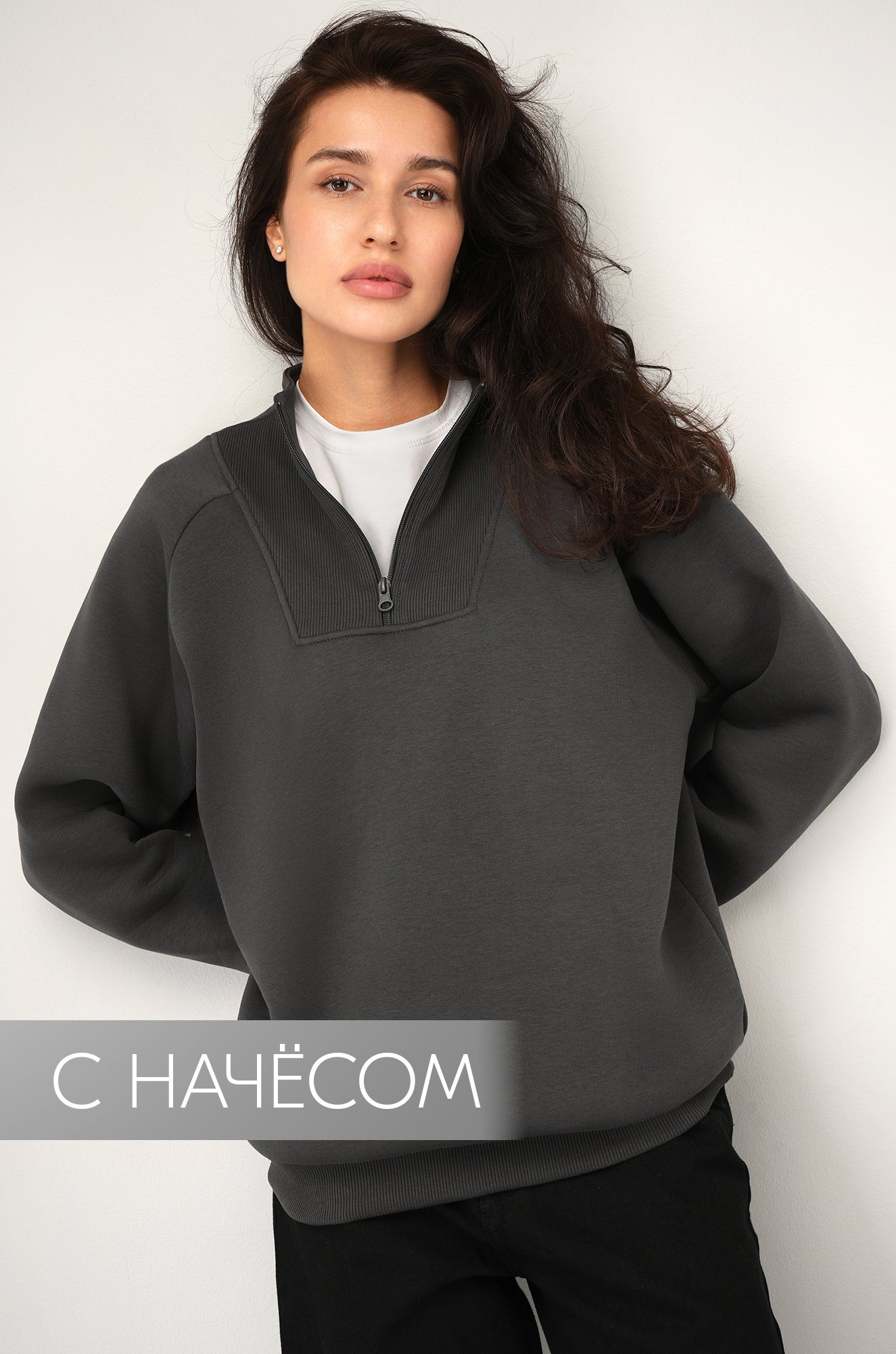 Женская толстовка оверсайз — стиль и к..показатьомфорт в одном. Однотонный темно-серый свитшот на молнии выполнен из мягкого футера с начесом (60% хлопок, 40% полиэстер). Спортивная кофта с воротником на молнии согреет в прохладные дни.