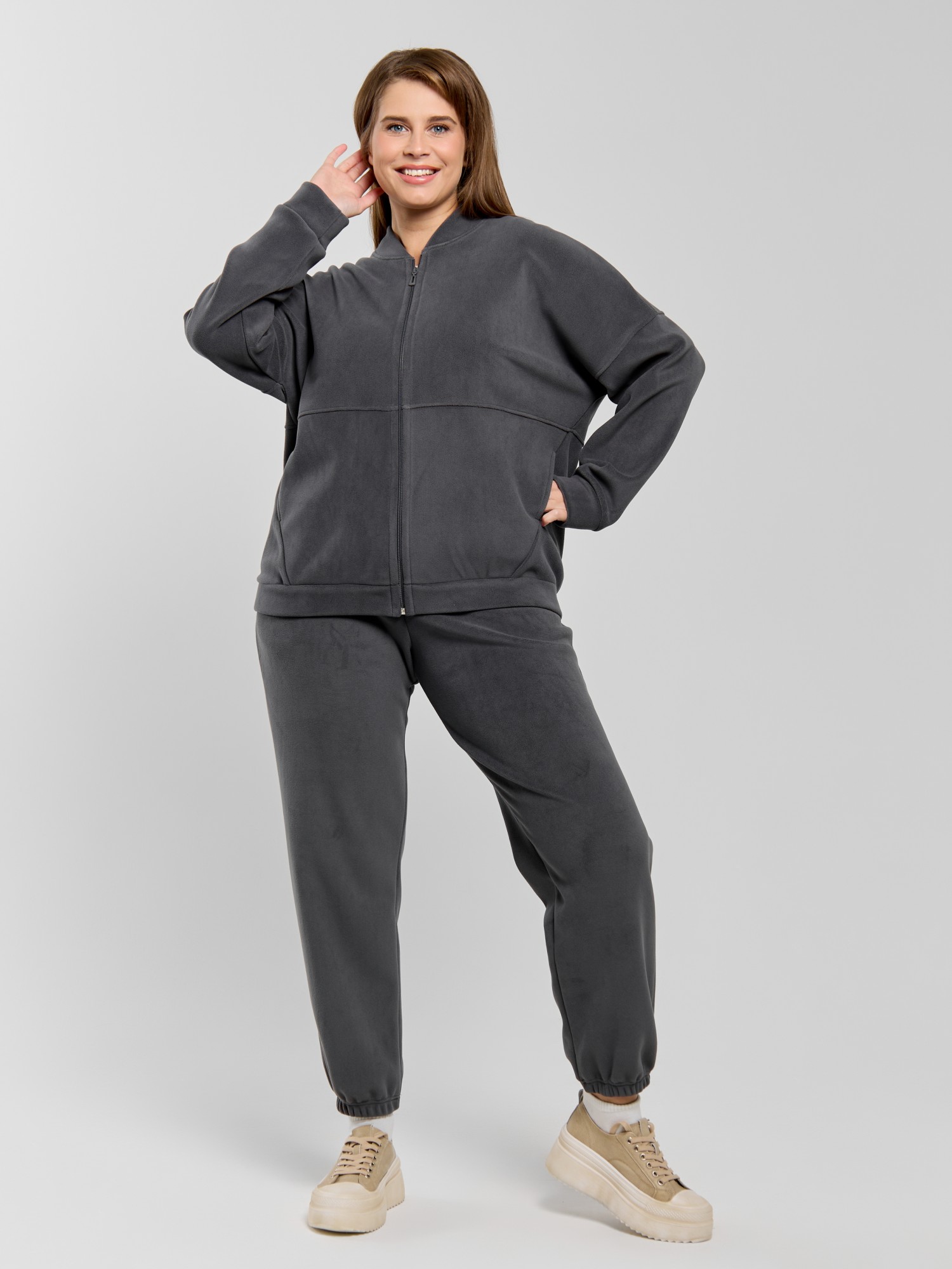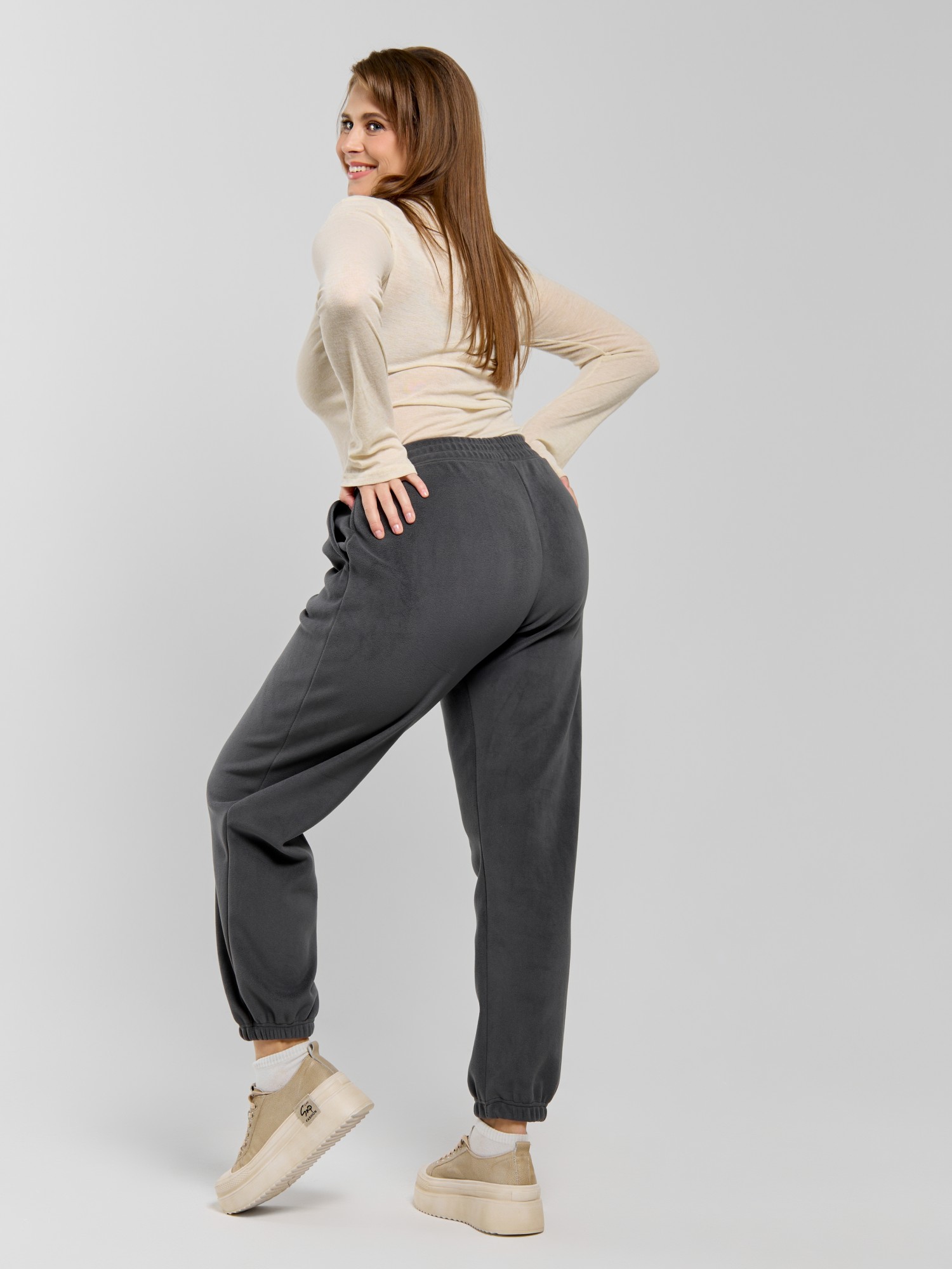 Брюки молодежные из гладкокрашенного трикотажного полотна« дабл-флис» (двухсторонний флис), длинные, с карманами в боковыхшвах, на поясе с эластичной тесьмой внутри. Подгибка нижних срезов выполнена с эластичной тесьмой.