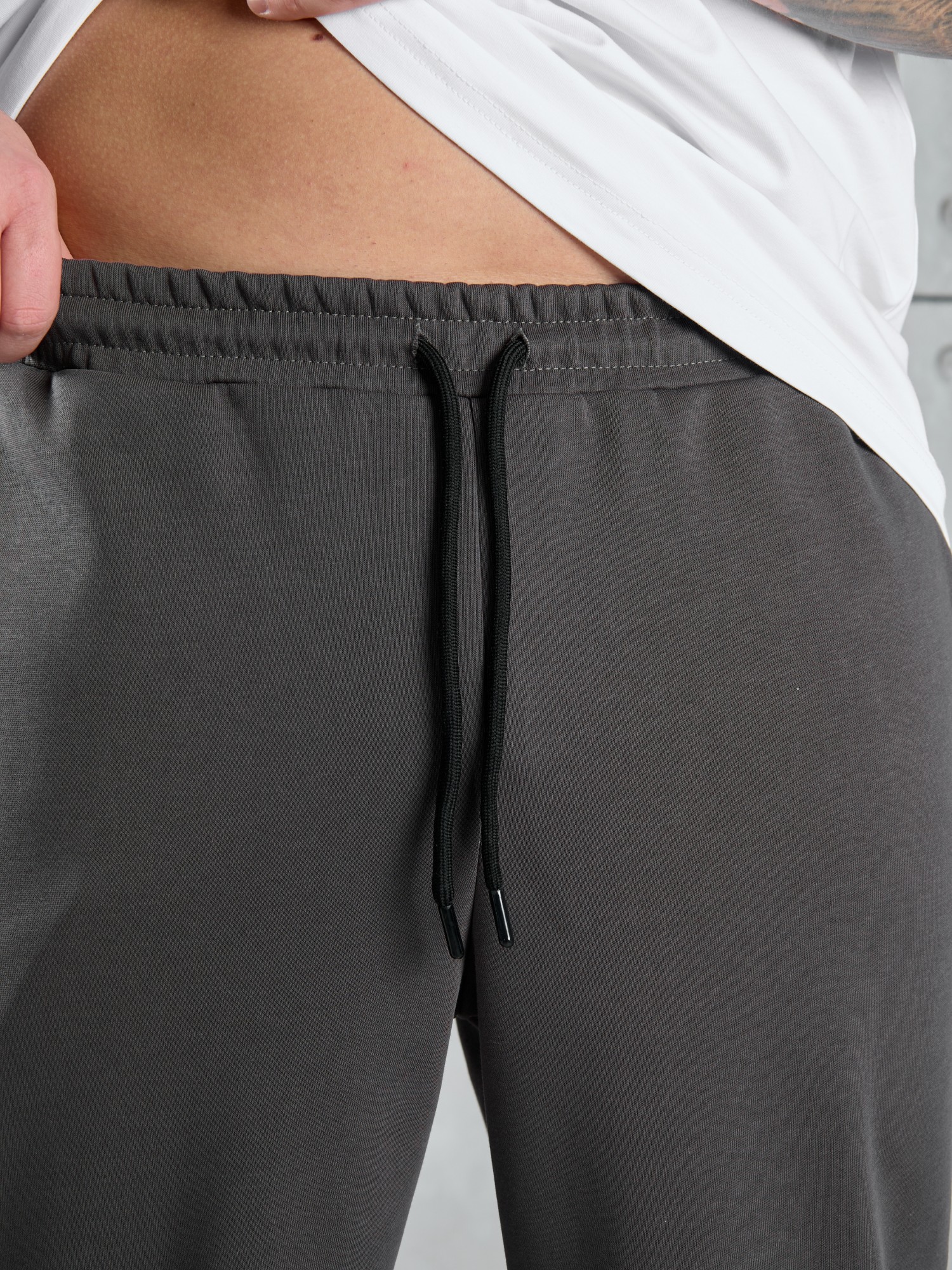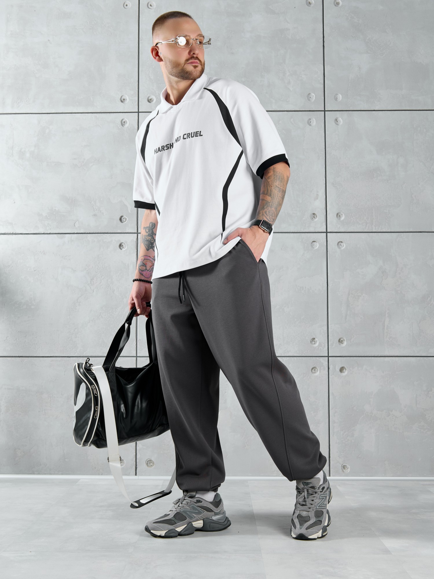 Брюки мужские из трикотажного полотна "лининг" свободного покроя, со смещенными к центрам передних половин боковыми швами, карманами в боковых швах и притачным поясом с эластичной тесьмой внутри. Нижние срезы обработаны подгибкой с эластичной тесьмой. Для регулирования степени прилегания изделия по талии предусмотрен шнурок, вставленный через две обметанные петли в центре пояса спереди.
