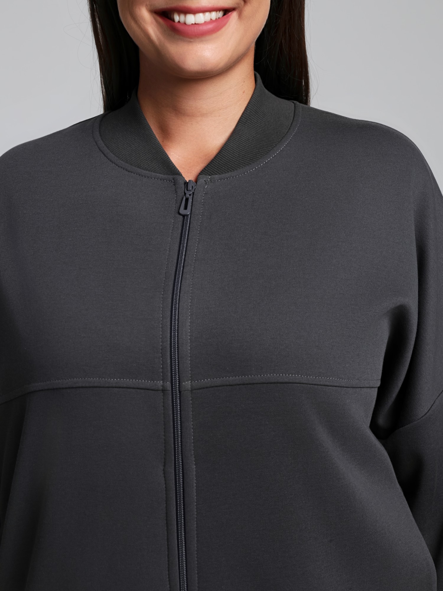 Куртка – женская из гладкокрашенного трикотажного полотна «лининг» прямого силуэта, свободная, с длинными втачными рукавами, горловиной овальной формы, обработанной втачной планкой, центральной бортовой застежкой на тесьму «молния». Полочка состоит из трех деталей, на нижней части в рельефах выполнены карманы, низ изделия с притачным поясом, рукава с притачными манжетами. Пояс, планка горловины, манжеты рукавов выполнены из трикотажного полотна «кашкорсе».