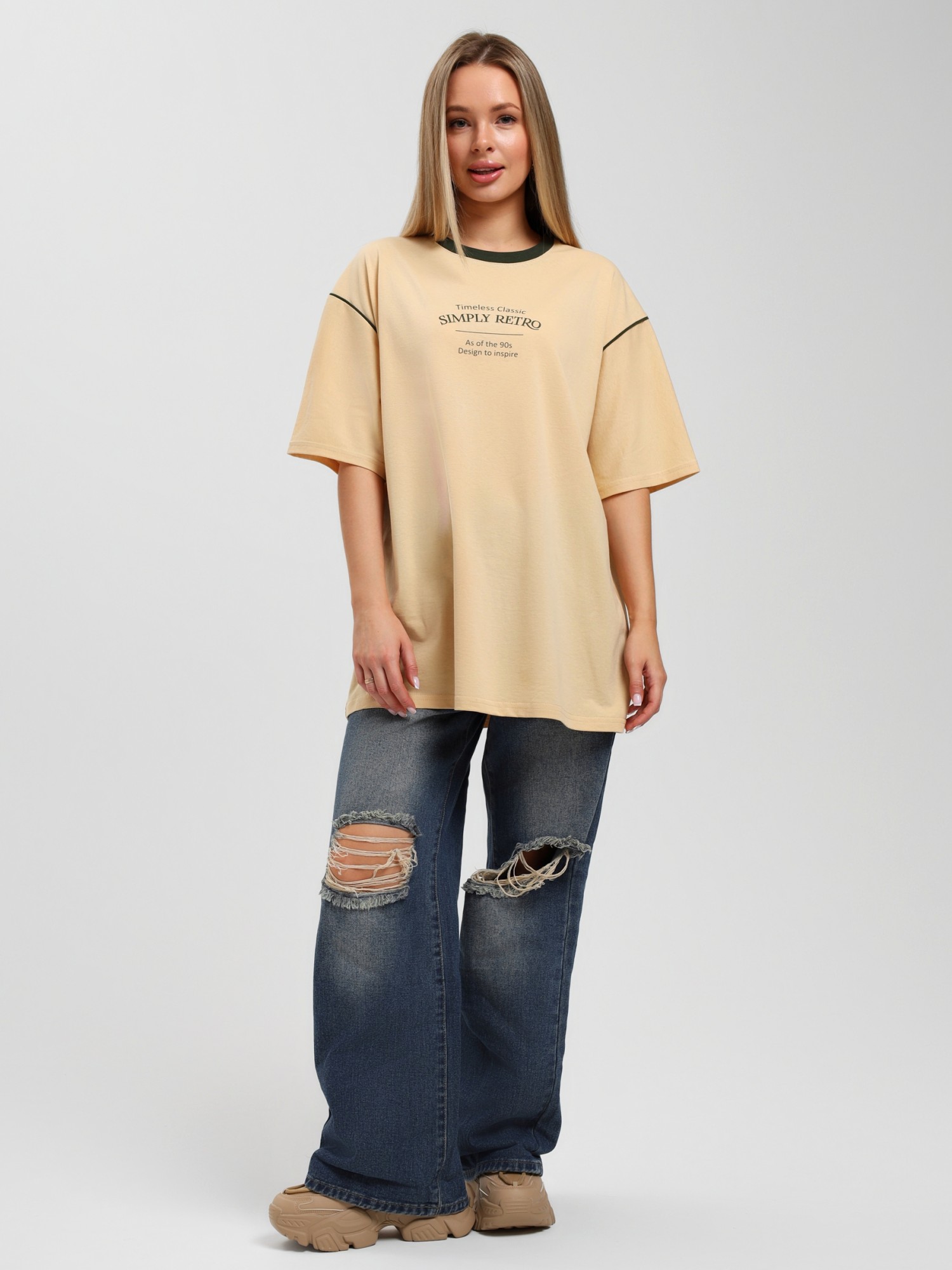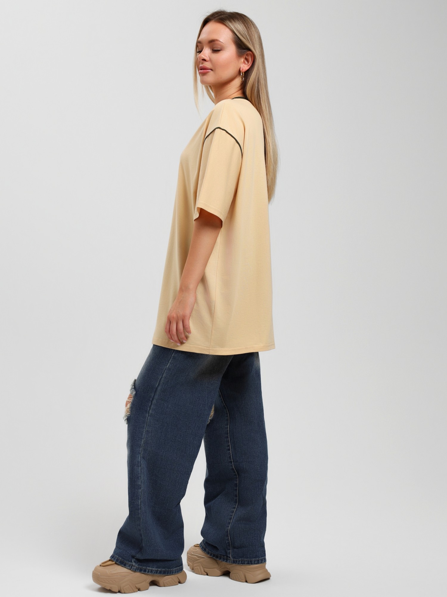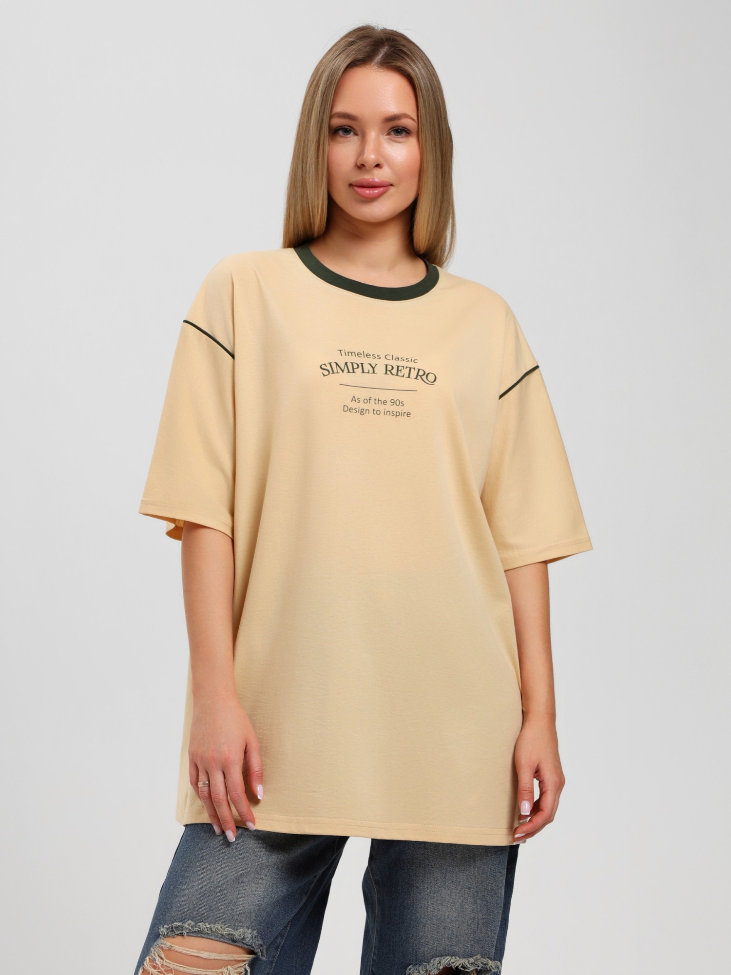 Футболка молодежная из гладкокрашенного полотна «кулирка», свободного покроя, горловиной овальной формы, обработанной втачной планкой, с короткими втачными рукавами, принтом на полочке, выполненным в технике «шелкографии». Планка горловины и кант в шве втачивания рукавов из полотна контрастного цвета.