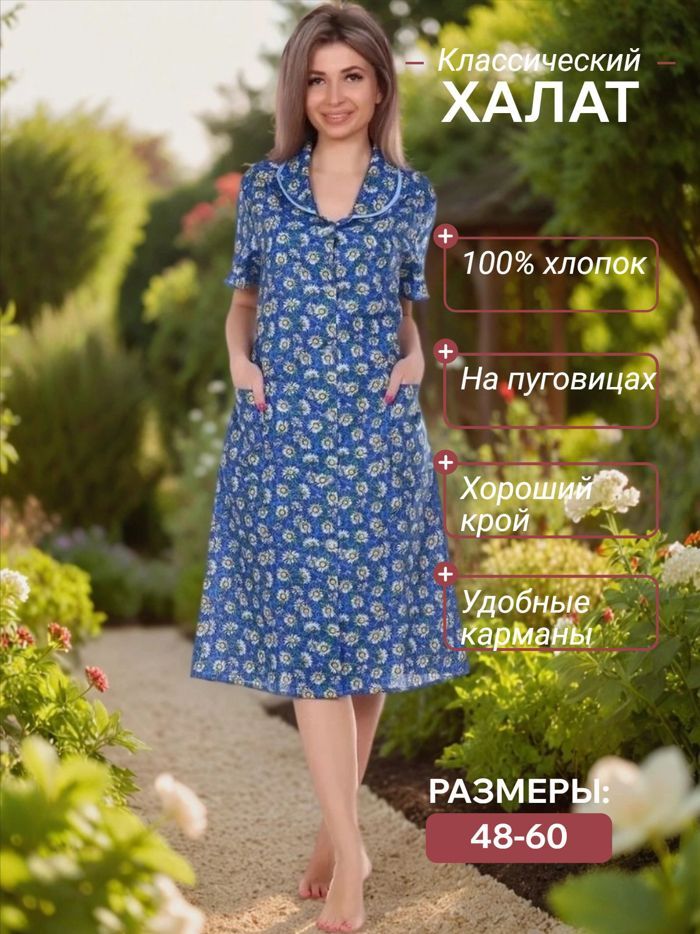 Ткань: бязь; Состав: 100% хлопок; Сезонность: весна, лето, осень, всесезон; Рукав: короткий рукав; Стиль: домашний, повседневный; Застежка: пуговицы; Карман: с карманами; Производство: г. Иваново; Тип изделия: халаты; Цвет: разноцветныйв ассортименте