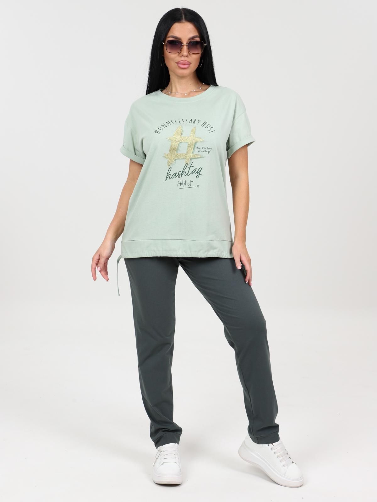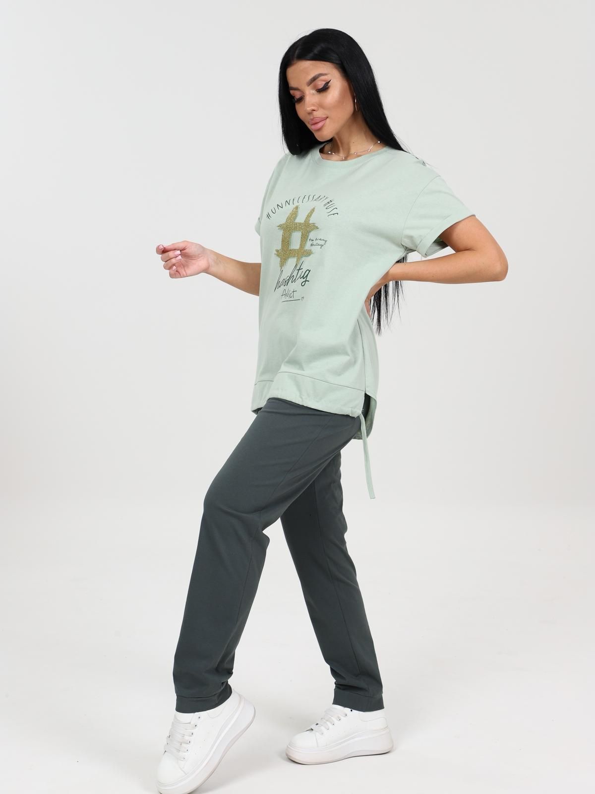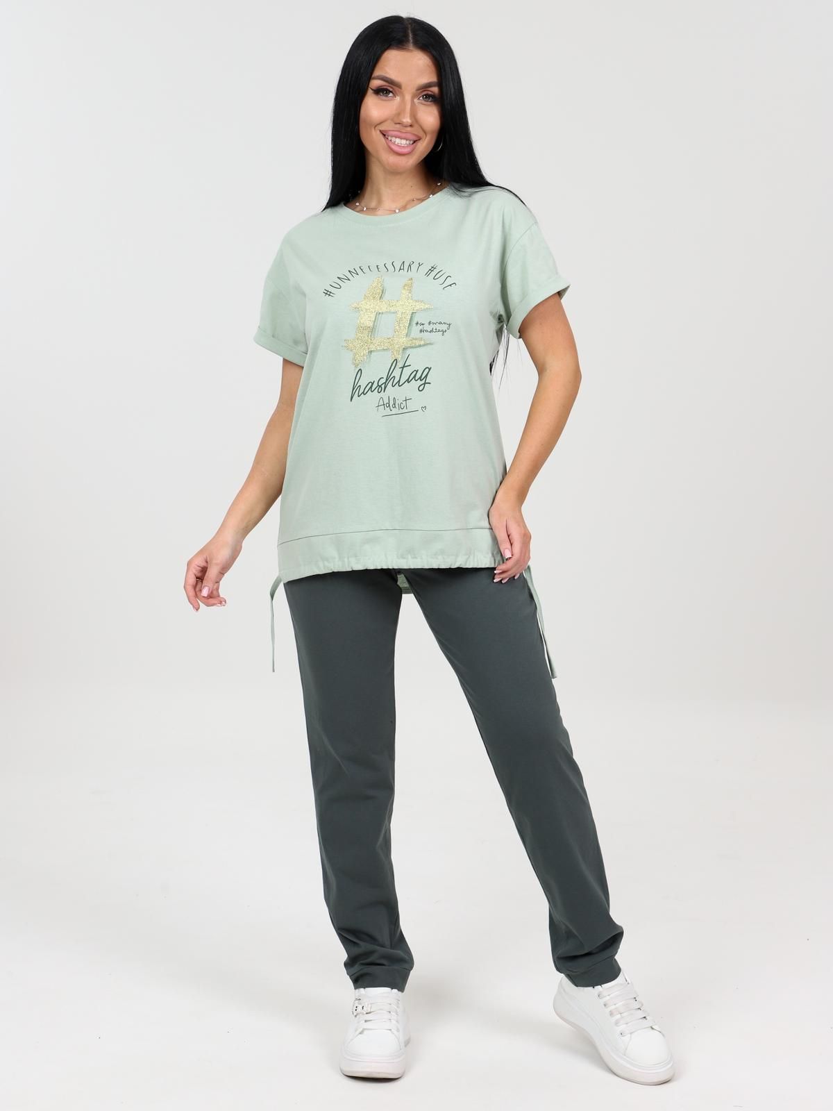 Костюм женский из футболки и брюк.Футболка с короткими рукавами с манжетом. На полочке  расположен принт шелкография с золотым глиттером. Брюки более темные чем футболка по цвету. По низу брюк манжеты.