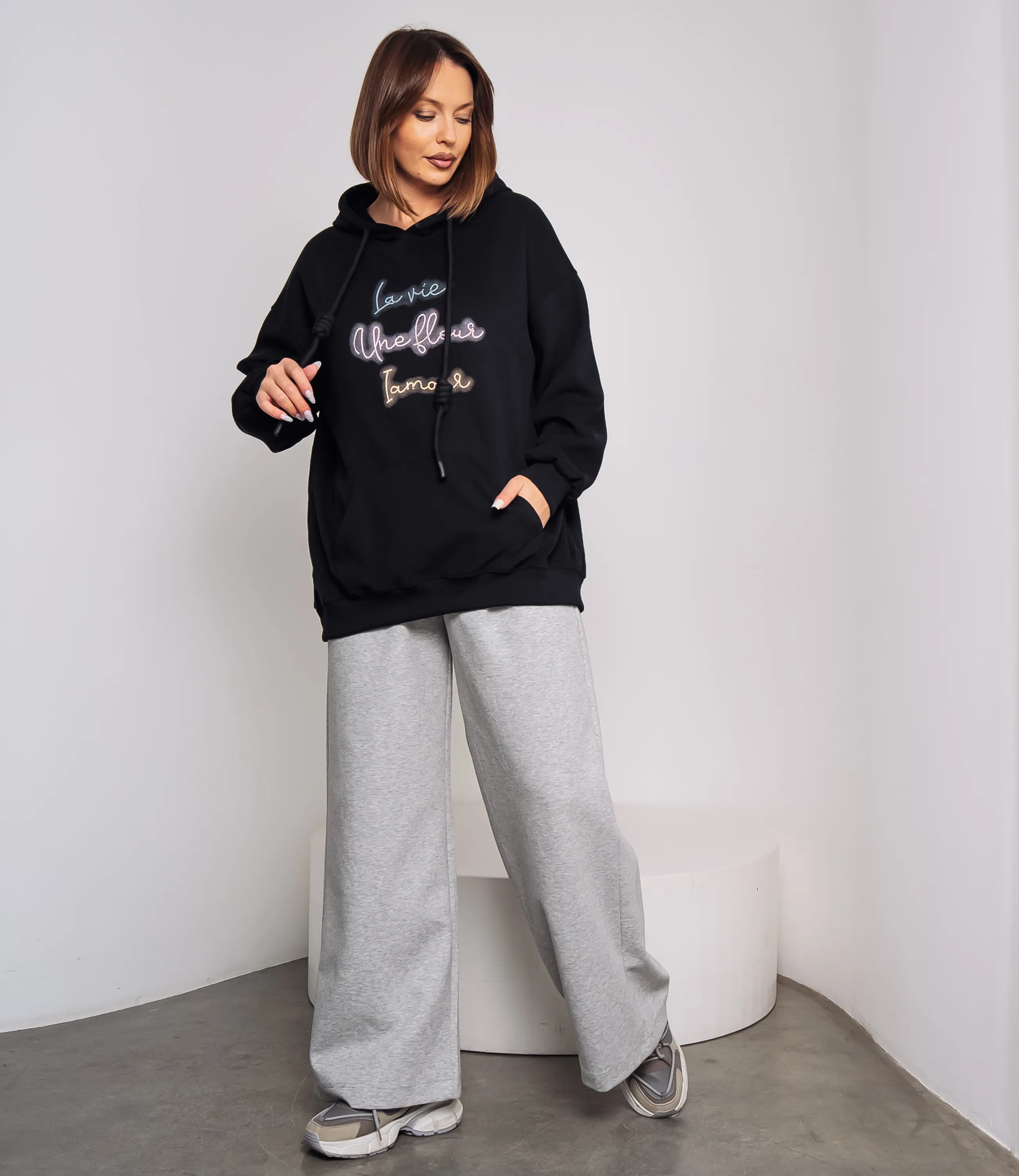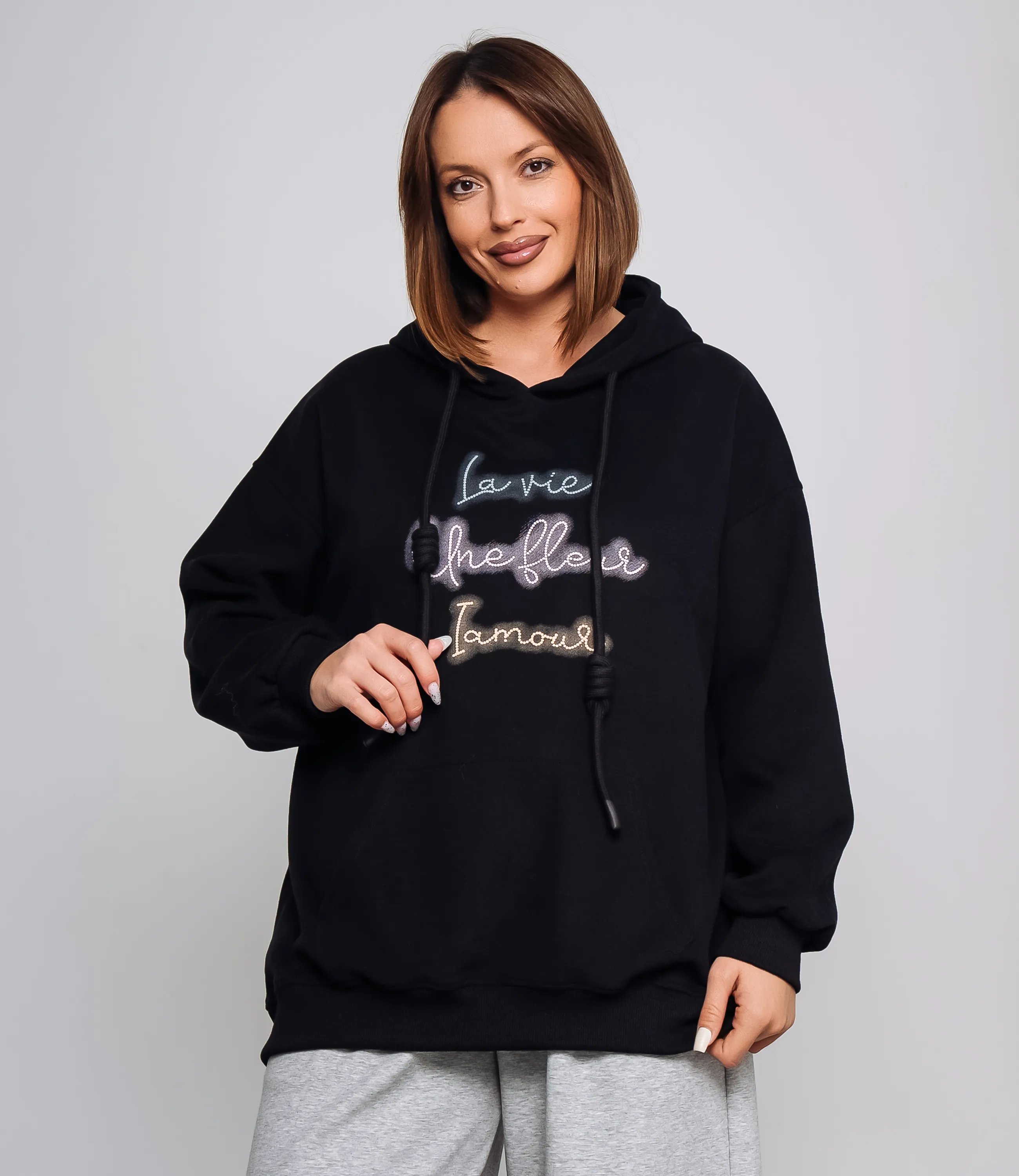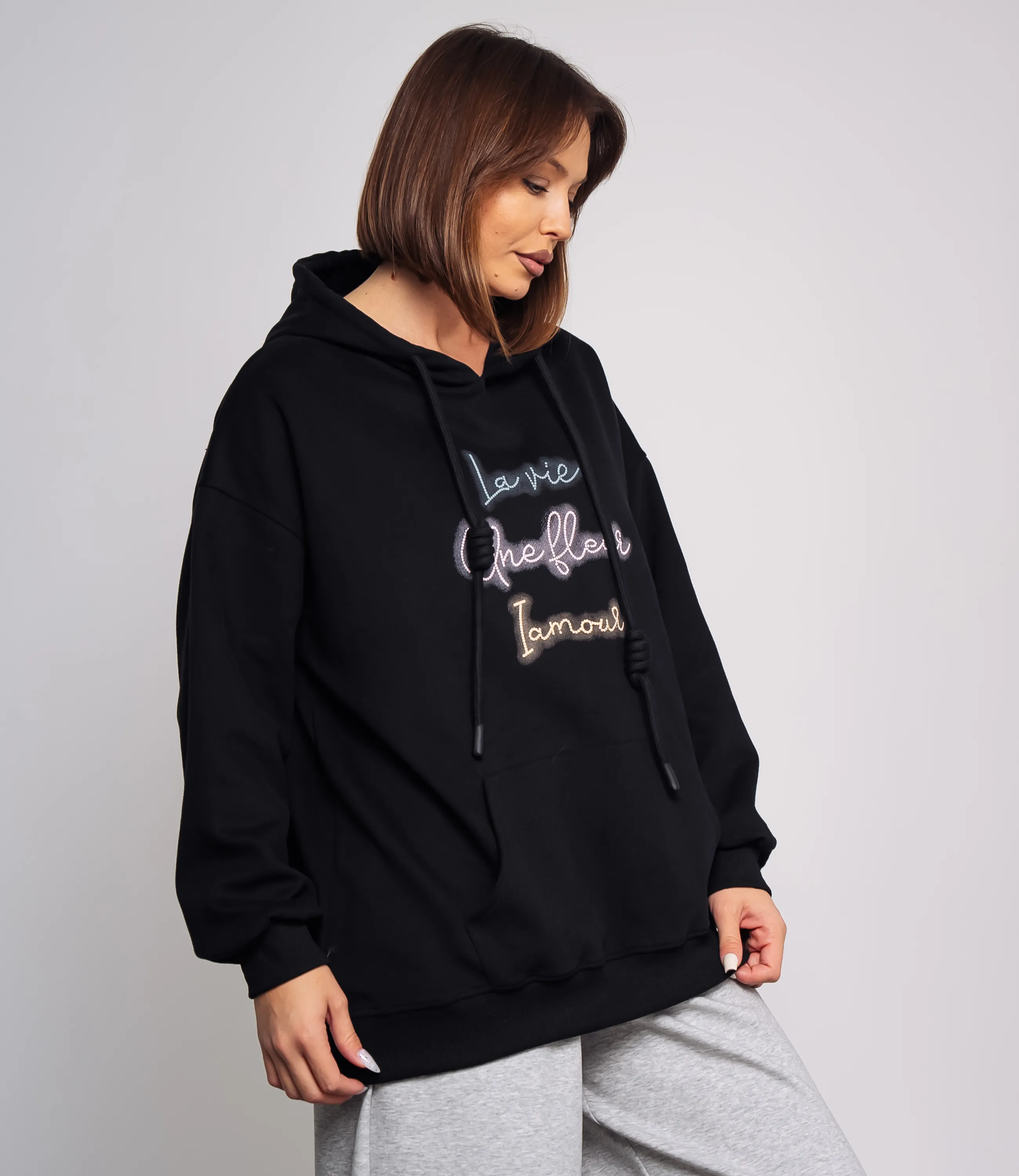 Худи – это одежда, которая подчеркивает уникальность каждой женщины. Худи выполнено из мягкого, средней плотности трикотажа с равномерной, слегка структурированной поверхностью, прямого свободного кроя с подчёркнуто расслабленными пропорциями; модель имеет объёмный капюшон с двумя круглыми шнурами-фитилями, каждый из которых затянут узлом на уровне средней длины, шнуры проходят через резинку или люверсы в кулиске горловины; линия плеча опущенная, рукава широкие, заканчиваются узкими резинками-манжетами, создающими лёгкое сборение у запястий; передняя часть украшена крупным накладным карманом-кенгуру с горизонтальными входами по бокам, низ изделия также обработан широкой резинкой, обеспечивающей аккуратный контур и лёгкую фиксацию на бедрах; на груди декоративная вышивка в виде трёх строк рукописного шрифта, выполненная плоской ниткой. Для пошива использована ткань 100% хлопок, которая характеризуется отличным качеством. Даже после многих стирок изделие не утратит первоначальной привлекательности. Вы сможете носить его с радостью. Обратите внимание на цвет и надпись, они являются стильными и полностью соответствуют фотографии на сайте. Чтобы вы были уверены в размере, мы представили на странице таблицу. Воспользовавшись ею, вы сможете сами обмерить себя и удостовериться. Предложенная нами цена является приемлемой. Не откажите себе в удовольствии быть неотразимой!
