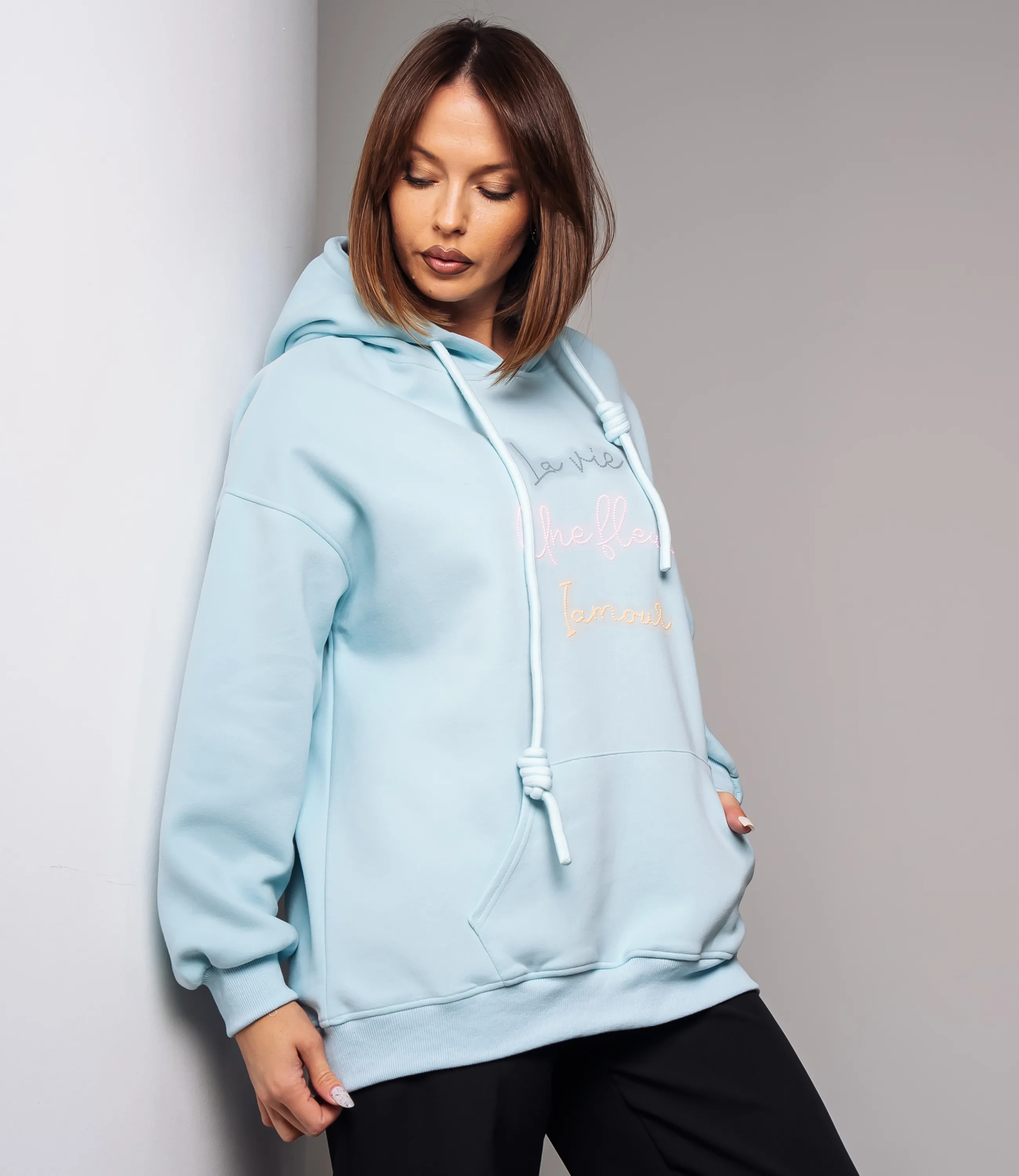 Худи – это одежда, которая подчеркивает уникальность каждой женщины. Худи выполнено из мягкого, средней плотности трикотажа с равномерной, слегка структурированной поверхностью, прямого свободного кроя с подчёркнуто расслабленными пропорциями; модель имеет объёмный капюшон с двумя круглыми шнурами-фитилями, каждый из которых затянут узлом на уровне средней длины, шнуры проходят через резинку или люверсы в кулиске горловины; линия плеча опущенная, рукава широкие, заканчиваются узкими резинками-манжетами, создающими лёгкое сборение у запястий; передняя часть украшена крупным накладным карманом-кенгуру с горизонтальными входами по бокам, низ изделия также обработан широкой резинкой, обеспечивающей аккуратный контур и лёгкую фиксацию на бедрах; на груди декоративная вышивка в виде трёх строк рукописного шрифта, выполненная плоской ниткой. Для пошива использована ткань 100% хлопок, которая характеризуется отличным качеством. Даже после многих стирок изделие не утратит первоначальной привлекательности. Вы сможете носить его с радостью. Обратите внимание на цвет и надпись, они являются стильными и полностью соответствуют фотографии на сайте. Чтобы вы были уверены в размере, мы представили на странице таблицу. Воспользовавшись ею, вы сможете сами обмерить себя и удостовериться. Предложенная нами цена является приемлемой. Не откажите себе в удовольствии быть неотразимой!