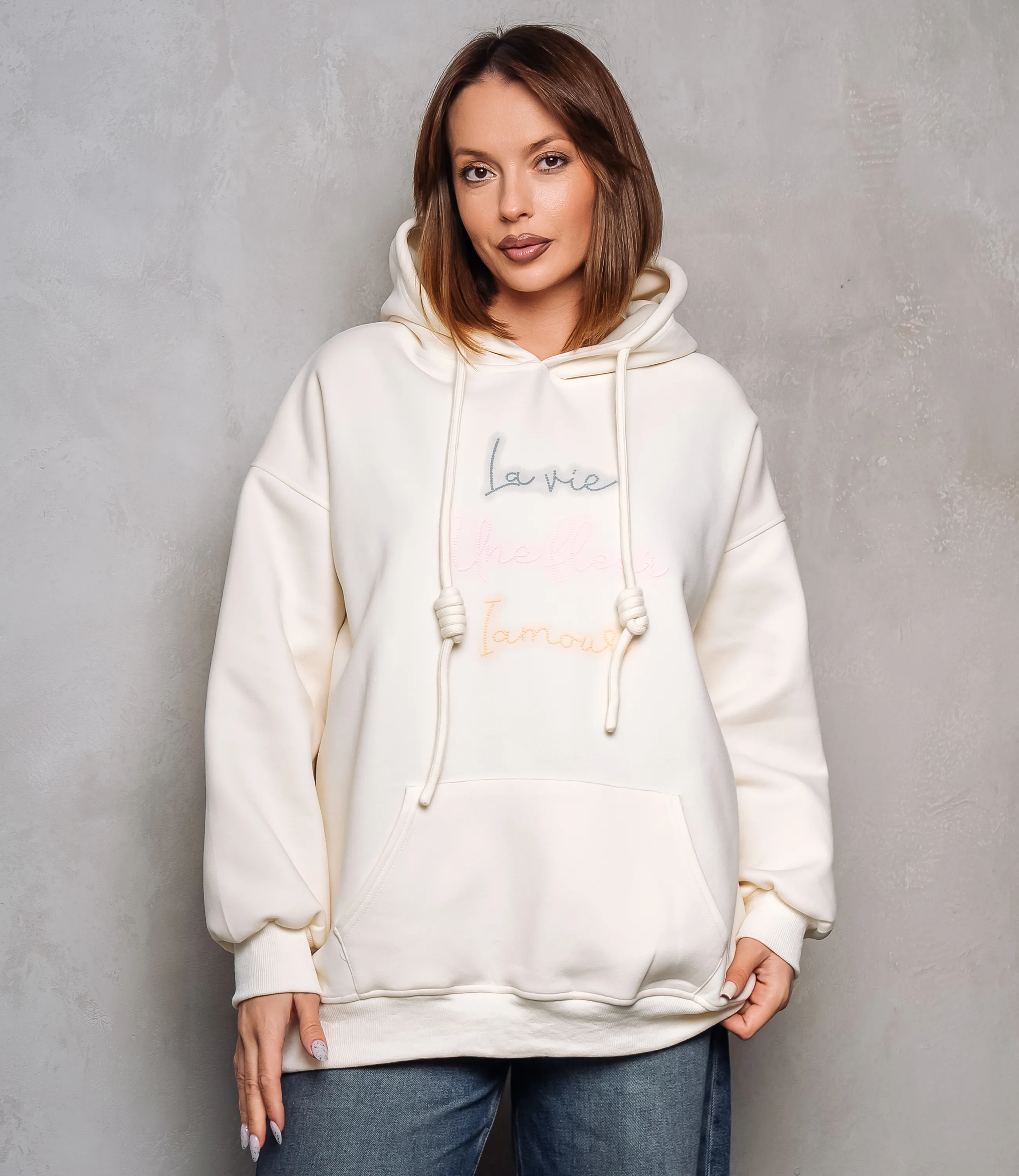Худи – это одежда, которая подчеркивает уникальность каждой женщины. Худи выполнено из мягкого, средней плотности трикотажа с равномерной, слегка структурированной поверхностью, прямого свободного кроя с подчёркнуто расслабленными пропорциями; модель имеет объёмный капюшон с двумя круглыми шнурами-фитилями, каждый из которых затянут узлом на уровне средней длины, шнуры проходят через резинку или люверсы в кулиске горловины; линия плеча опущенная, рукава широкие, заканчиваются узкими резинками-манжетами, создающими лёгкое сборение у запястий; передняя часть украшена крупным накладным карманом-кенгуру с горизонтальными входами по бокам, низ изделия также обработан широкой резинкой, обеспечивающей аккуратный контур и лёгкую фиксацию на бедрах; на груди декоративная вышивка в виде трёх строк рукописного шрифта, выполненная плоской ниткой. Для пошива использована ткань 100% хлопок, которая характеризуется отличным качеством. Даже после многих стирок изделие не утратит первоначальной привлекательности. Вы сможете носить его с радостью. Обратите внимание на цвет и надпись, они являются стильными и полностью соответствуют фотографии на сайте. Чтобы вы были уверены в размере, мы представили на странице таблицу. Воспользовавшись ею, вы сможете сами обмерить себя и удостовериться. Предложенная нами цена является приемлемой. Не откажите себе в удовольствии быть неотразимой!