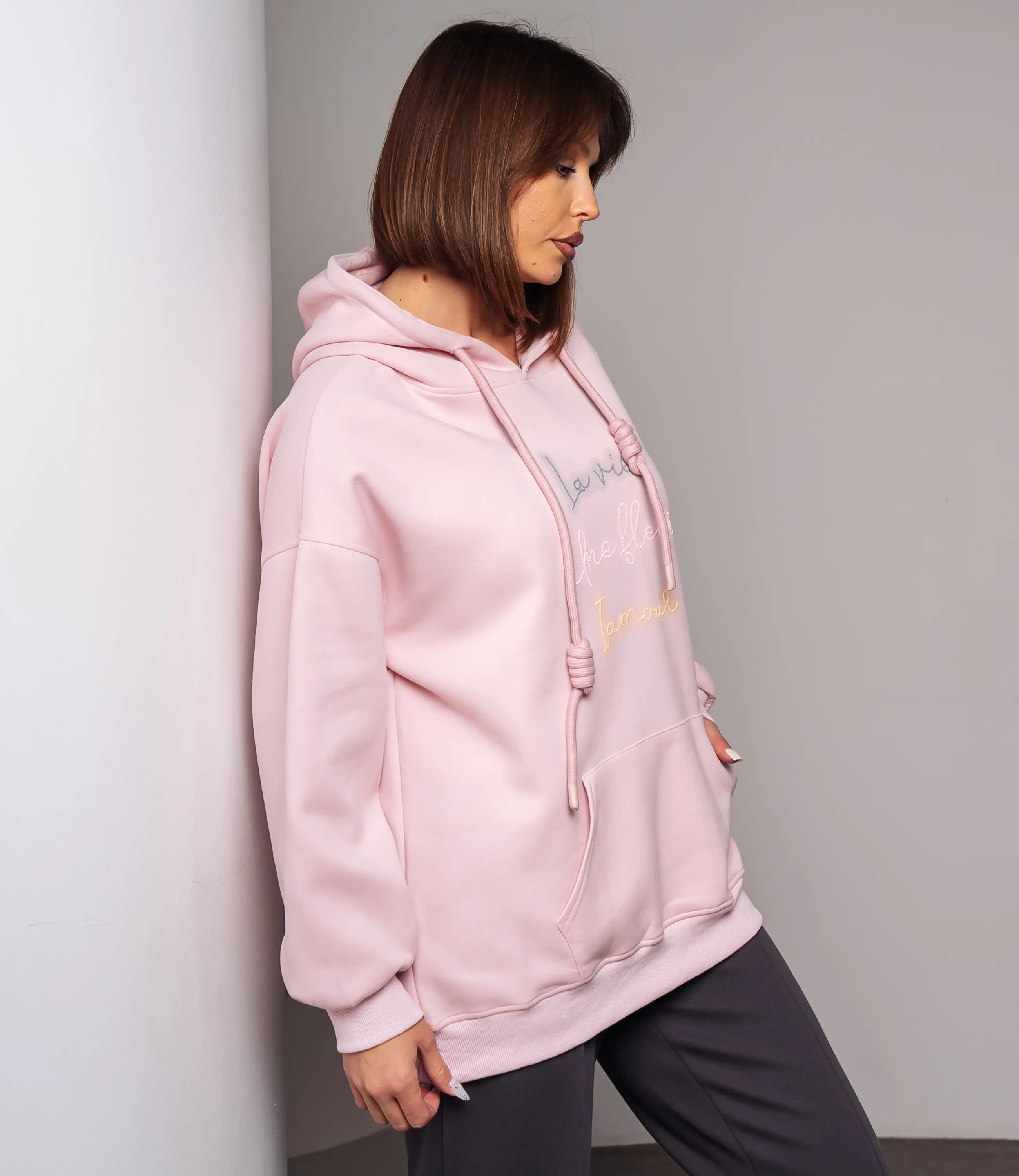 Худи – это одежда, которая подчеркивает уникальность каждой женщины. Худи выполнено из мягкого, средней плотности трикотажа с равномерной, слегка структурированной поверхностью, прямого свободного кроя с подчёркнуто расслабленными пропорциями; модель имеет объёмный капюшон с двумя круглыми шнурами-фитилями, каждый из которых затянут узлом на уровне средней длины, шнуры проходят через резинку или люверсы в кулиске горловины; линия плеча опущенная, рукава широкие, заканчиваются узкими резинками-манжетами, создающими лёгкое сборение у запястий; передняя часть украшена крупным накладным карманом-кенгуру с горизонтальными входами по бокам, низ изделия также обработан широкой резинкой, обеспечивающей аккуратный контур и лёгкую фиксацию на бедрах; на груди декоративная вышивка в виде трёх строк рукописного шрифта, выполненная плоской ниткой. Для пошива использована ткань 100% хлопок, которая характеризуется отличным качеством. Даже после многих стирок изделие не утратит первоначальной привлекательности. Вы сможете носить его с радостью. Обратите внимание на цвет и надпись, они являются стильными и полностью соответствуют фотографии на сайте. Чтобы вы были уверены в размере, мы представили на странице таблицу. Воспользовавшись ею, вы сможете сами обмерить себя и удостовериться. Предложенная нами цена является приемлемой. Не откажите себе в удовольствии быть неотразимой!