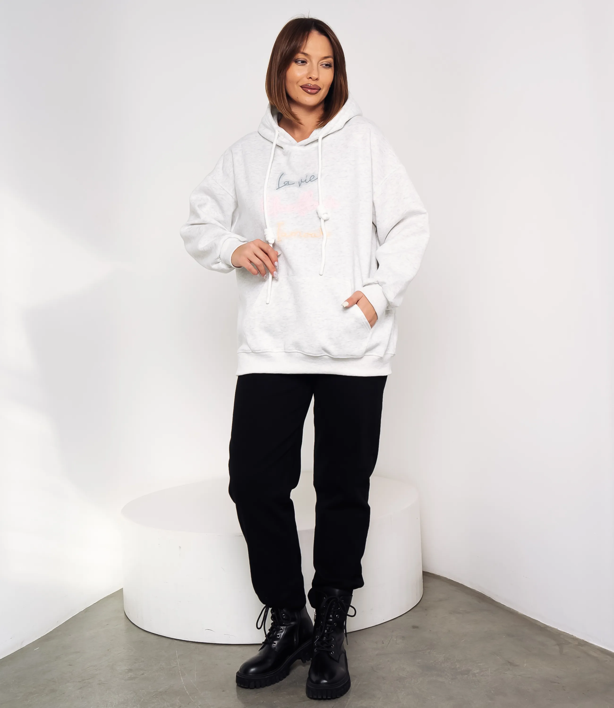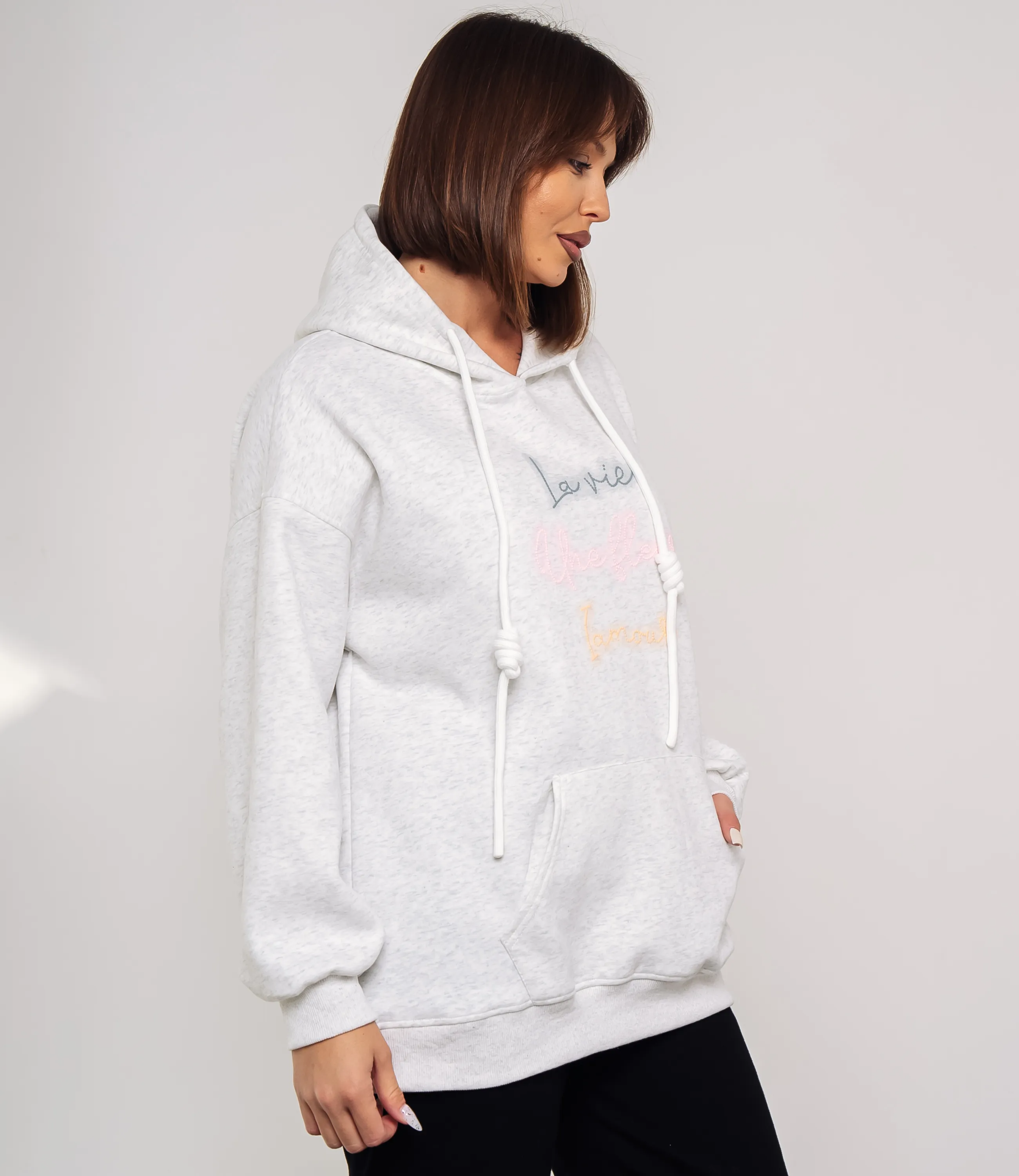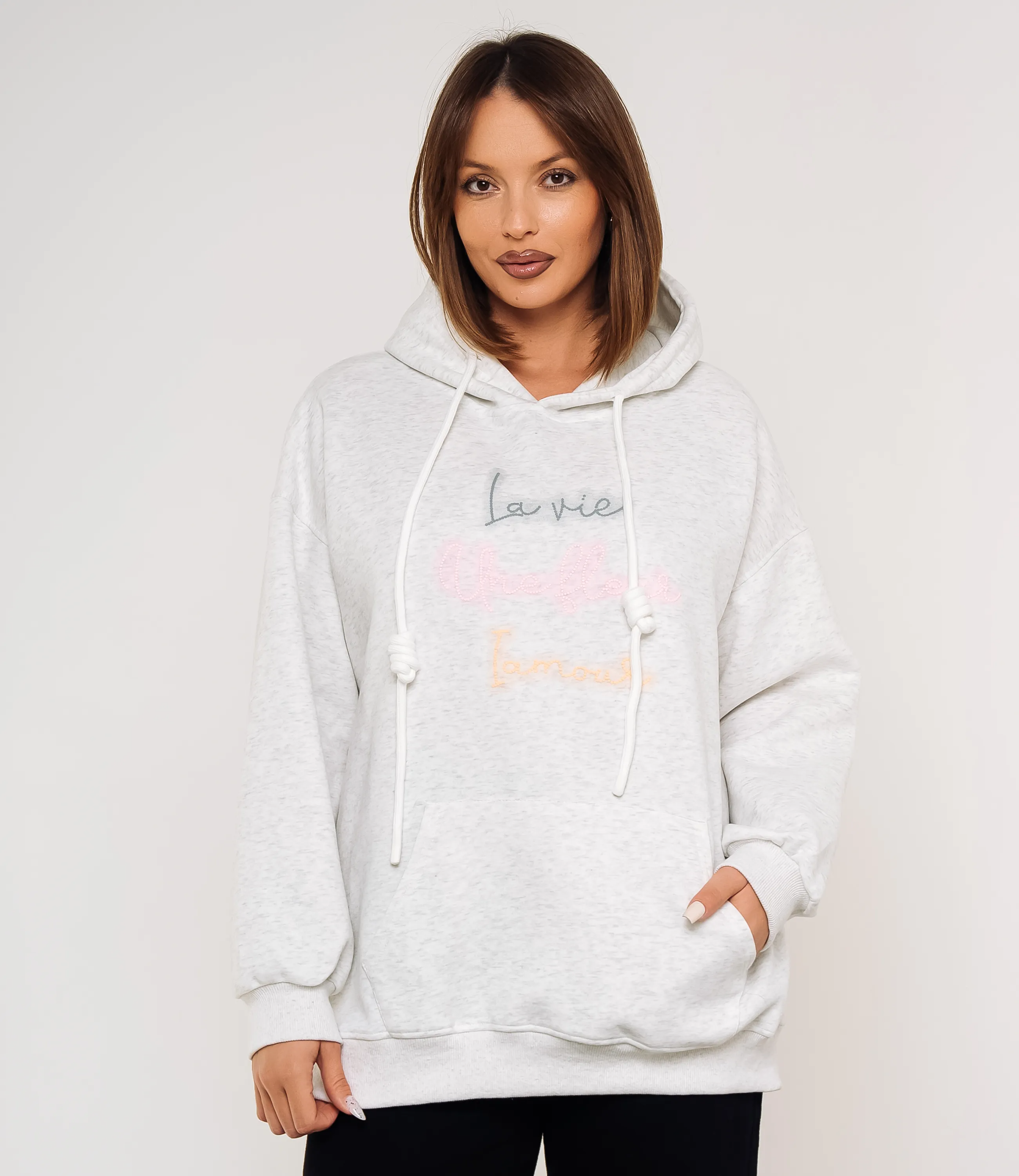 Худи – это одежда, которая подчеркивает уникальность каждой женщины. Худи выполнено из мягкого, средней плотности трикотажа с равномерной, слегка структурированной поверхностью, прямого свободного кроя с подчёркнуто расслабленными пропорциями; модель имеет объёмный капюшон с двумя круглыми шнурами-фитилями, каждый из которых затянут узлом на уровне средней длины, шнуры проходят через резинку или люверсы в кулиске горловины; линия плеча опущенная, рукава широкие, заканчиваются узкими резинками-манжетами, создающими лёгкое сборение у запястий; передняя часть украшена крупным накладным карманом-кенгуру с горизонтальными входами по бокам, низ изделия также обработан широкой резинкой, обеспечивающей аккуратный контур и лёгкую фиксацию на бедрах; на груди декоративная вышивка в виде трёх строк рукописного шрифта, выполненная плоской ниткой. Для пошива использована ткань 100% хлопок, которая характеризуется отличным качеством. Даже после многих стирок изделие не утратит первоначальной привлекательности. Вы сможете носить его с радостью. Обратите внимание на цвет и надпись, они являются стильными и полностью соответствуют фотографии на сайте. Чтобы вы были уверены в размере, мы представили на странице таблицу. Воспользовавшись ею, вы сможете сами обмерить себя и удостовериться. Предложенная нами цена является приемлемой. Не откажите себе в удовольствии быть неотразимой!