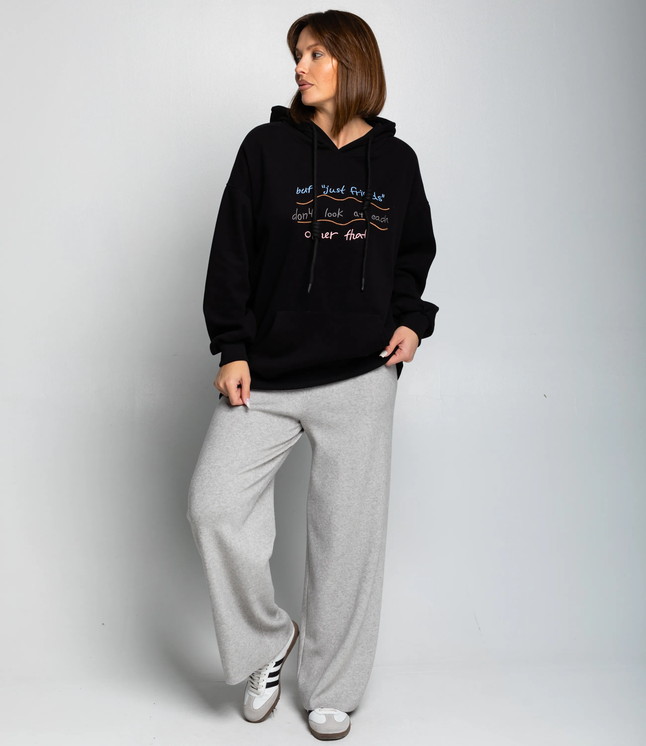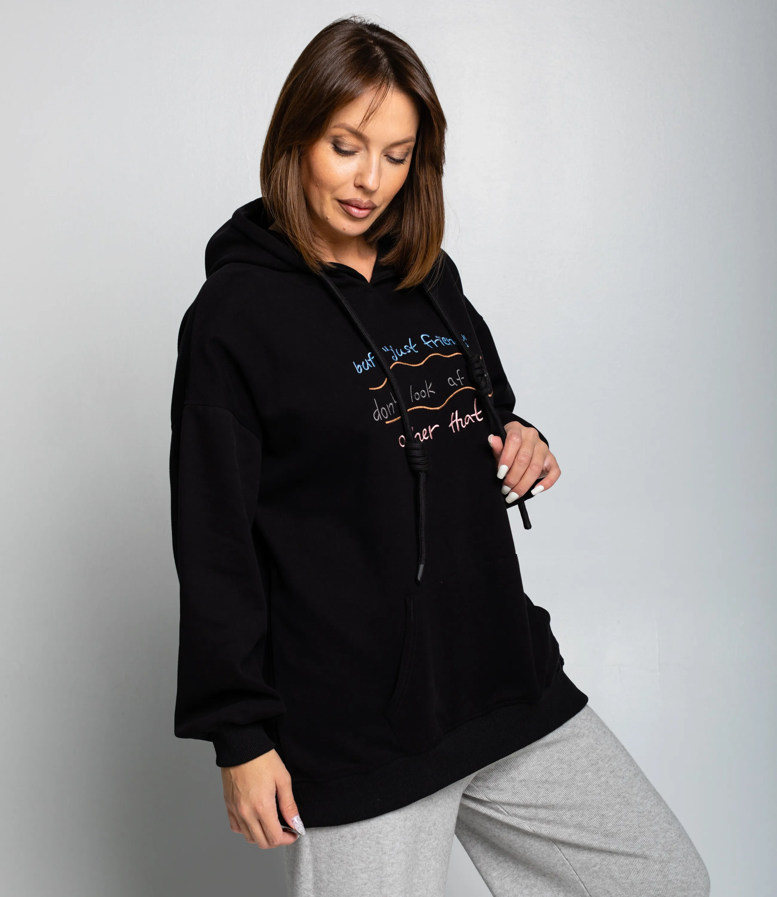 Худи – это одежда, которая подчеркивает уникальность каждой женщины. Худи выполнено в свободном, слегка оверсайз крое с опущенной линией плеч. Модель с капюшоном на двойных шнурках, которые заканчиваются узлами, и с английской вышивкой или принтом в области груди, состоящим из нескольких строк рукописного стиля. Спереди располагается карман-кенгуру с боковыми входами, низ и манжеты рукавов оформлены широкими резинками для плотной посадки. Горловина аккуратно соединена с капюшоном швом под углом, швы ровные, конструкция цельная и минималистичная. Для пошива использована ткань 100% хлопок, которая характеризуется отличным качеством. Даже после многих стирок изделие не утратит первоначальной привлекательности. Вы сможете носить его с радостью. Обратите внимание на цвет и надпись, они являются стильными и полностью соответствуют фотографии на сайте. Чтобы вы были уверены в размере, мы представили на странице таблицу. Воспользовавшись ею, вы сможете сами обмерить себя и удостовериться. Предложенная нами цена является приемлемой. Не откажите себе в удовольствии быть неотразимой!