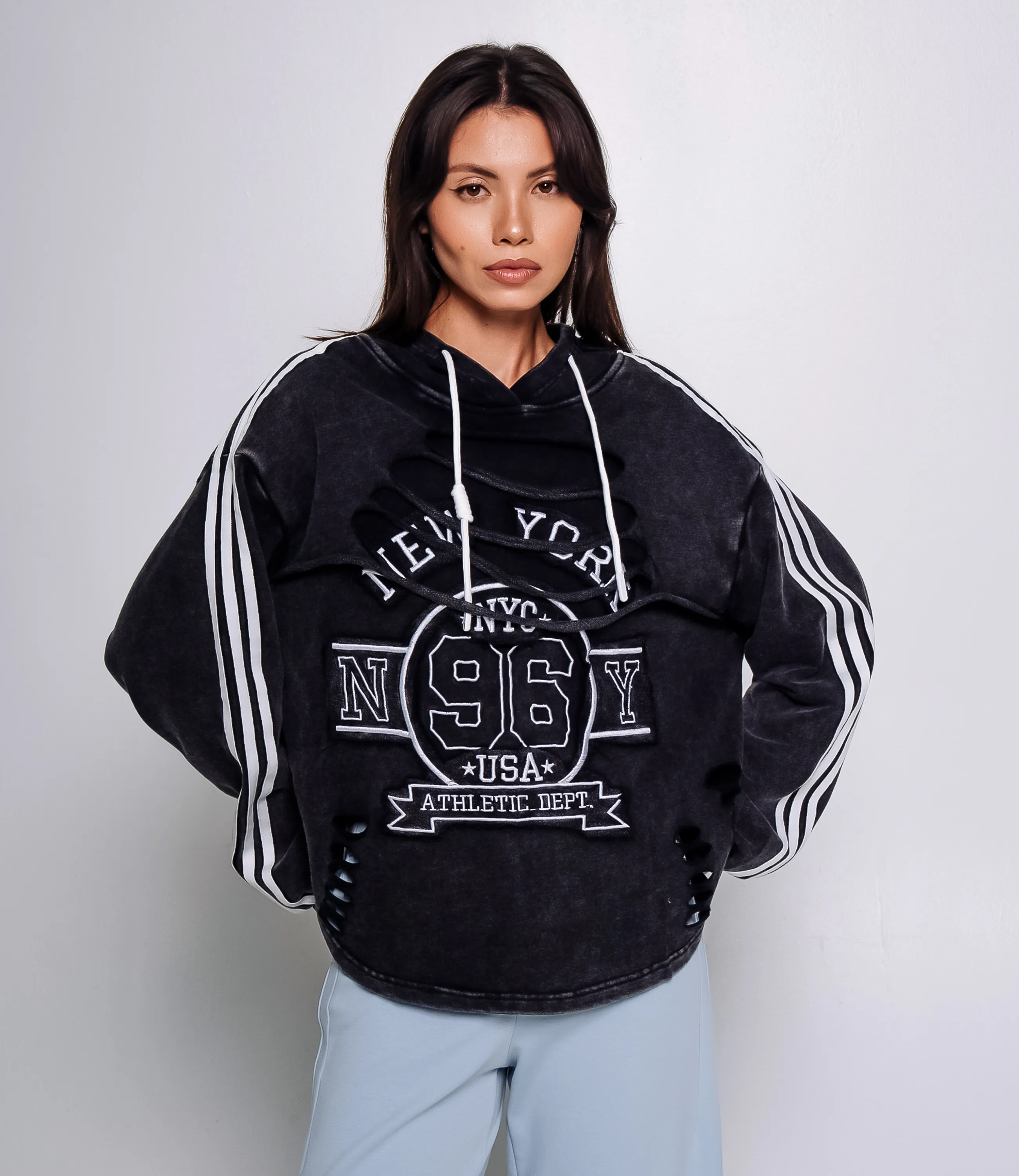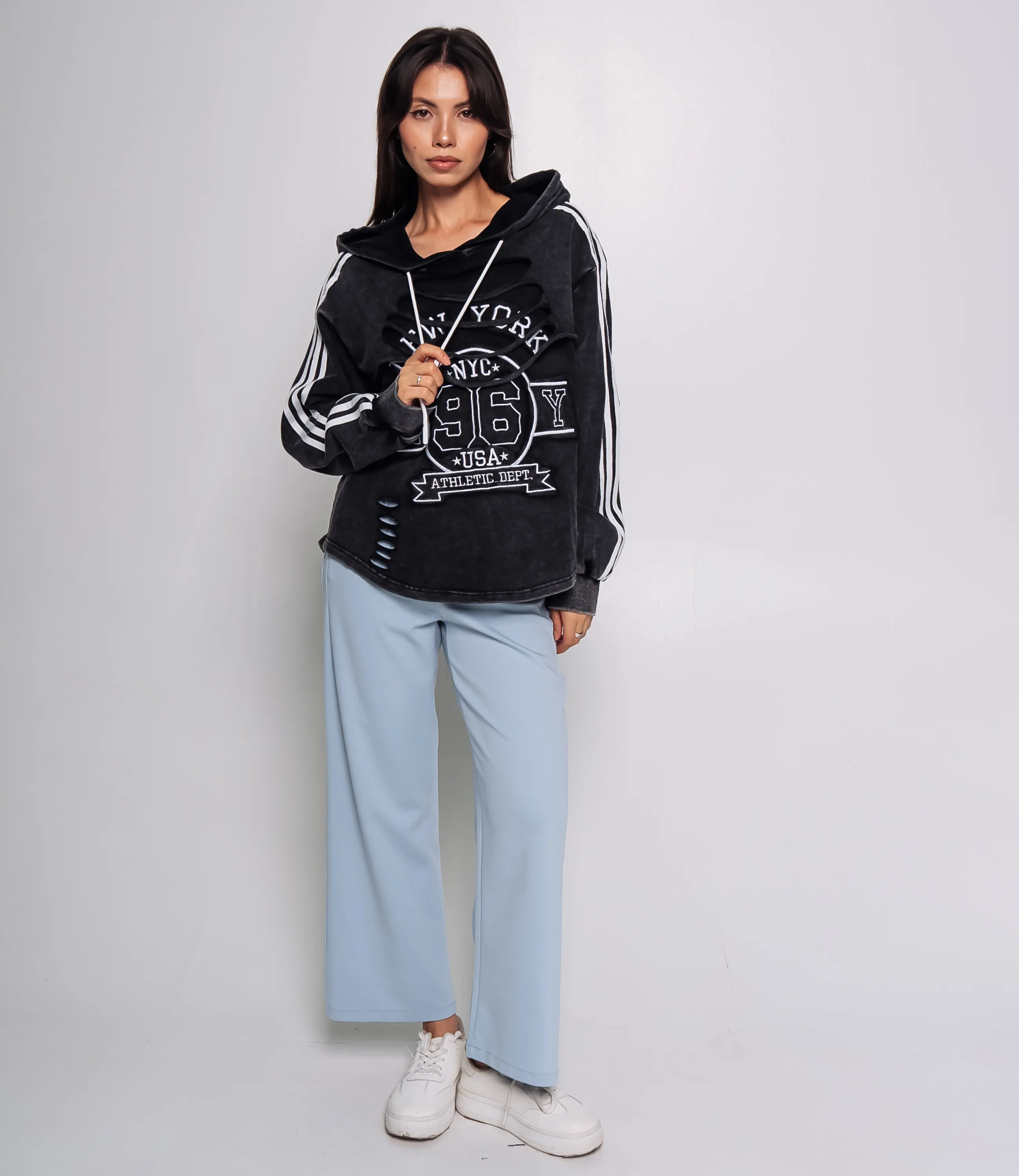 Худи – это уютная одежда, которая подчеркивает женственность каждой девушки.свободного кроя худи с капюшоном и белыми шнурками, выполненная из плотного мягкого трикотажа. Модель имеет удлинённые рукава с три белые контрастные полоски по внешней стороне каждой руки и широкие манжеты в рубчик; низ свитшота слегка закруглён и заканчивается под линией талии, с небольшими декоративными разрезами справа. На передней части крупный принт в спортивном стиле с буквенно‑числовыми элементами и нашивками, часть передней панели искусственно деформирована — полосы срезов и прорези создают эффект потертости и «рваной» отделки. Для изготовления использована ткань 90% хлопок, 10% спандекс, которая отличается отличным качеством и долговечностью. Даже после множества стирок изделие не потеряет своей первоначальной привлекательности. Вы будете носить его с большим удовольствием и ощущать себя комфортно. Обратите внимание на цвет – он насыщенный и полностью соответствует фотографии на сайте. Чтобы вы были уверены в размере, мы представили на странице таблицу. Воспользовавшись ею, вы сможете самостоятельно обмерить себя и удостовериться в правильности выбора. Установленная нами цена является приемлемой. Не откажите себе в удовольствии выглядеть стильно и уютно! Рост модели 164 см., 83-61-89.