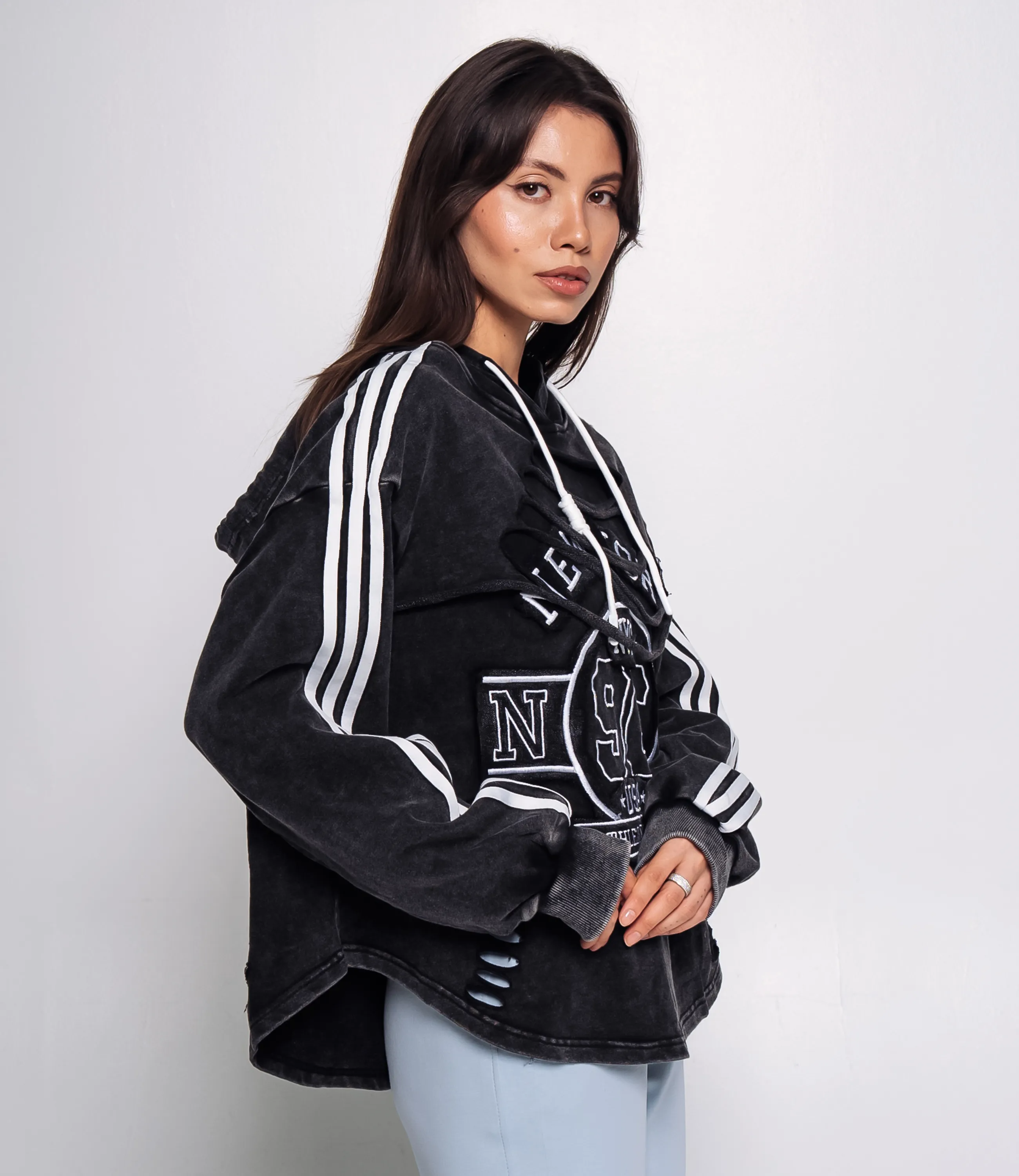 Худи – это уютная одежда, которая подчеркивает женственность каждой девушки.свободного кроя худи с капюшоном и белыми шнурками, выполненная из плотного мягкого трикотажа. Модель имеет удлинённые рукава с три белые контрастные полоски по внешней стороне каждой руки и широкие манжеты в рубчик; низ свитшота слегка закруглён и заканчивается под линией талии, с небольшими декоративными разрезами справа. На передней части крупный принт в спортивном стиле с буквенно‑числовыми элементами и нашивками, часть передней панели искусственно деформирована — полосы срезов и прорези создают эффект потертости и «рваной» отделки. Для изготовления использована ткань 90% хлопок, 10% спандекс, которая отличается отличным качеством и долговечностью. Даже после множества стирок изделие не потеряет своей первоначальной привлекательности. Вы будете носить его с большим удовольствием и ощущать себя комфортно. Обратите внимание на цвет – он насыщенный и полностью соответствует фотографии на сайте. Чтобы вы были уверены в размере, мы представили на странице таблицу. Воспользовавшись ею, вы сможете самостоятельно обмерить себя и удостовериться в правильности выбора. Установленная нами цена является приемлемой. Не откажите себе в удовольствии выглядеть стильно и уютно! Рост модели 164 см., 83-61-89.