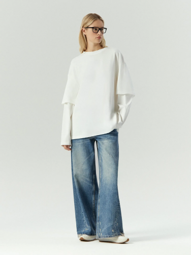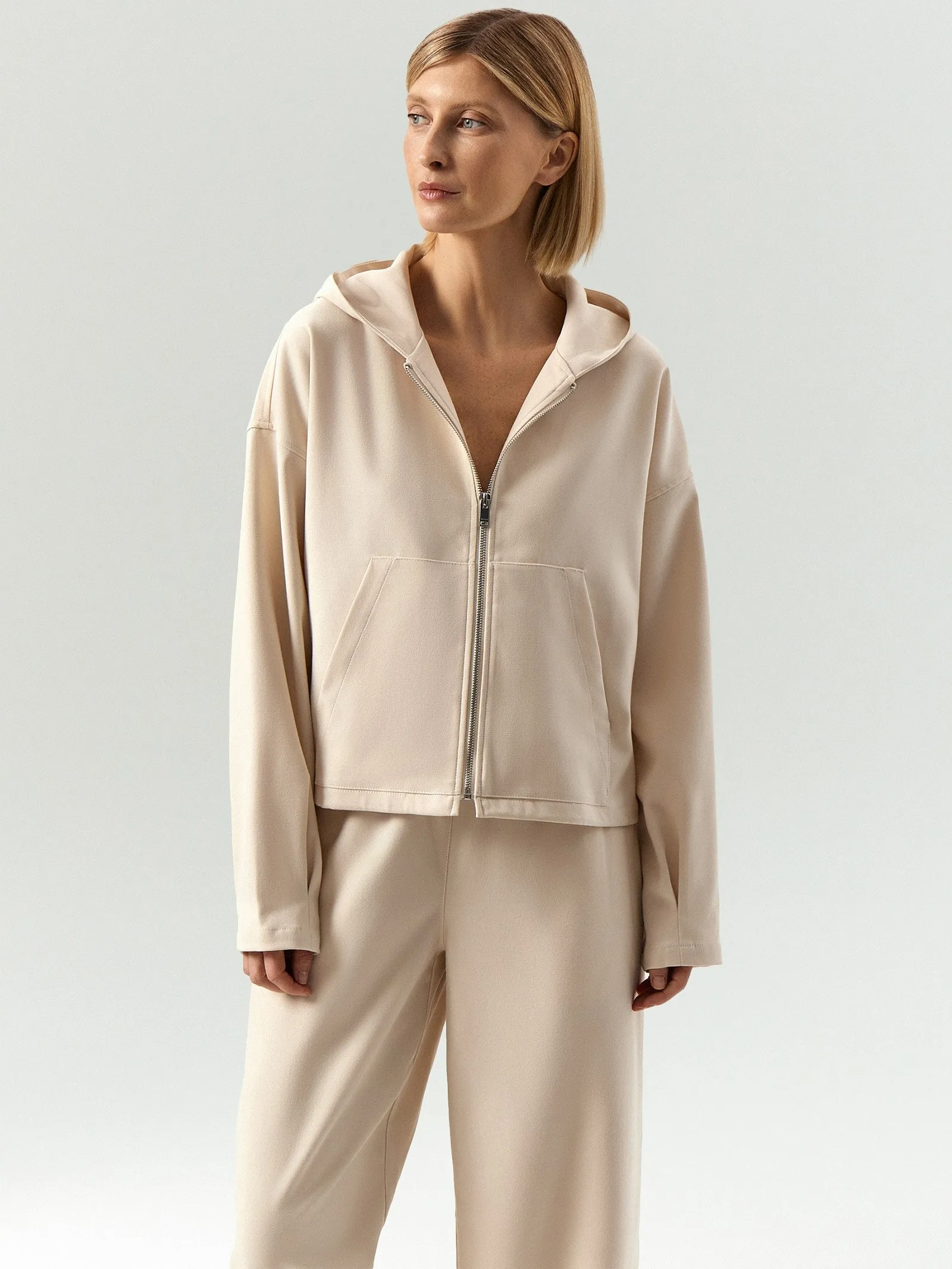 Худи на молнии из приятного фактурного материала в молочном цвете. По бокам предусмотрены кулиски: куртку можно укоротить под свои параметры, что делает её подходящей на рост 164 см. и меньше. Рукава с защипом можно красиво подвернуть. Модель дополнена вместительными карманами спереди. Завершить образ с худи можно брюками из комплекта.