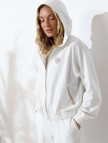 Худи белого цвета на молнии выполнено из премиального футера двухнитки плотностью 240 Г/м2. Натуральный состав обеспечивает хорошую воздухопроницаемость, мягкость и приятные тактильные ощущения, Эластичный материал зип-худи позволяет свободно двигаться без лишнего стеснения, а также отлично сохраняет форму даже после длительного ношения. Манжеты на рукавах и резинка по низу обеспечивают надежную посадку, сохраняя тепло в прохладную погоду. Зипка на молнии отличается универсальной длиной, которая идеально подходит для повседневного и спортивного образа. Капюшон добавляет уюта, а прорезные карманы по бокам добавляют функциональности, сохраняя при этом стильный внешний вид. На груди расположена аккуратная нашивка в виде логотипа бренда. Представленная размерная линейка позволяет подобрать оптимальный вариант для любой фигуры и размера, на маленький или плюс сайз, обеспечивая идеальную посадку без компромиссов по стилю. Эта толстовка из футера станет отличным дополнением к базовому гардеробу, сочетая практичность с элегантностью.