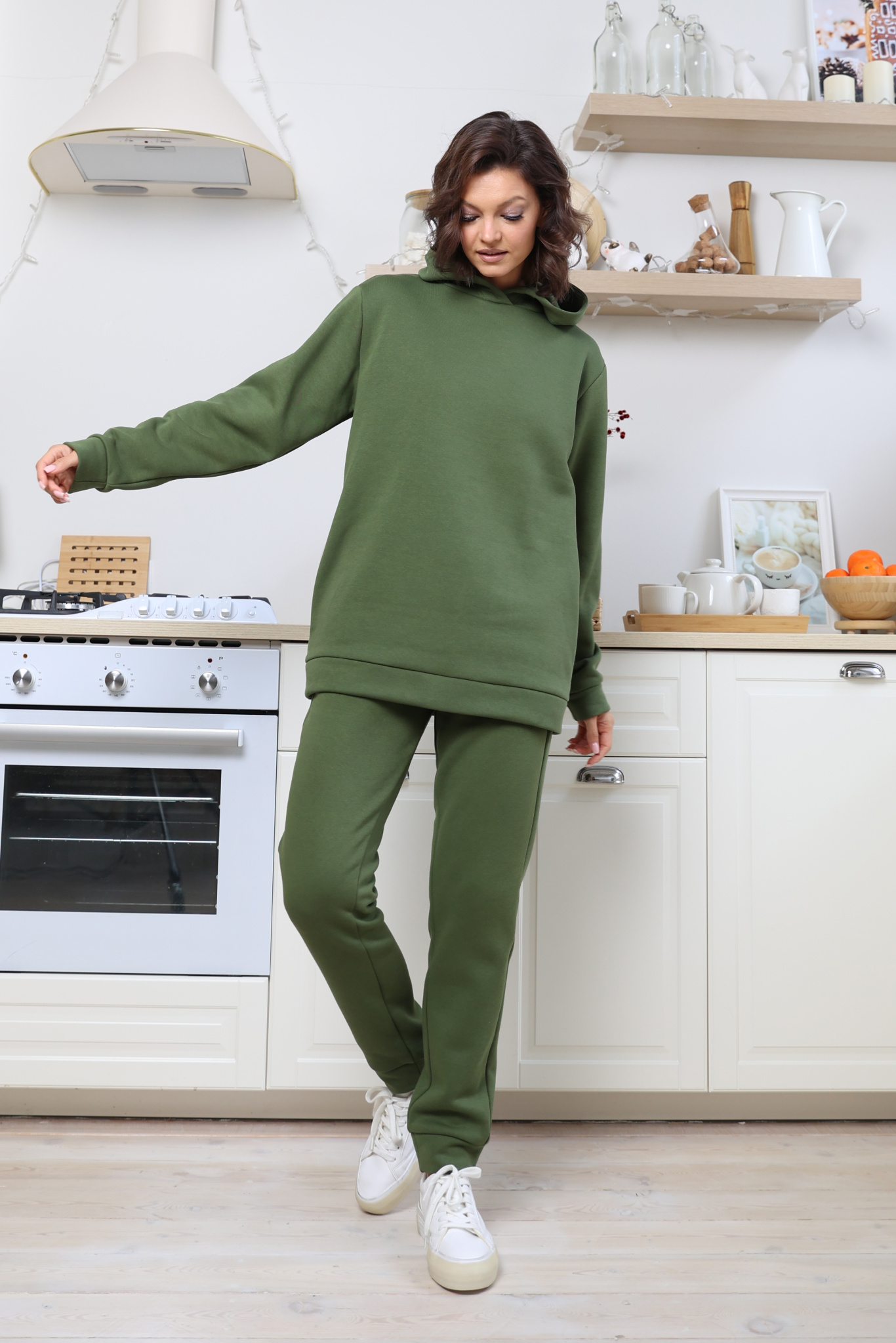 Худи из трикотажа с капюшоном и карманами. Манжеты на рукавах, притачной пояс - из основной ткани.